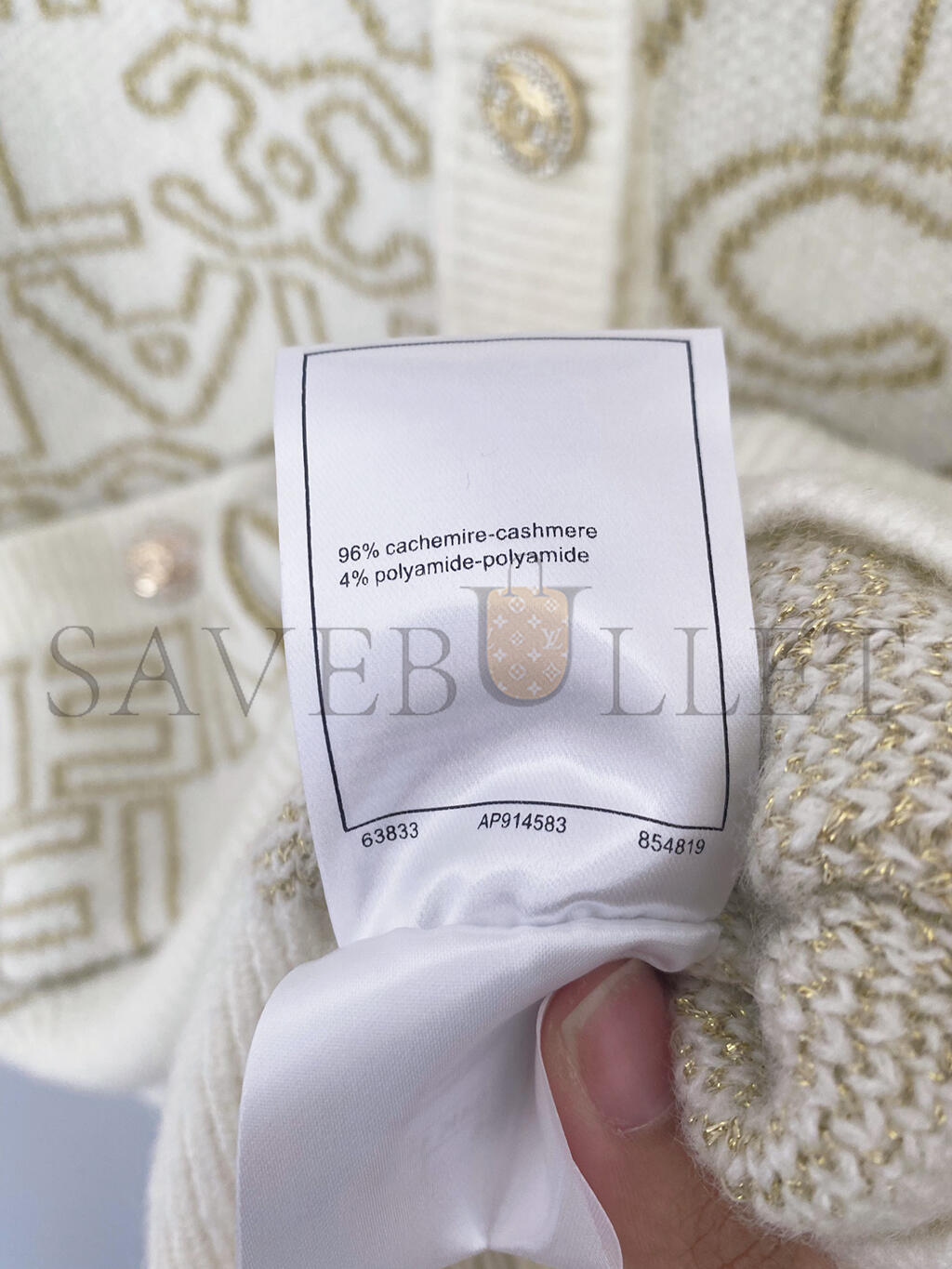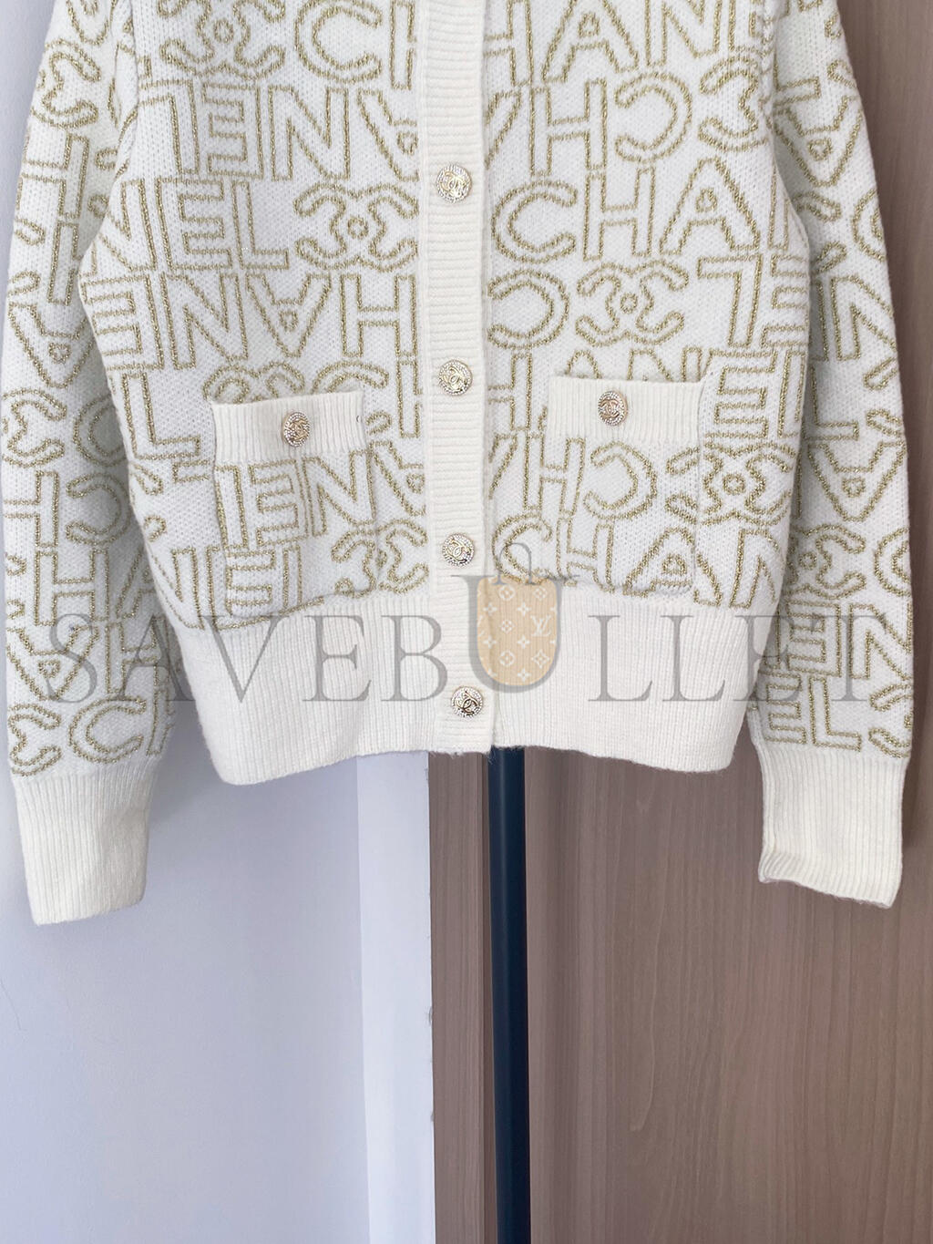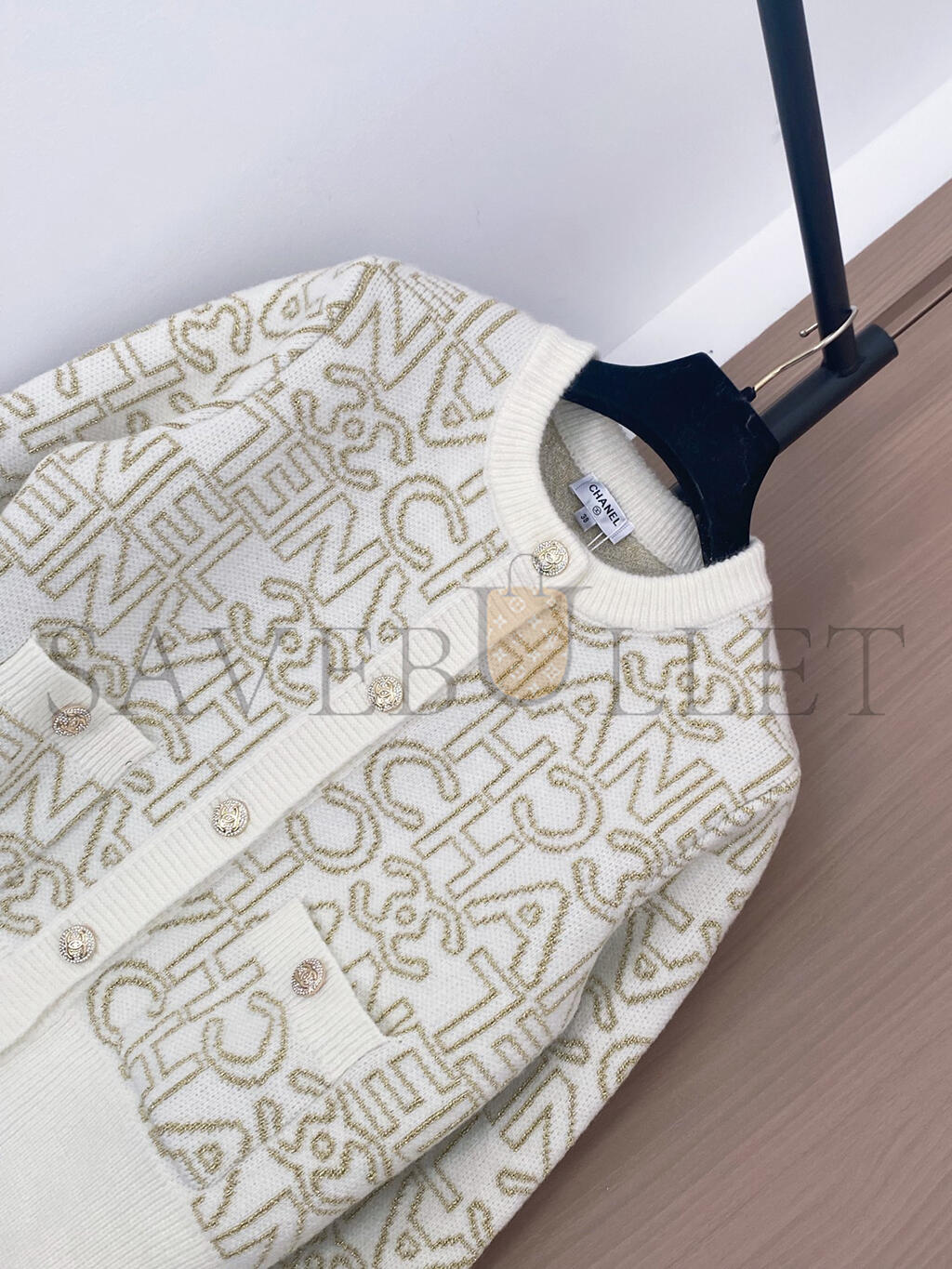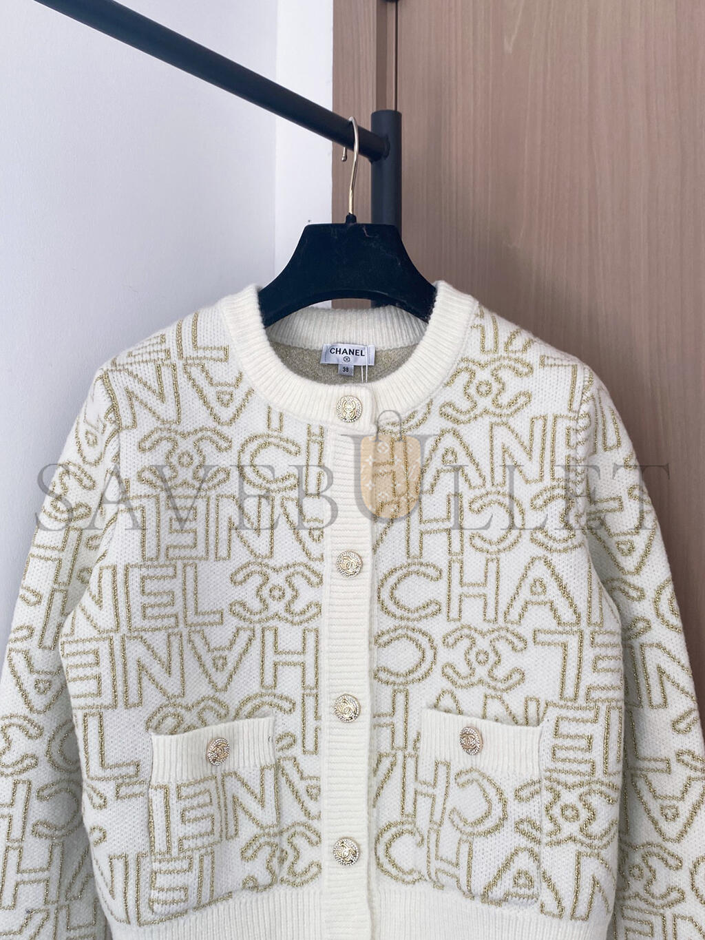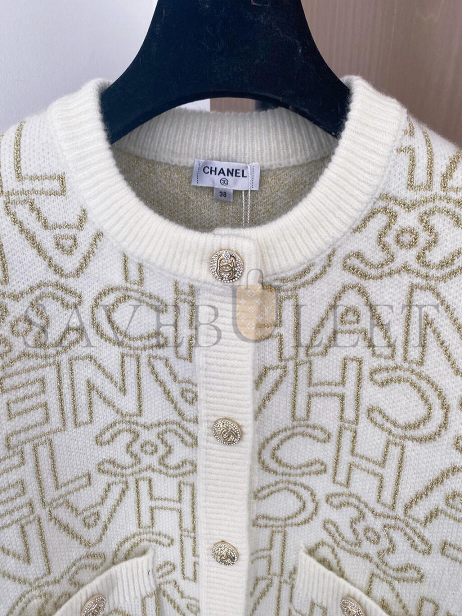 CHANEL LETTER JACQUARD CREW NECK KNIT CARDIGAN