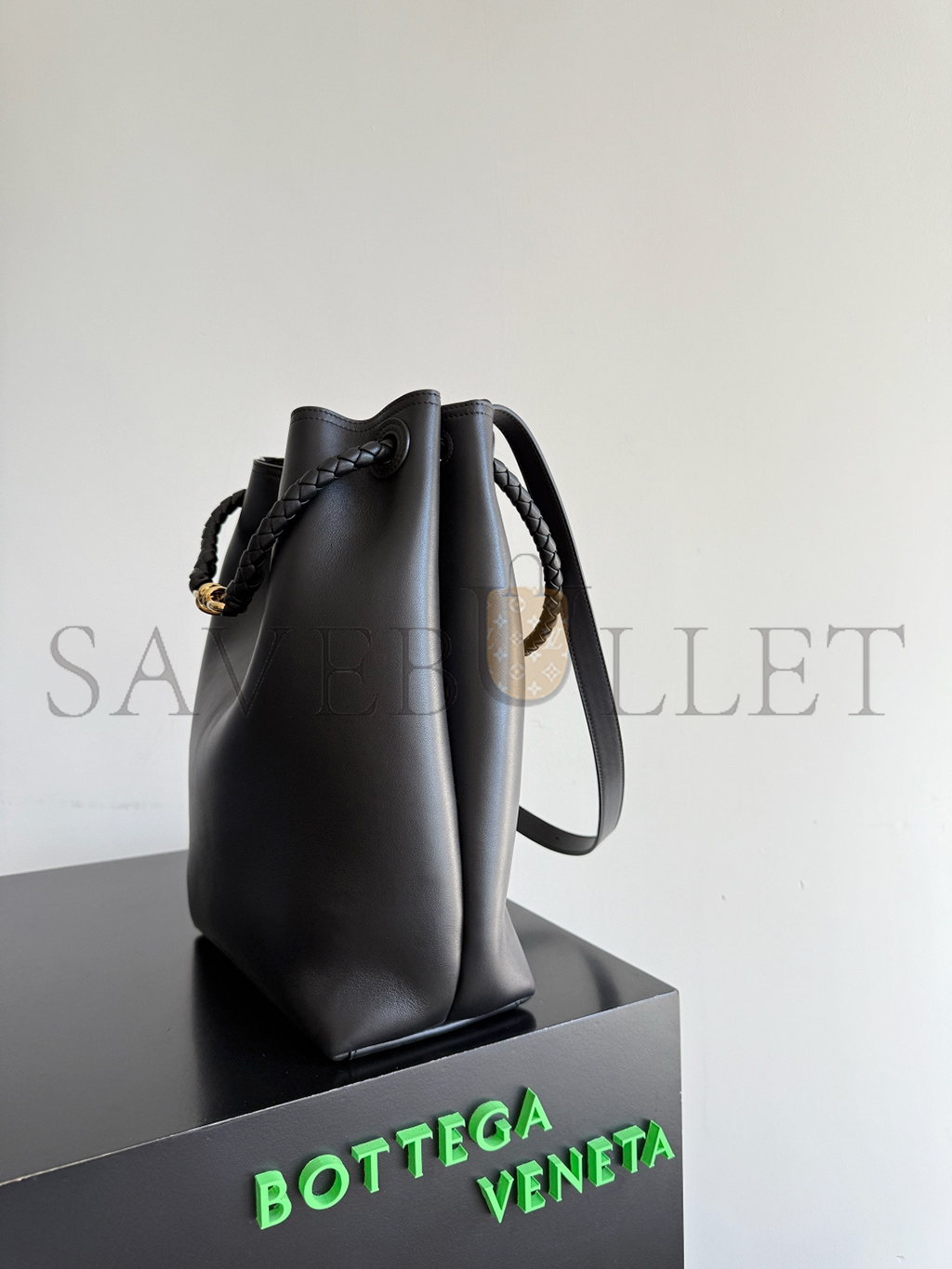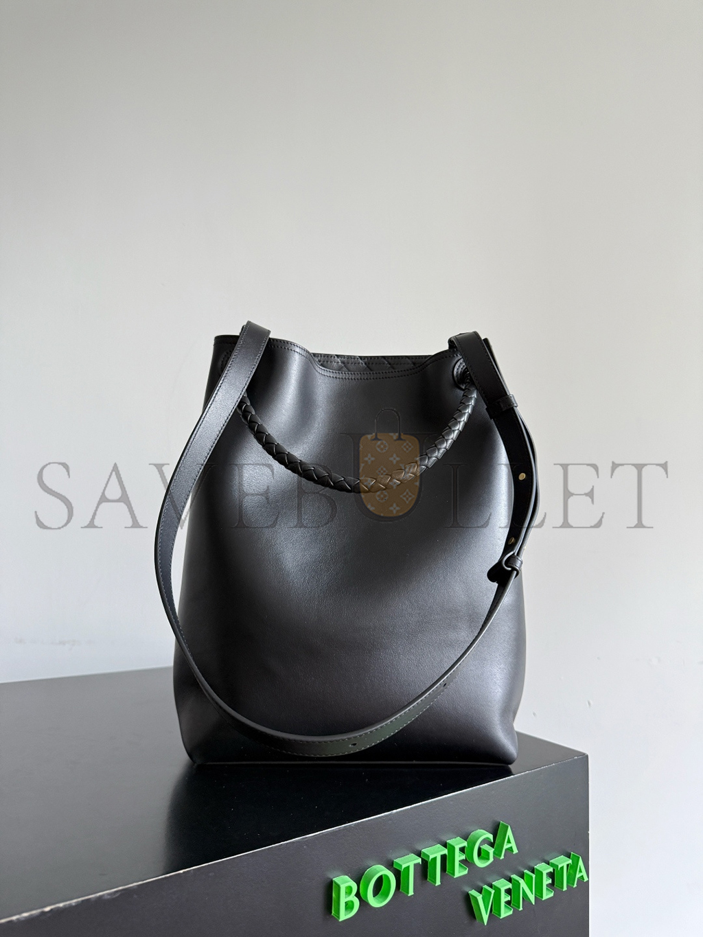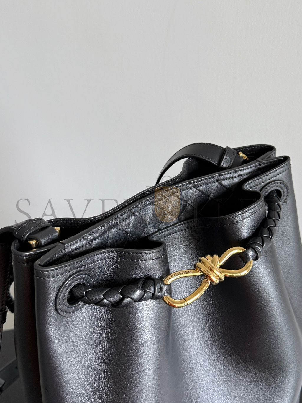 Silky calfskin bucket bag with sliding shoulder strap