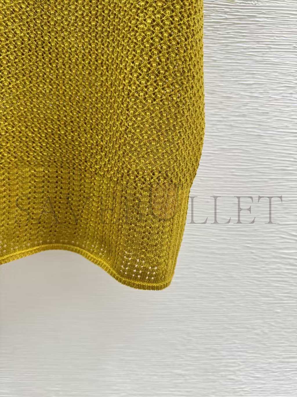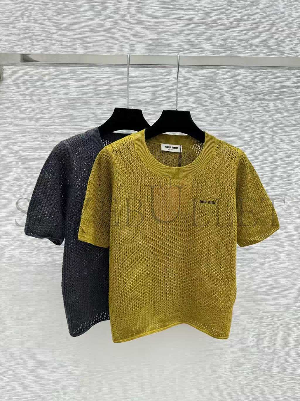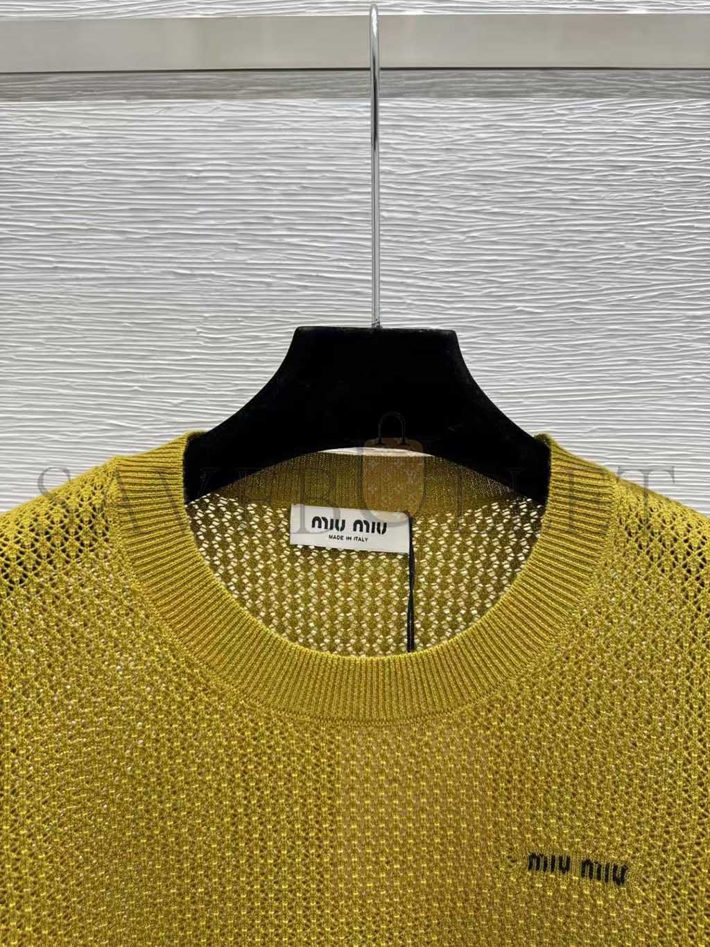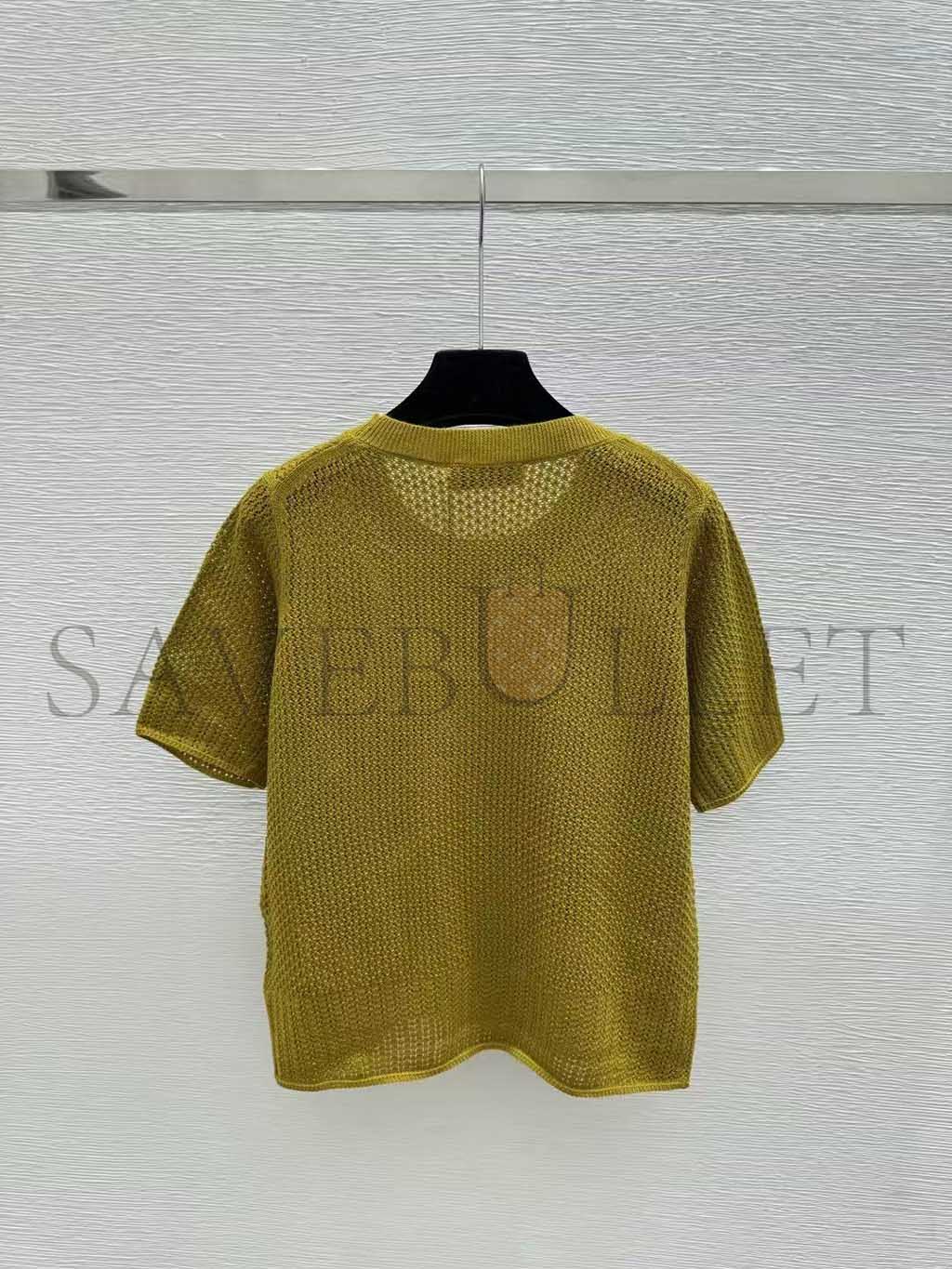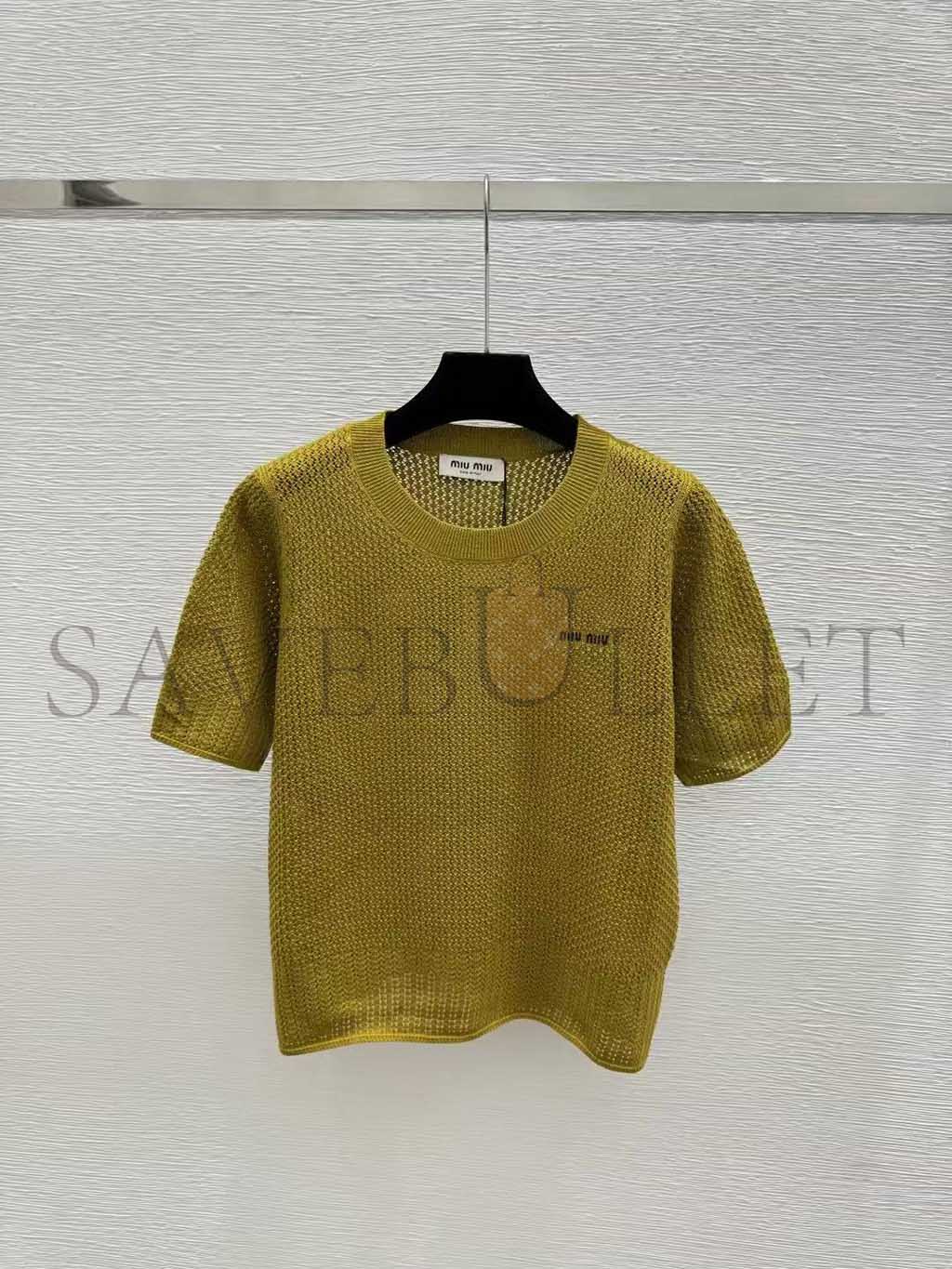 MIU MIU OLIVE GREEN OPENWORK SHORT-SLEEVED KNIT SWEATER