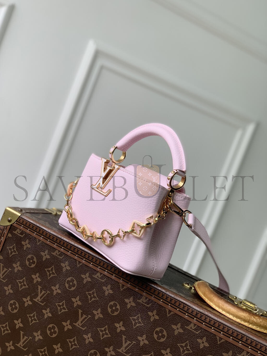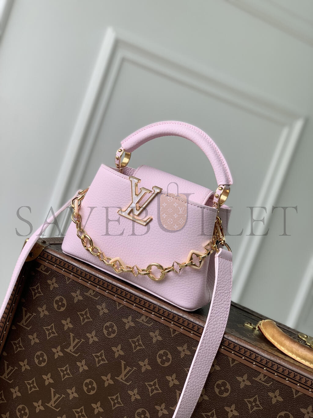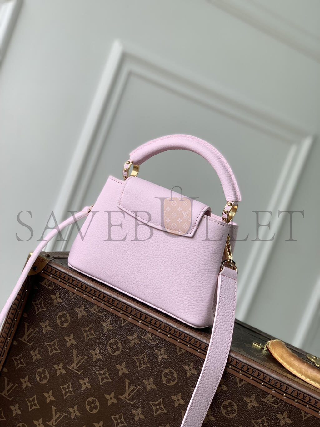 It can hold a 6.1-inch smartphone, a Capucines short wallet, and keys.
