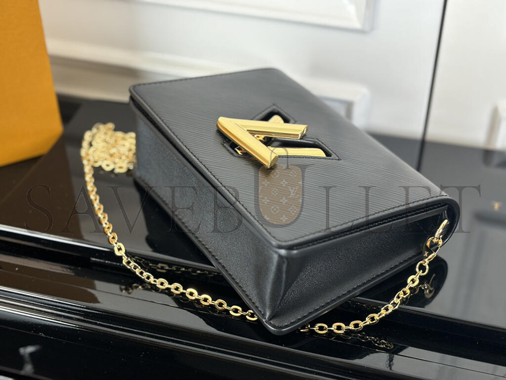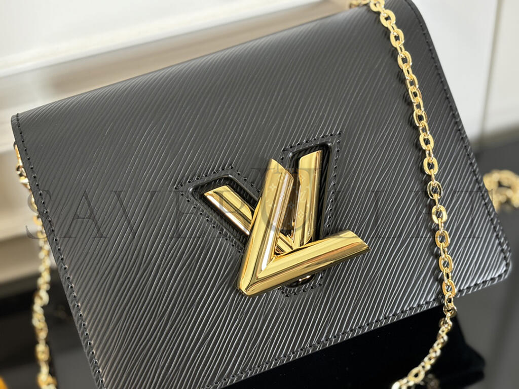 The Twist belt chain pouch is crafted from black Epi leather, complemented by gold-tone hardware. This modern design can be carried as a clutch, on the shoulder, or - thanks to a loop at the back - on a belt. It holds essentials including a smartphone and closes securely with a turn of the LV Twist lock.
