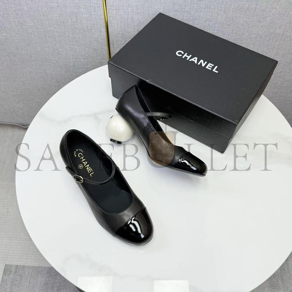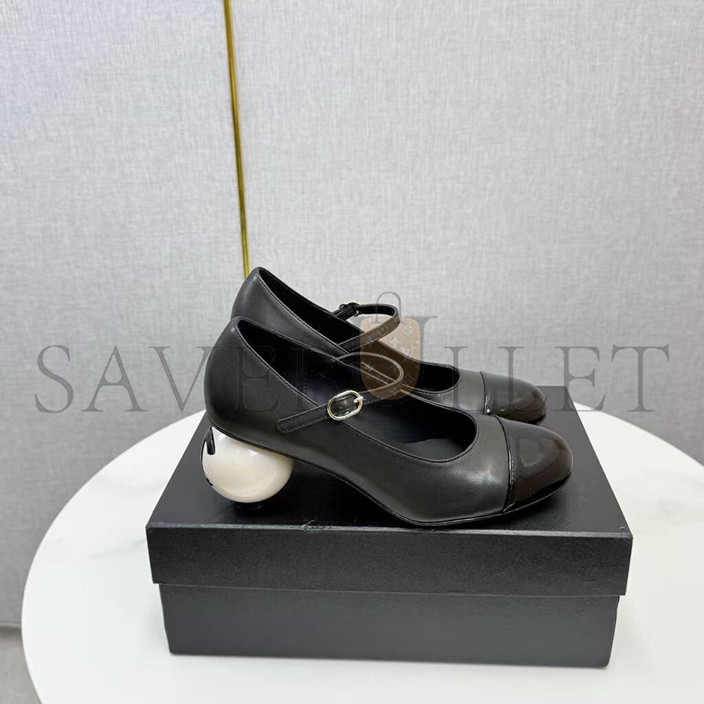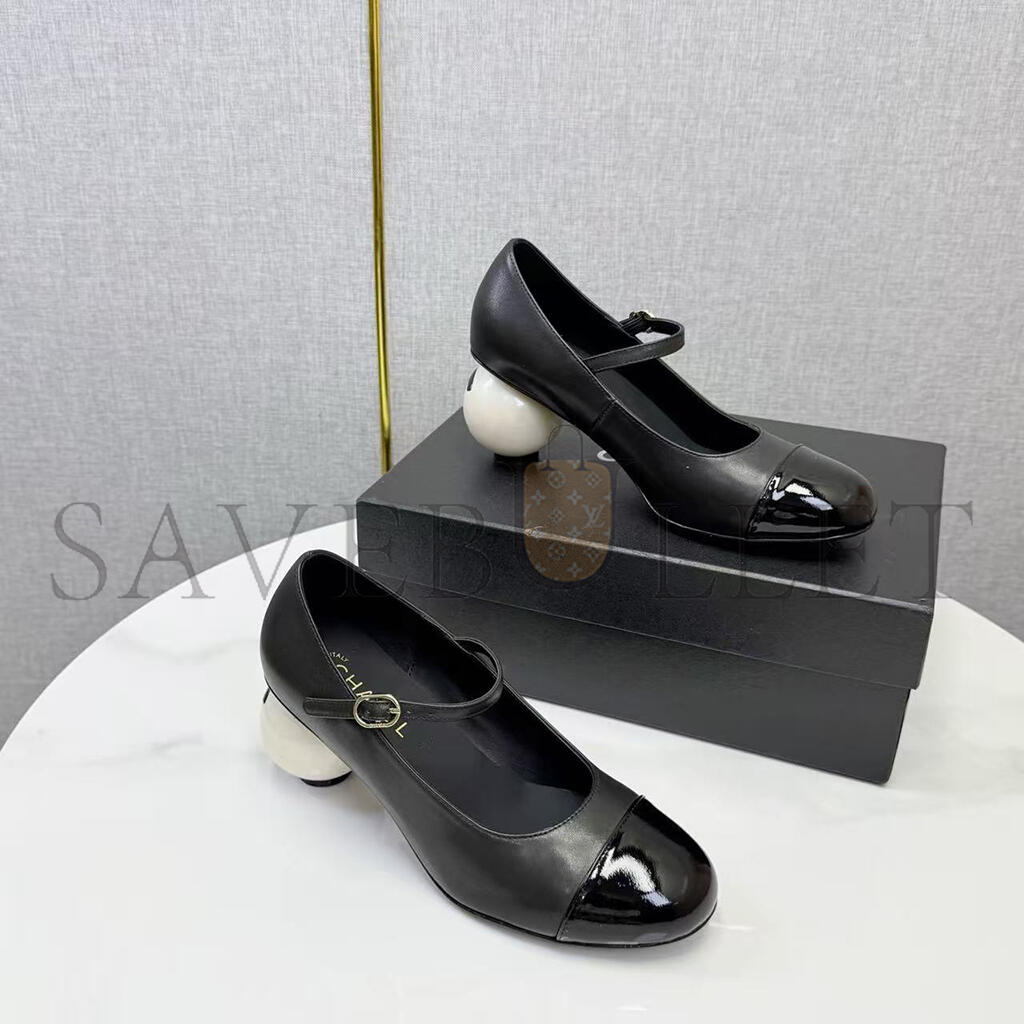 CHANEL MARY JANES LAMBSKIN, PATENT CALFSKIN & IMITATION PEARLS G46775