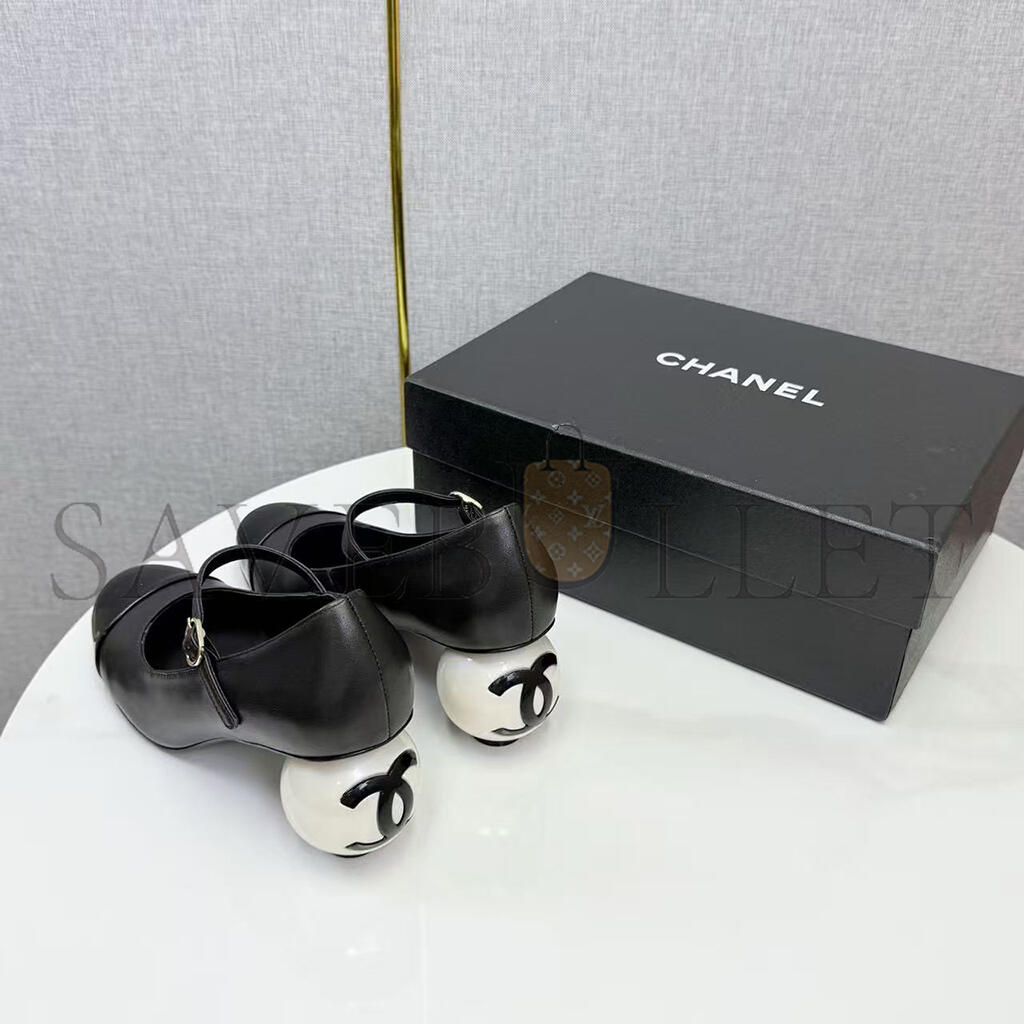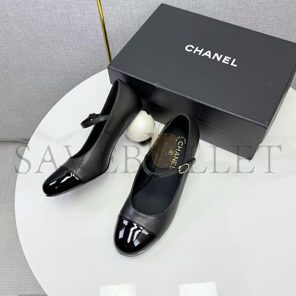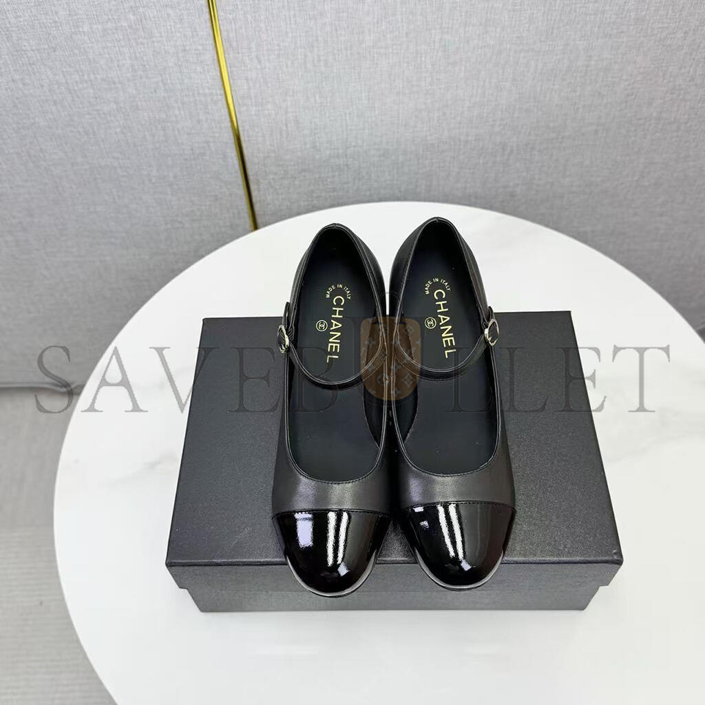 CHANEL MARY JANES LAMBSKIN, PATENT CALFSKIN & IMITATION PEARLS G46775