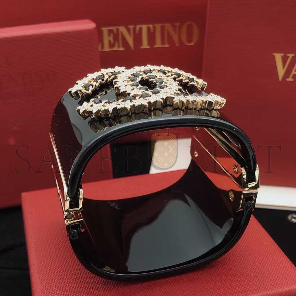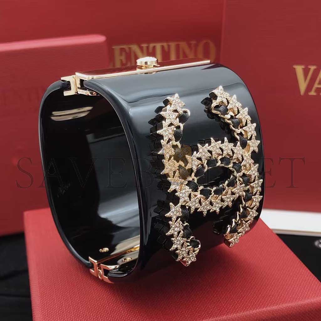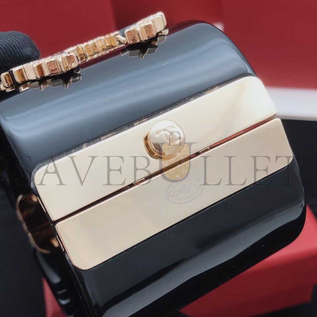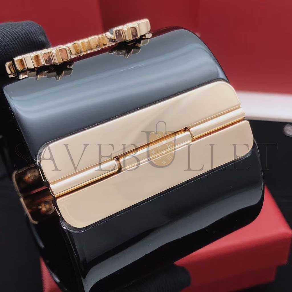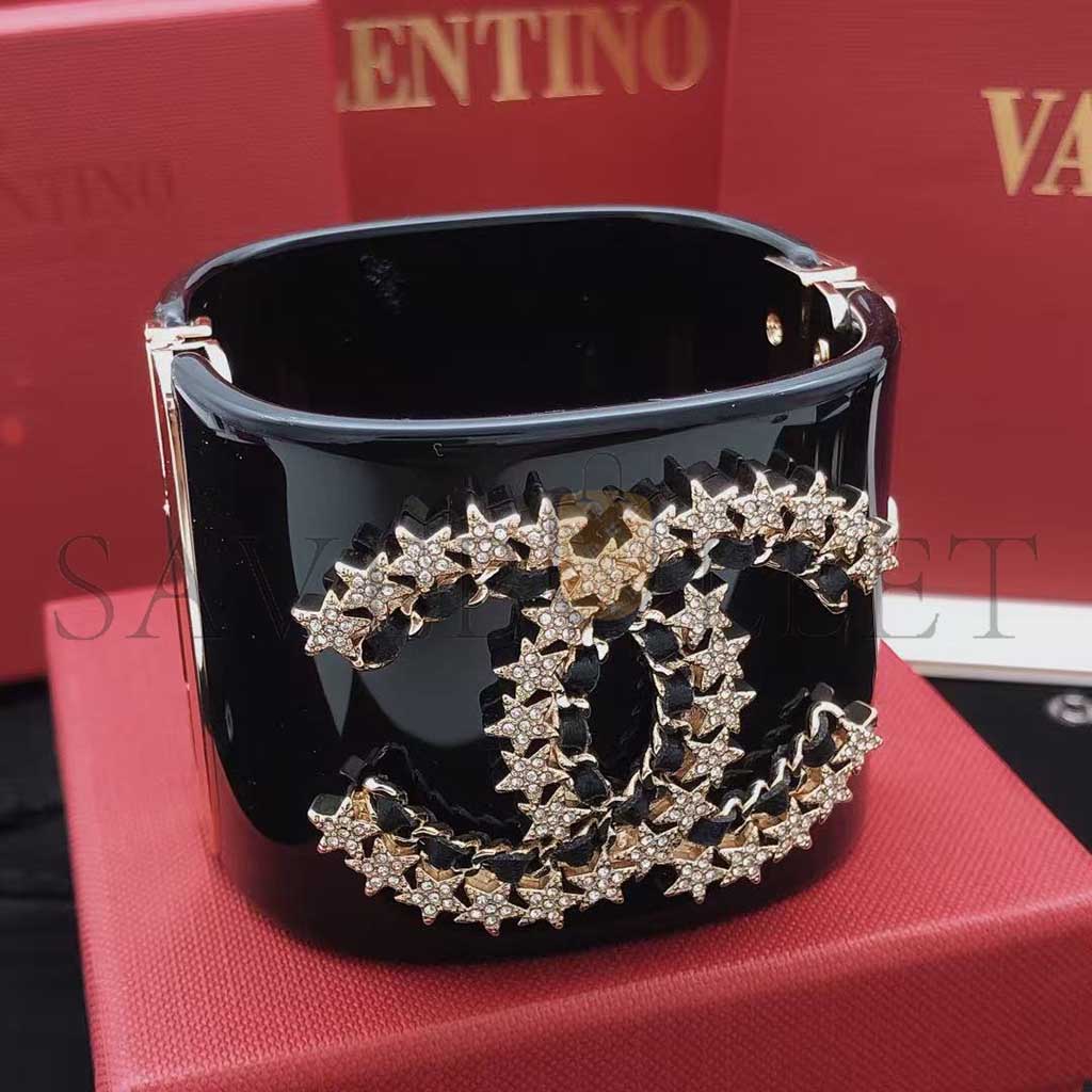 The bracelet is a wide cuff style that offers strength and durability. The hardware displays a beautiful champagne-colour with a CC logo fold over closure.