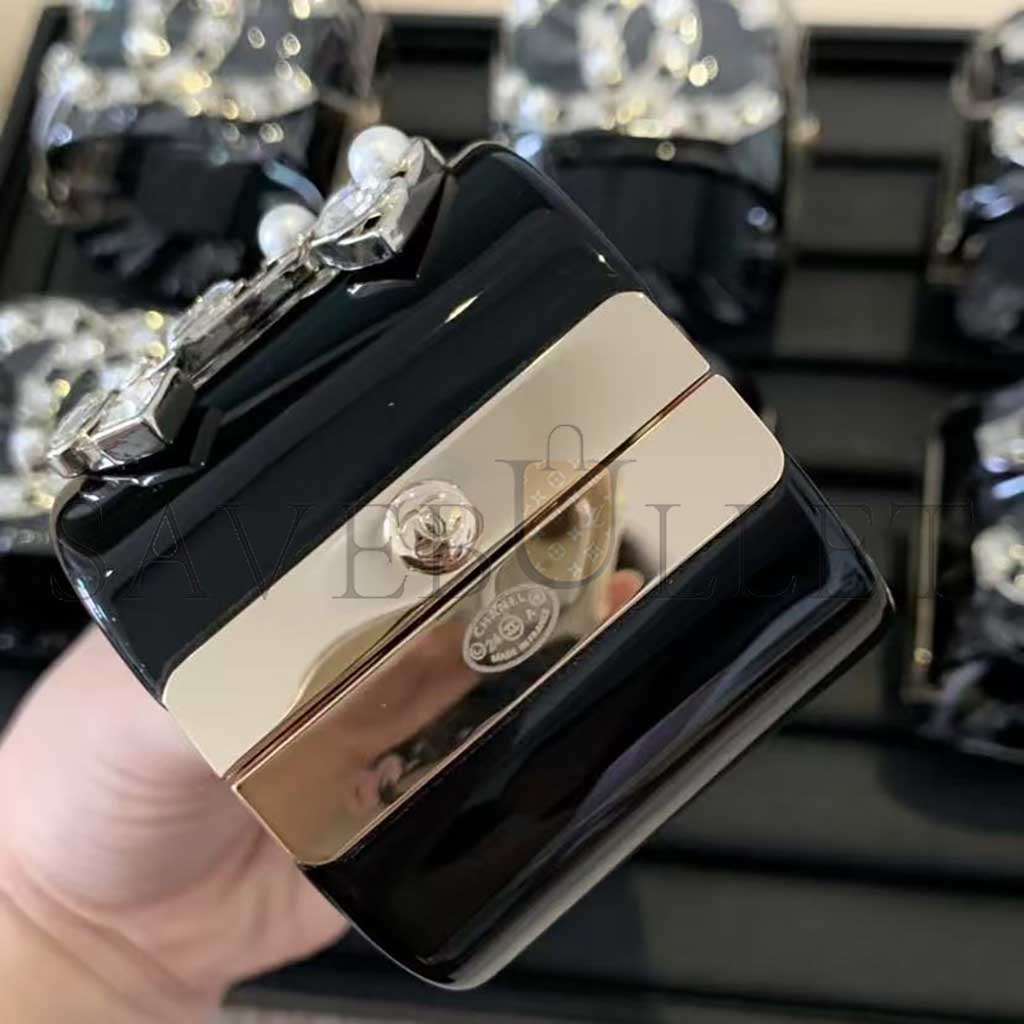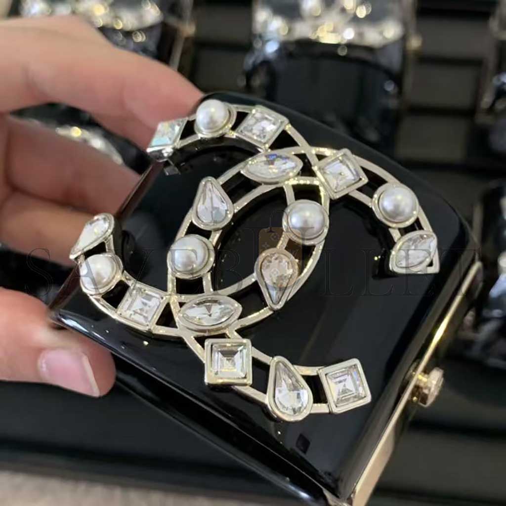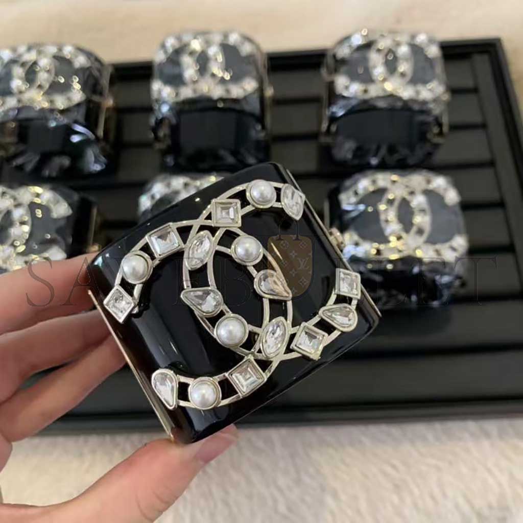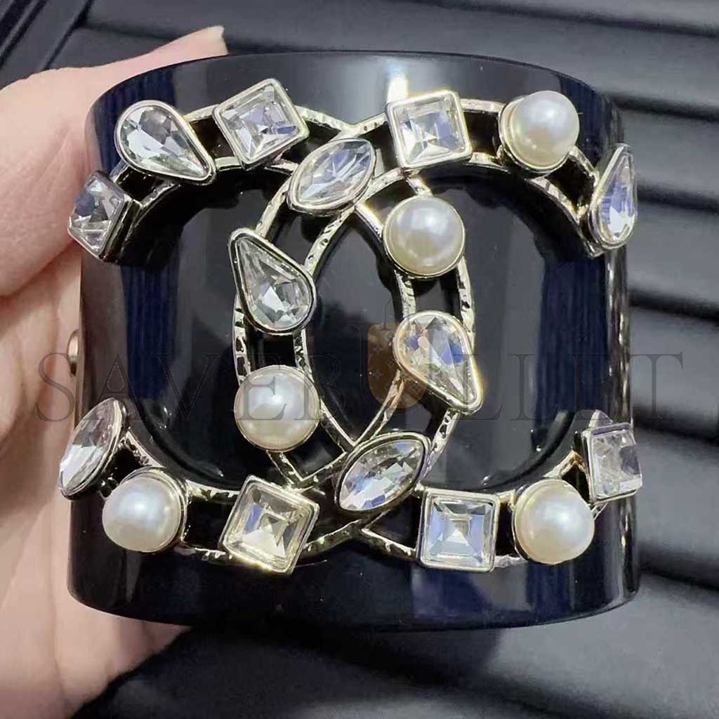 CHANEL RESIN CRYSTAL PEARL CC CUFF BLACK BRACELET