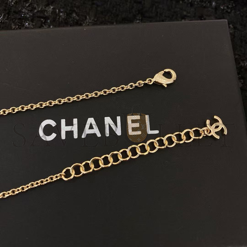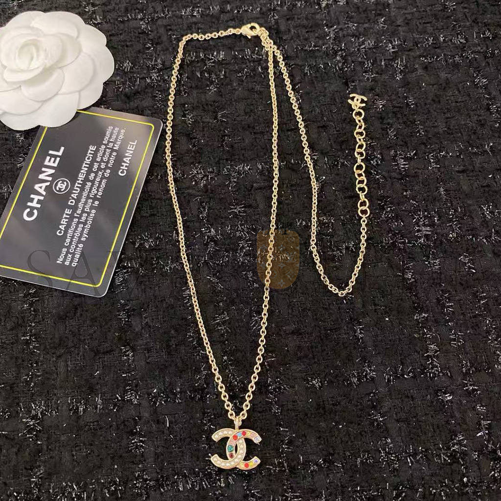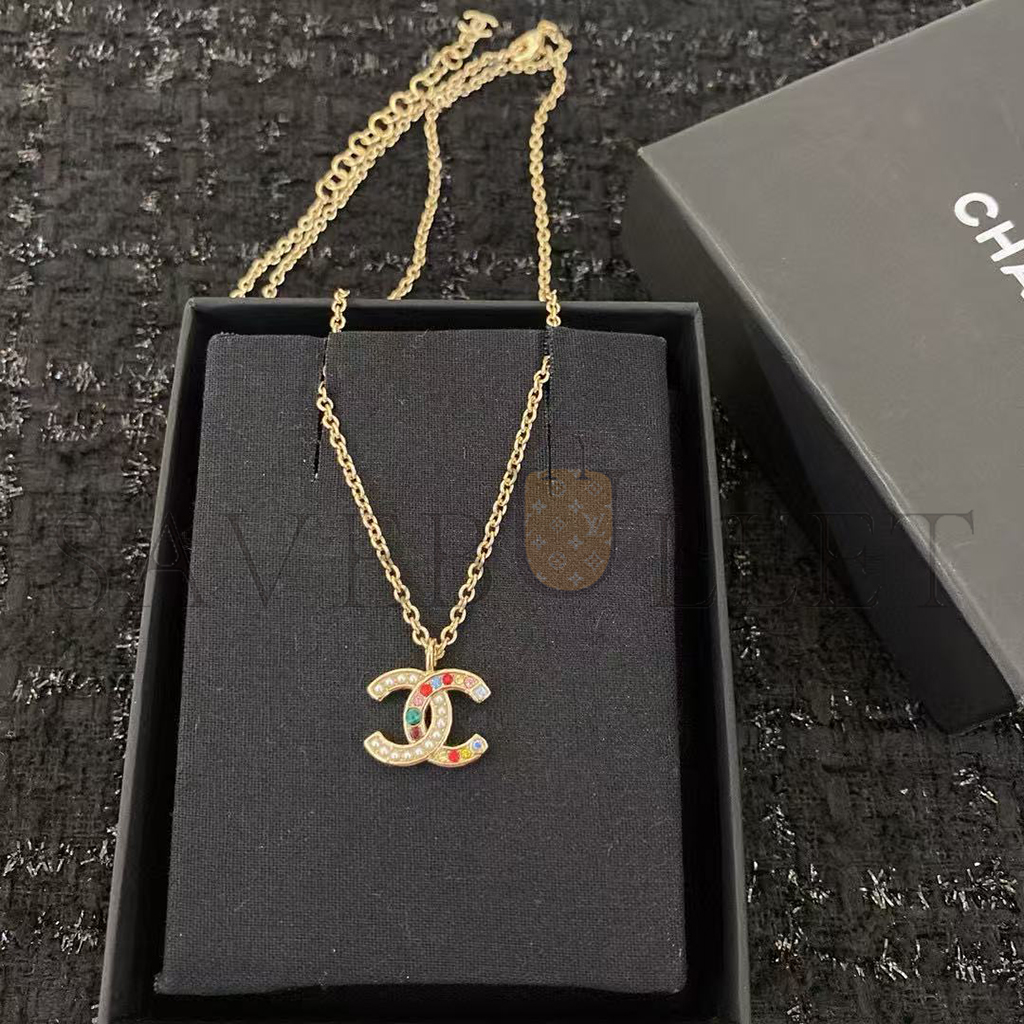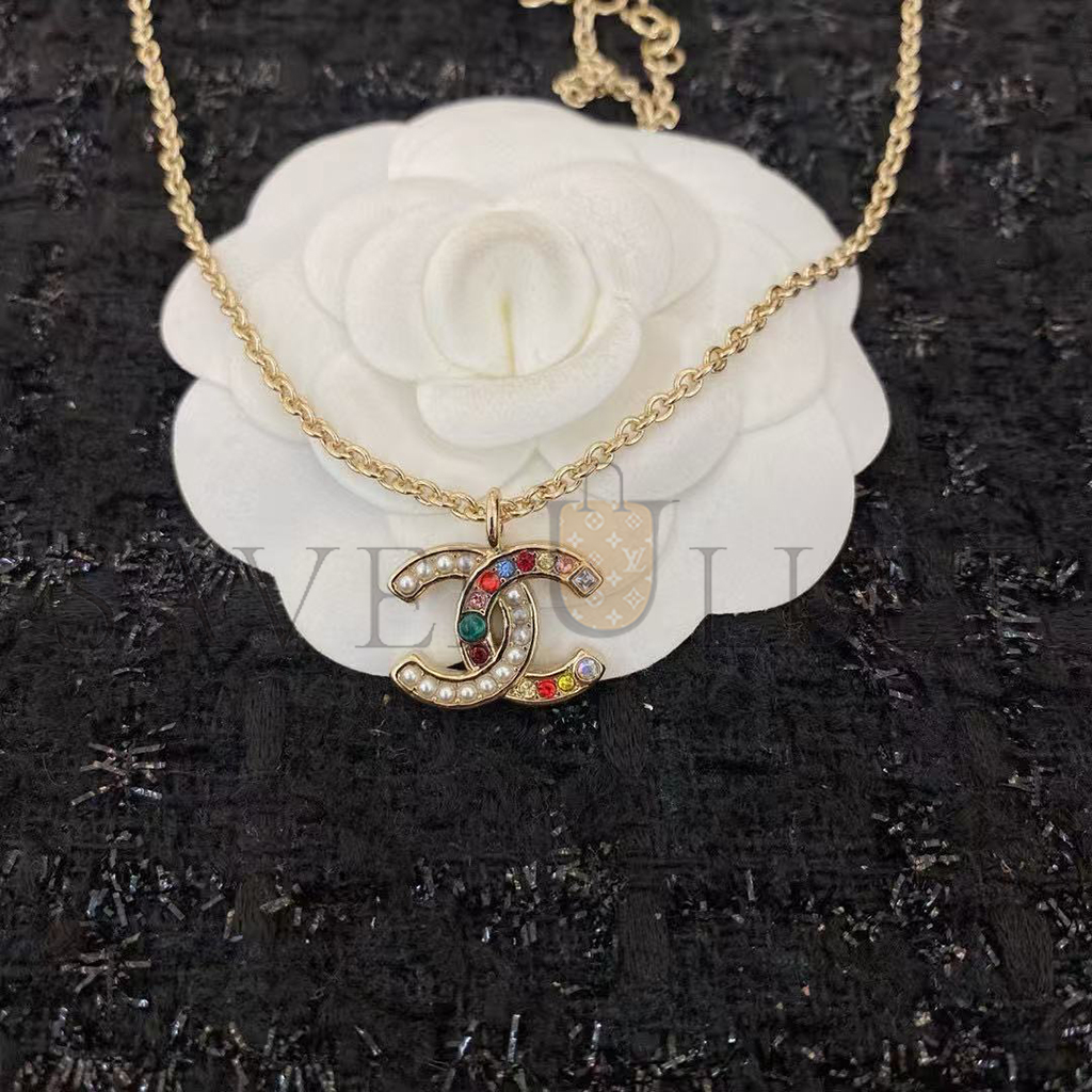CHANEL GOLD CC LOGO COLORFUL RHINESTONE PEARL NECKLACE AB8540