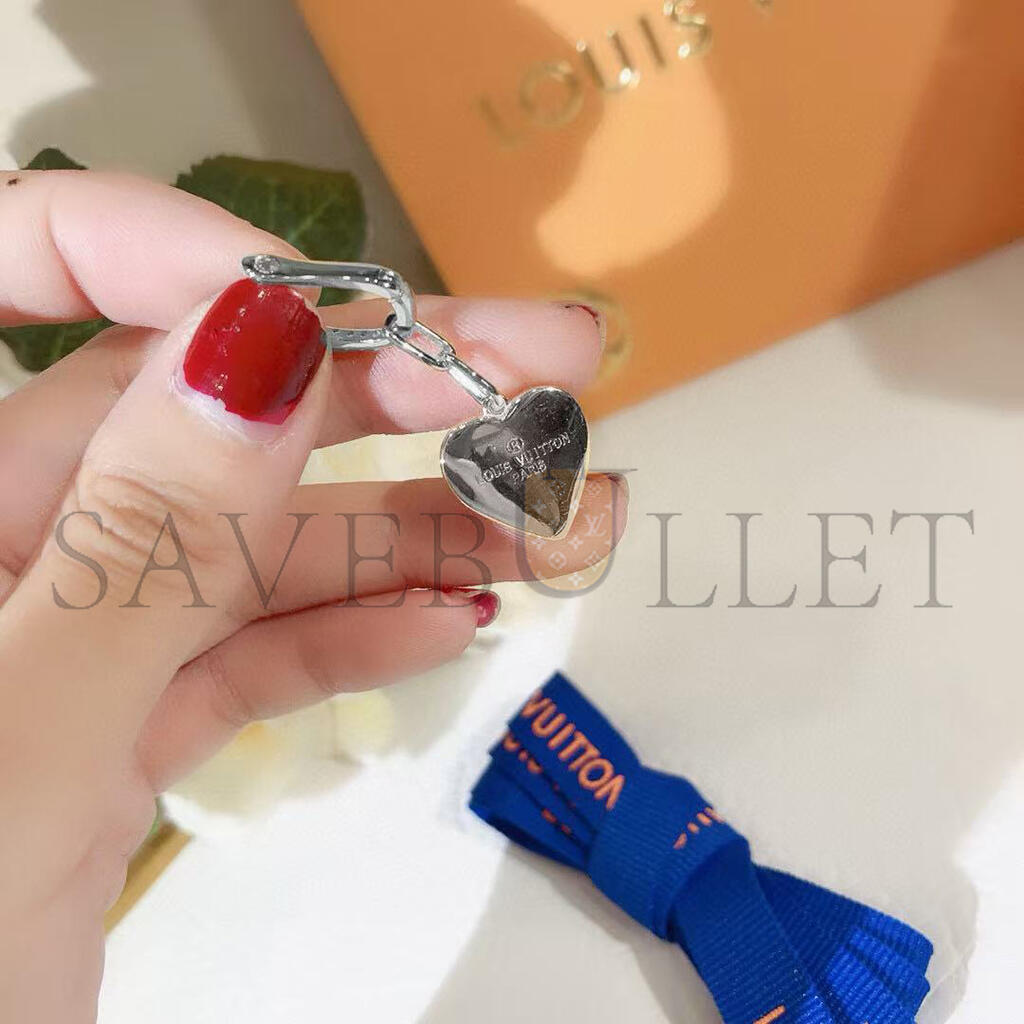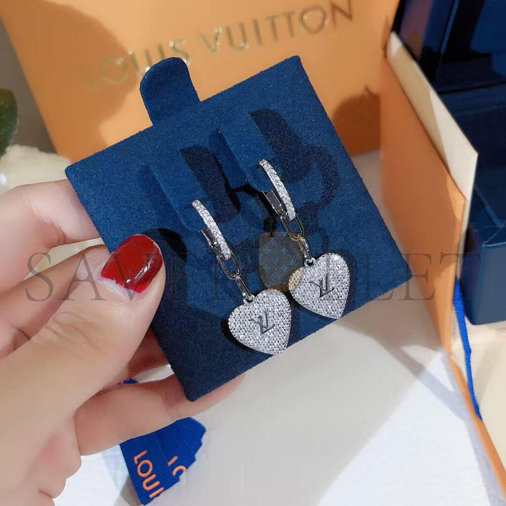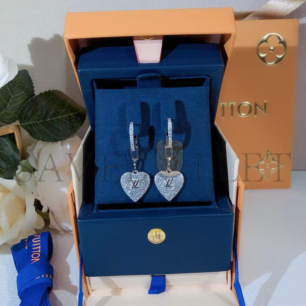 LOUIS VUITTON EARRINGS FEATURING PAVE CRYSTAL HEART CHARMS WITH THE LV INITIALS