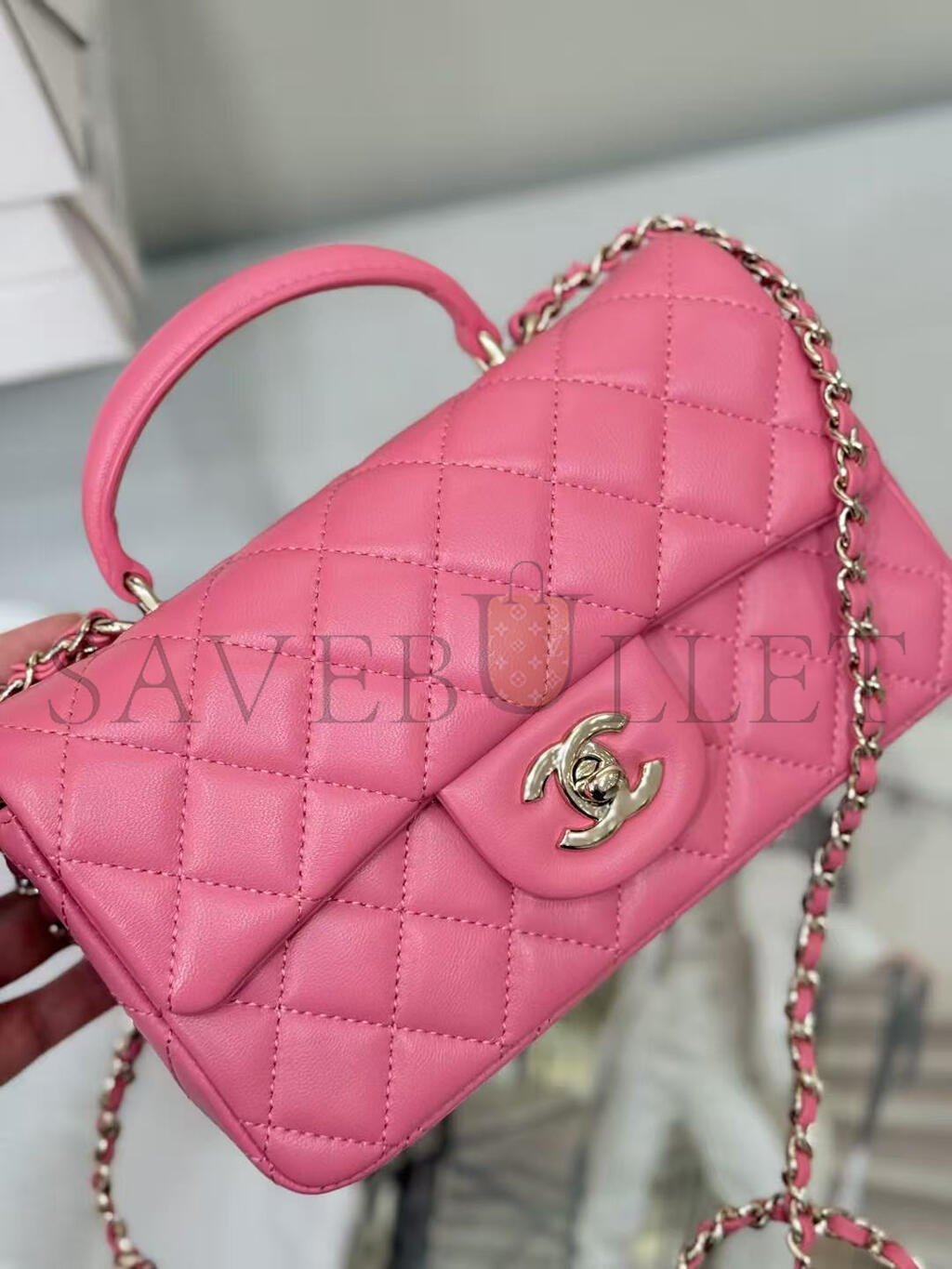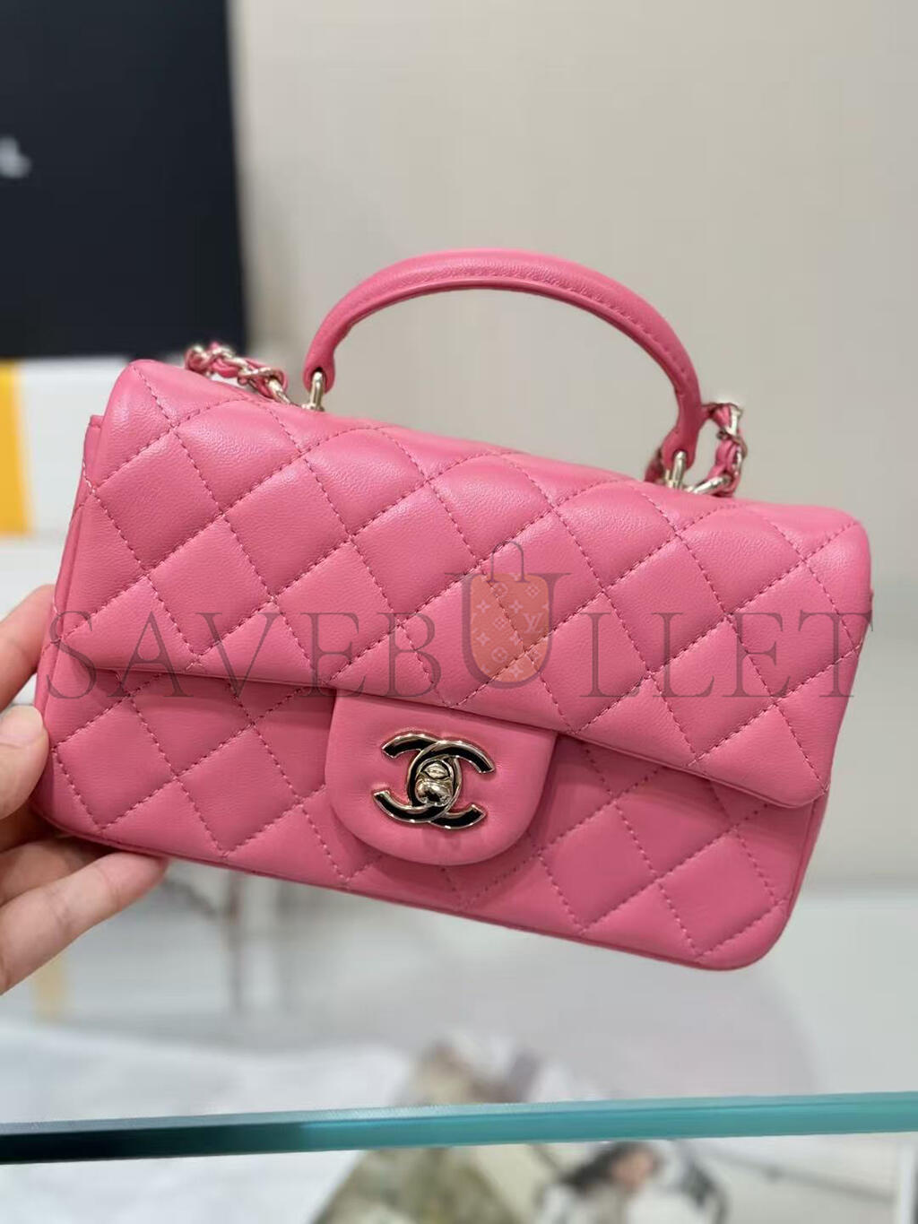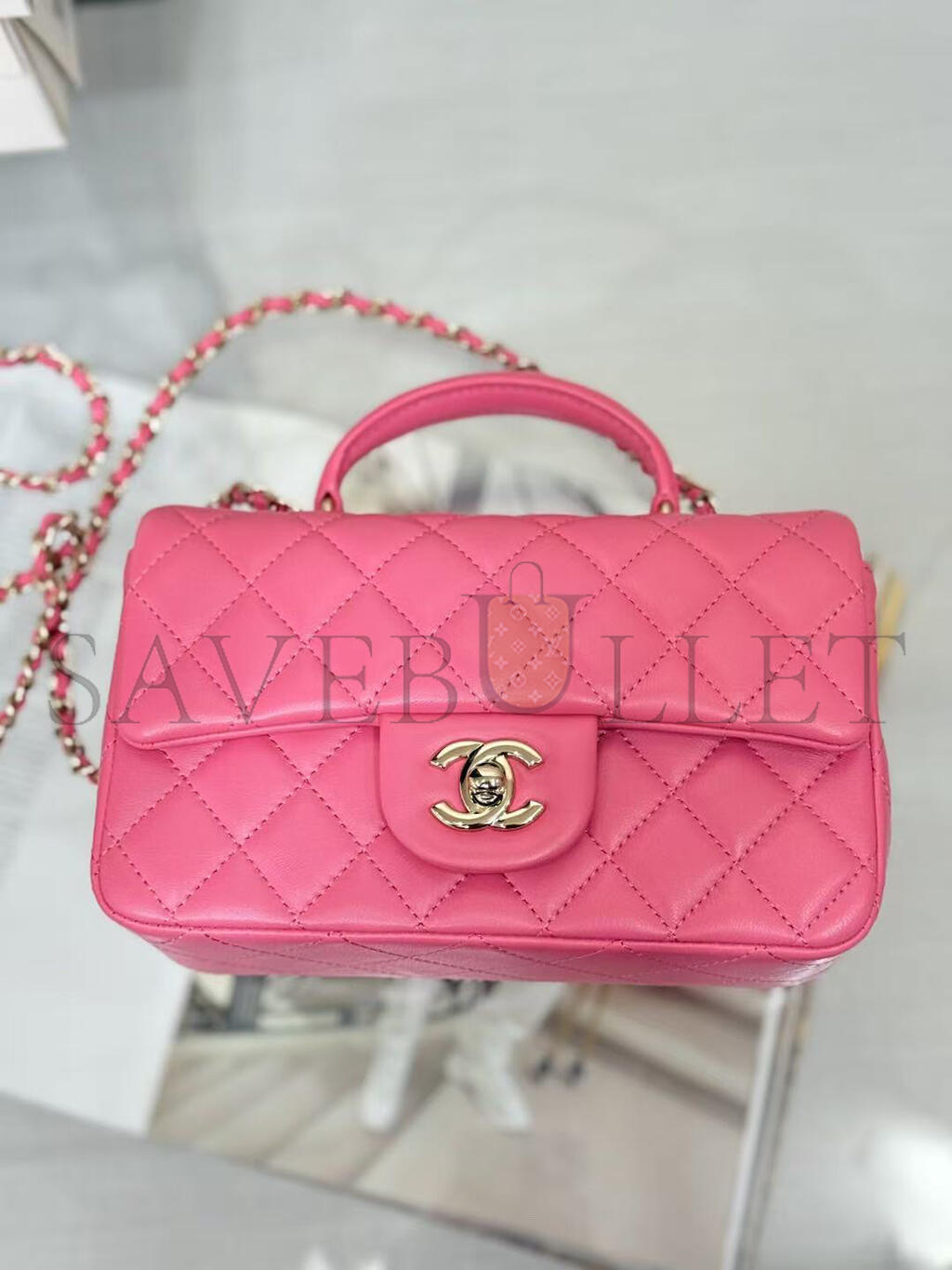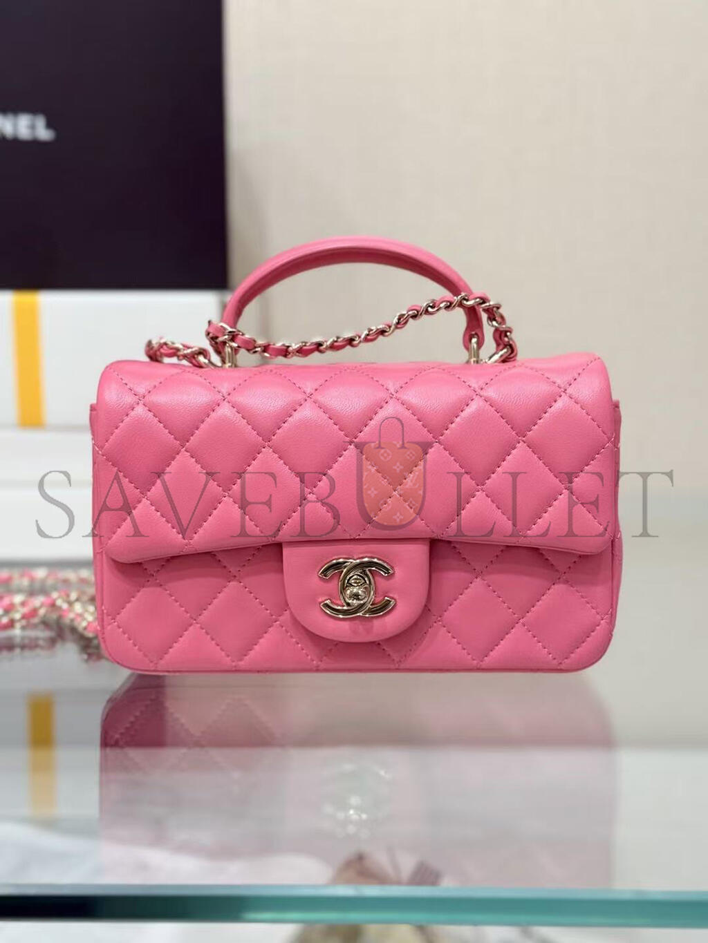 CHANEL MINI RECTANGULAR FLAP WITH TOP HANDLE LAMBSKIN LIGHT GOLD HARDWARE  (20*13*6cm)