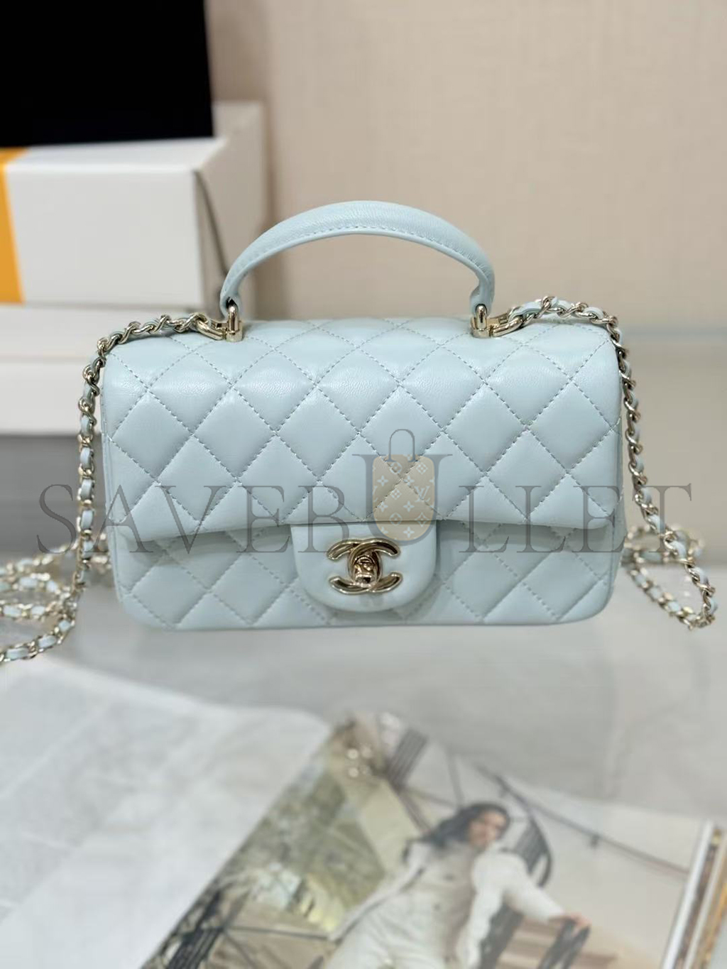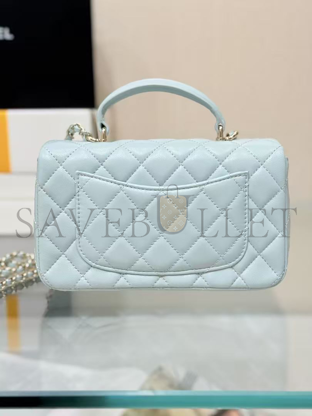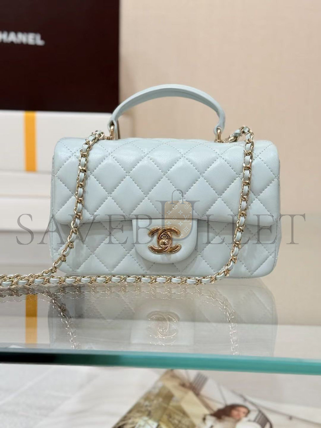 CHANEL MINI RECTANGULAR FLAP WITH TOP HANDLE LAMBSKIN LIGHT GOLD HARDWARE  (20*13*6cm)