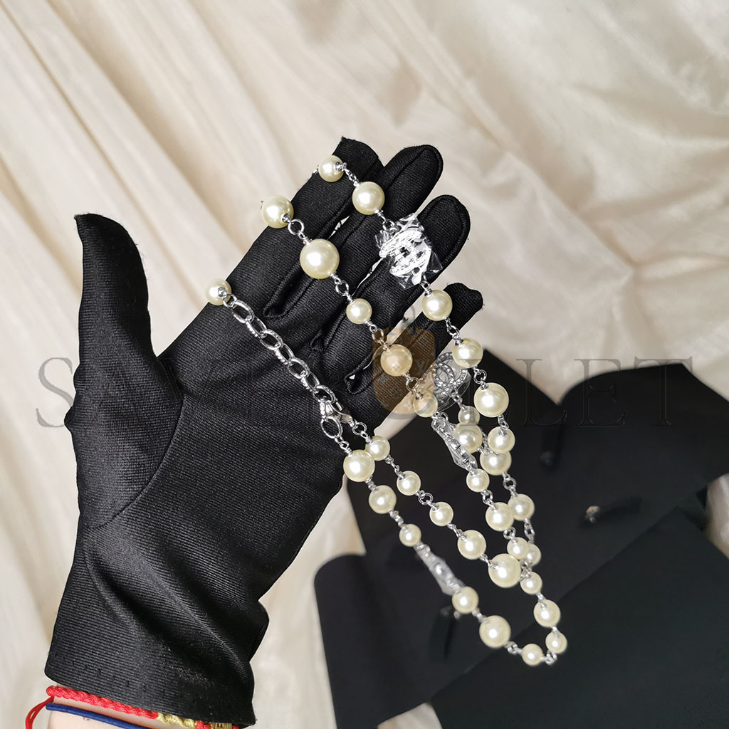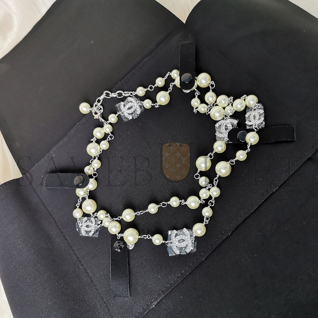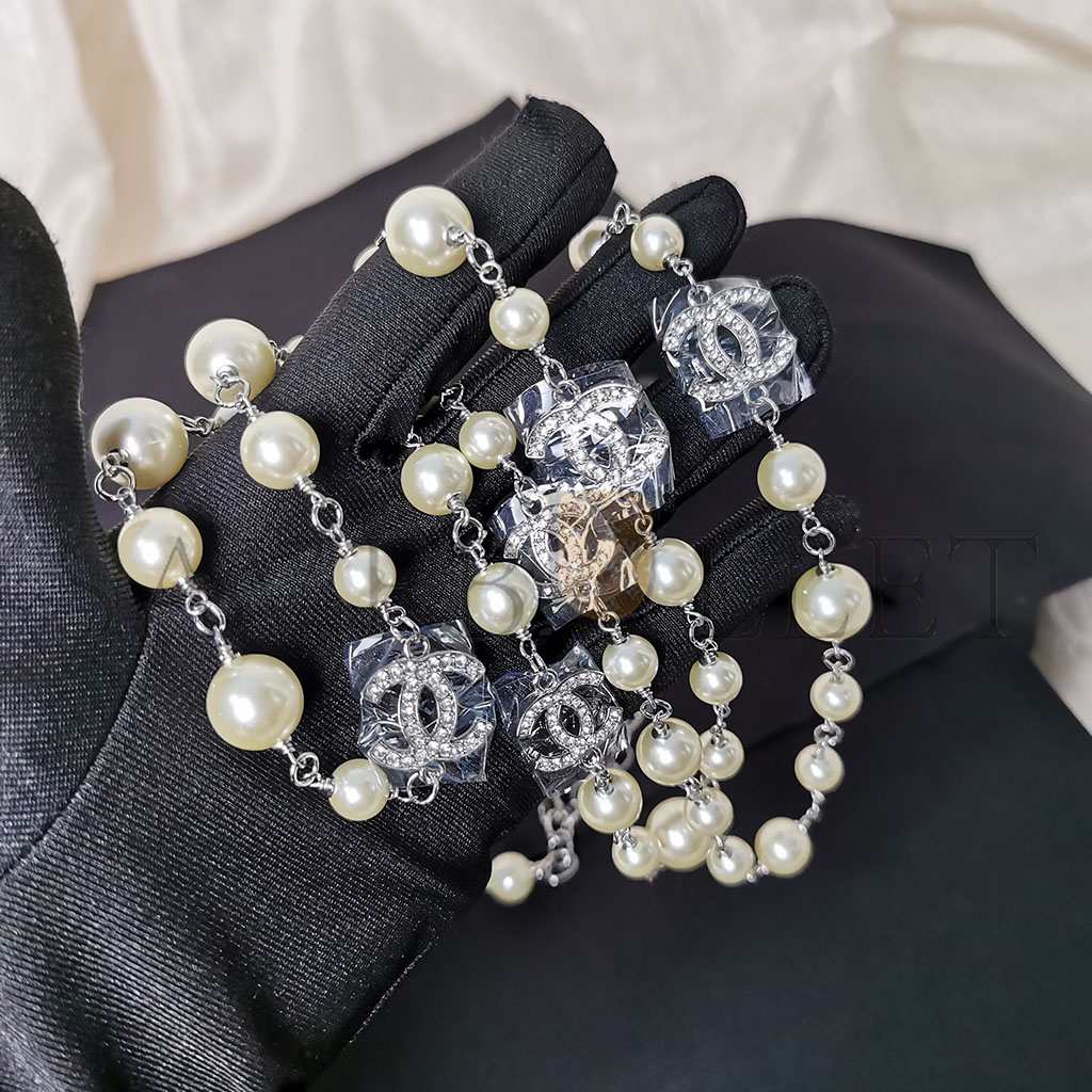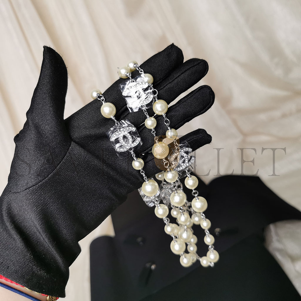 CHANEL GRADUATED PEARL CRYSTAL CC LONG NECKLACE SILVER