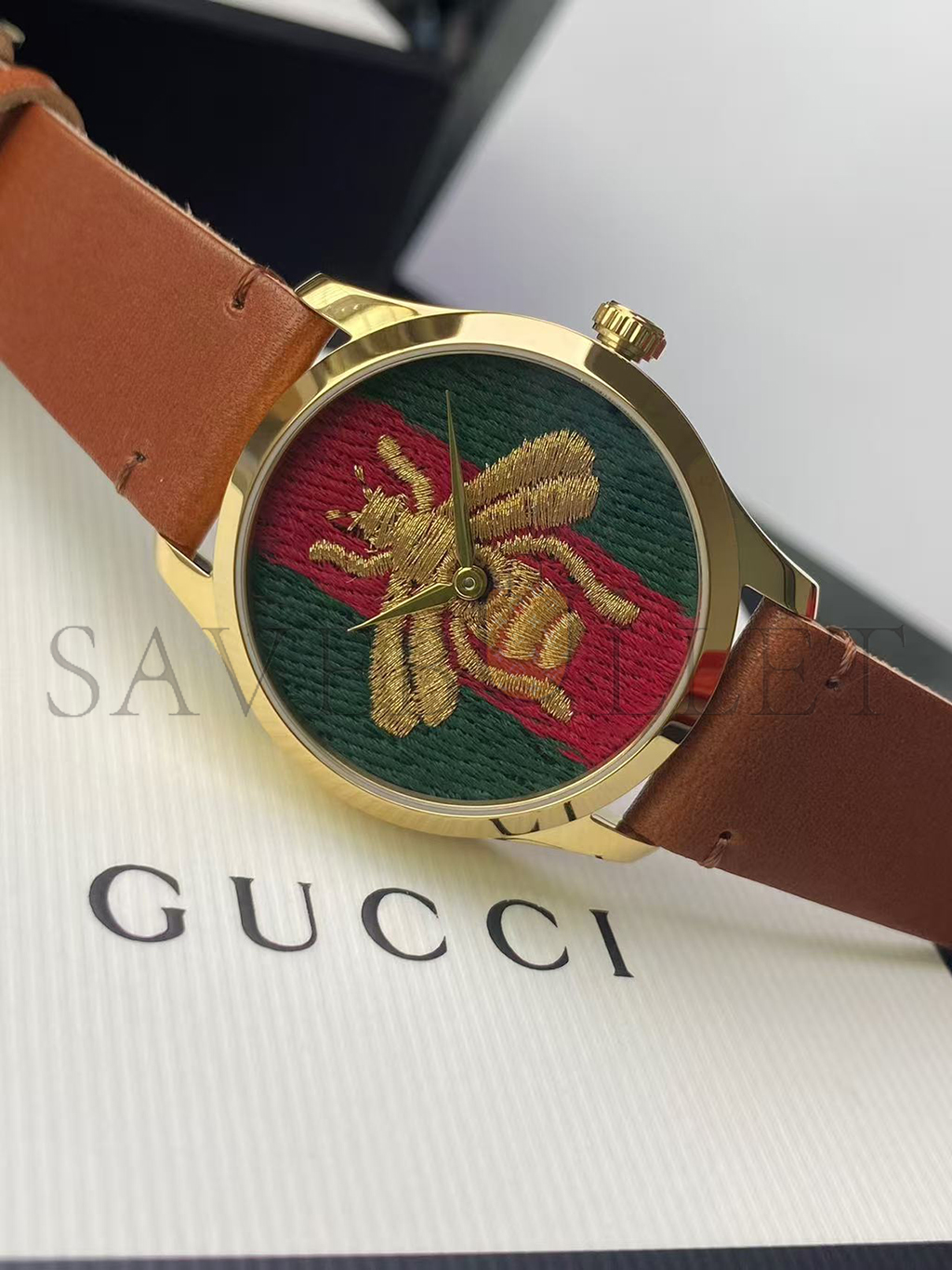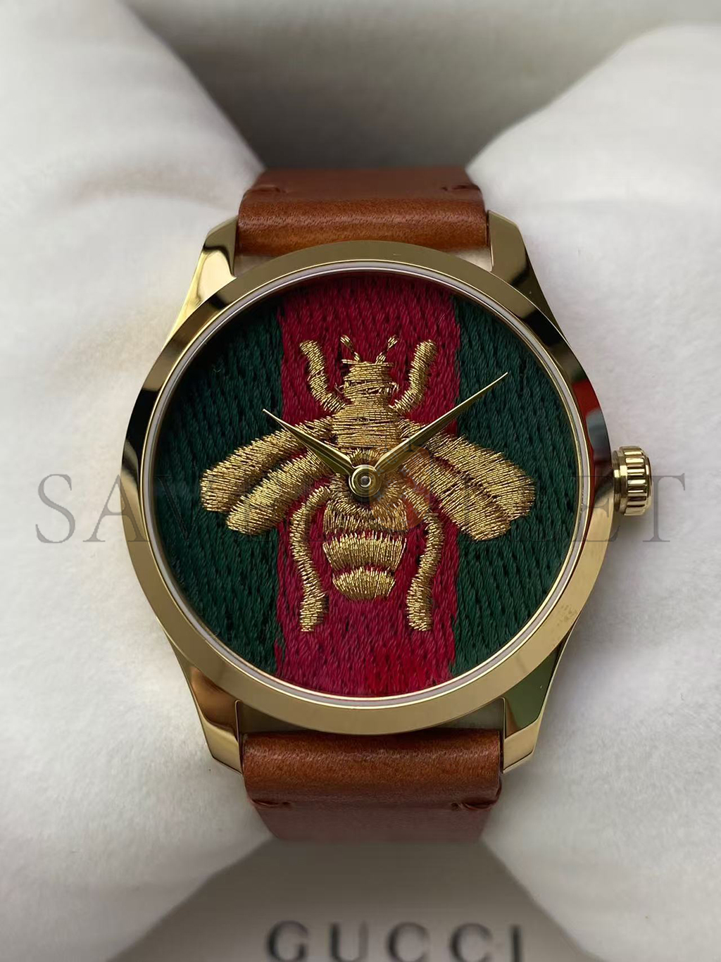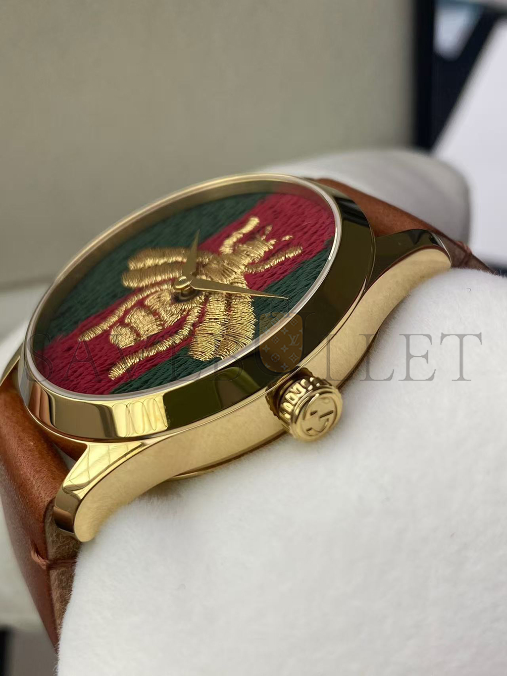 GUCCI G-TIMELESS GOLD TONE GREEN & RED BEE DIAL LEATHER STRAP WATCH YA126451A
