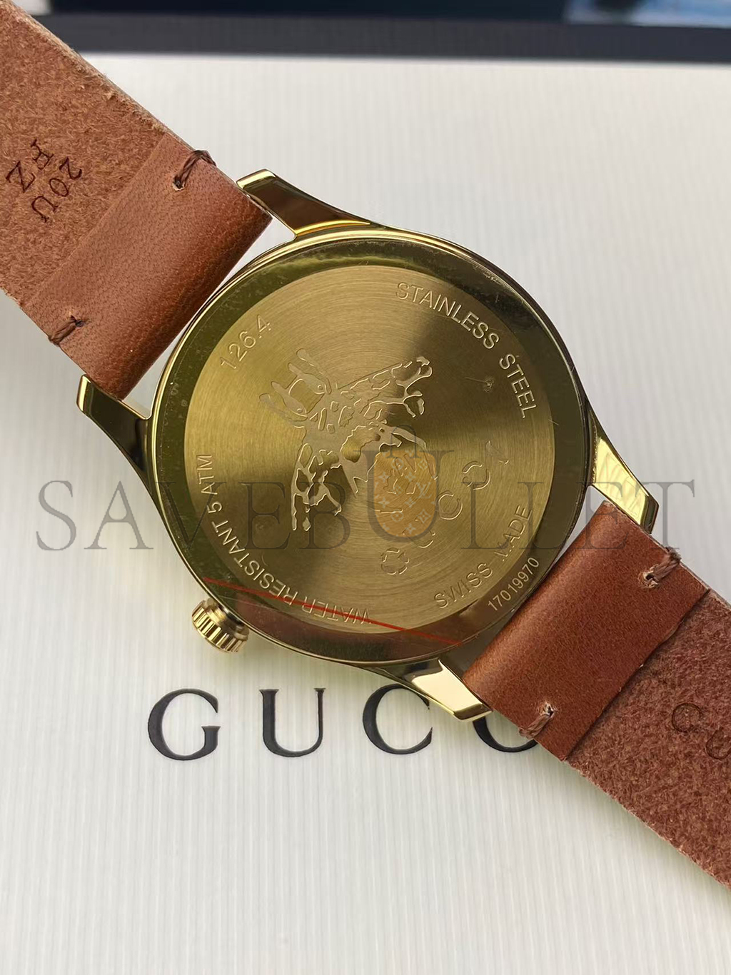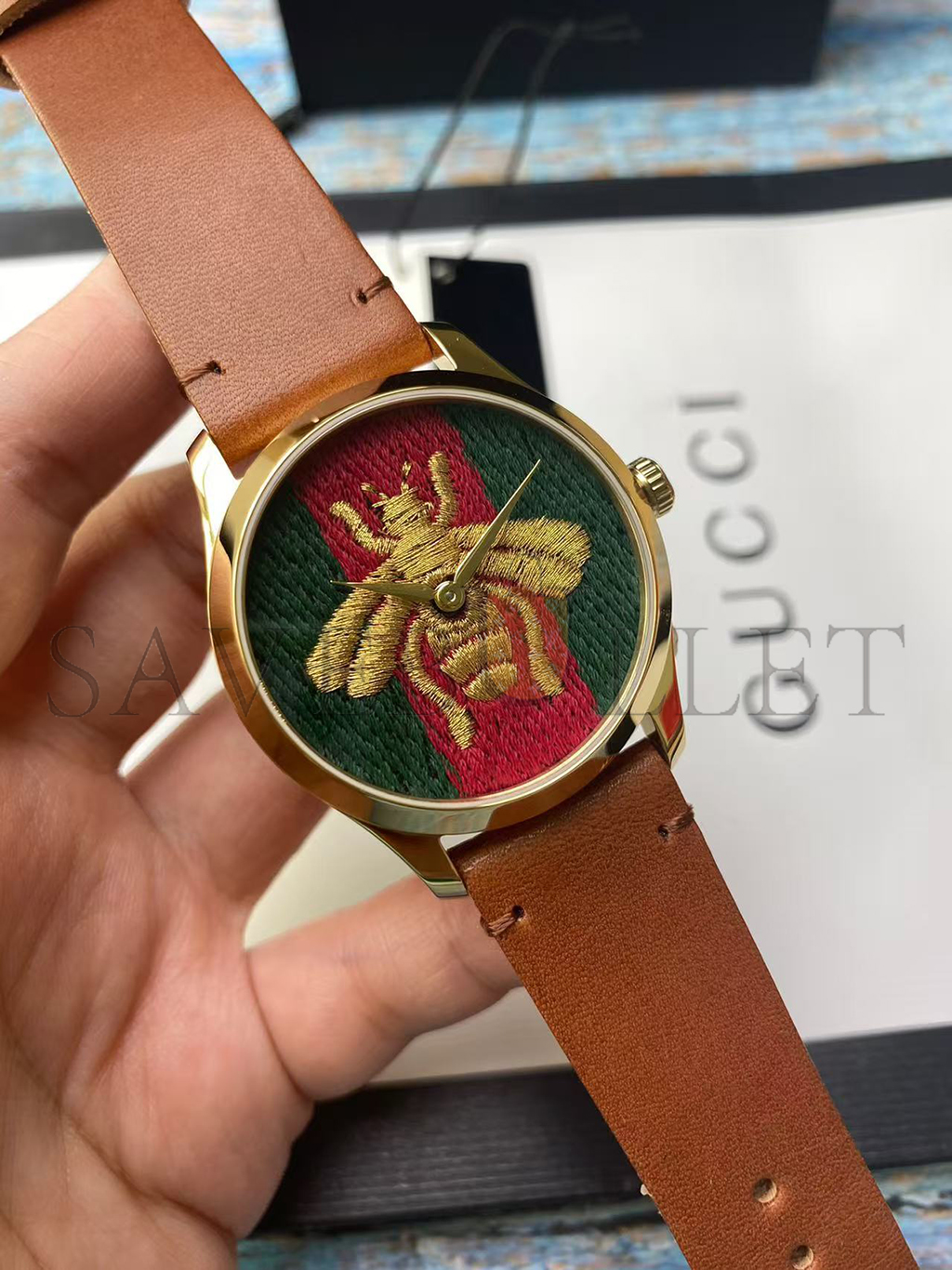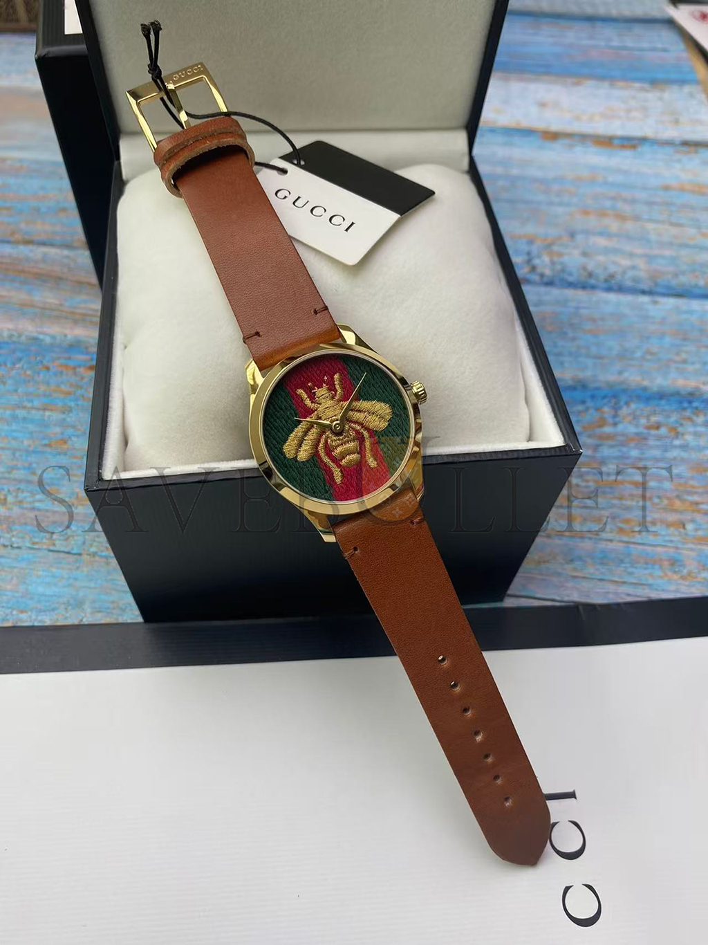 GUCCI G-TIMELESS GOLD TONE GREEN & RED BEE DIAL LEATHER STRAP WATCH YA126451A