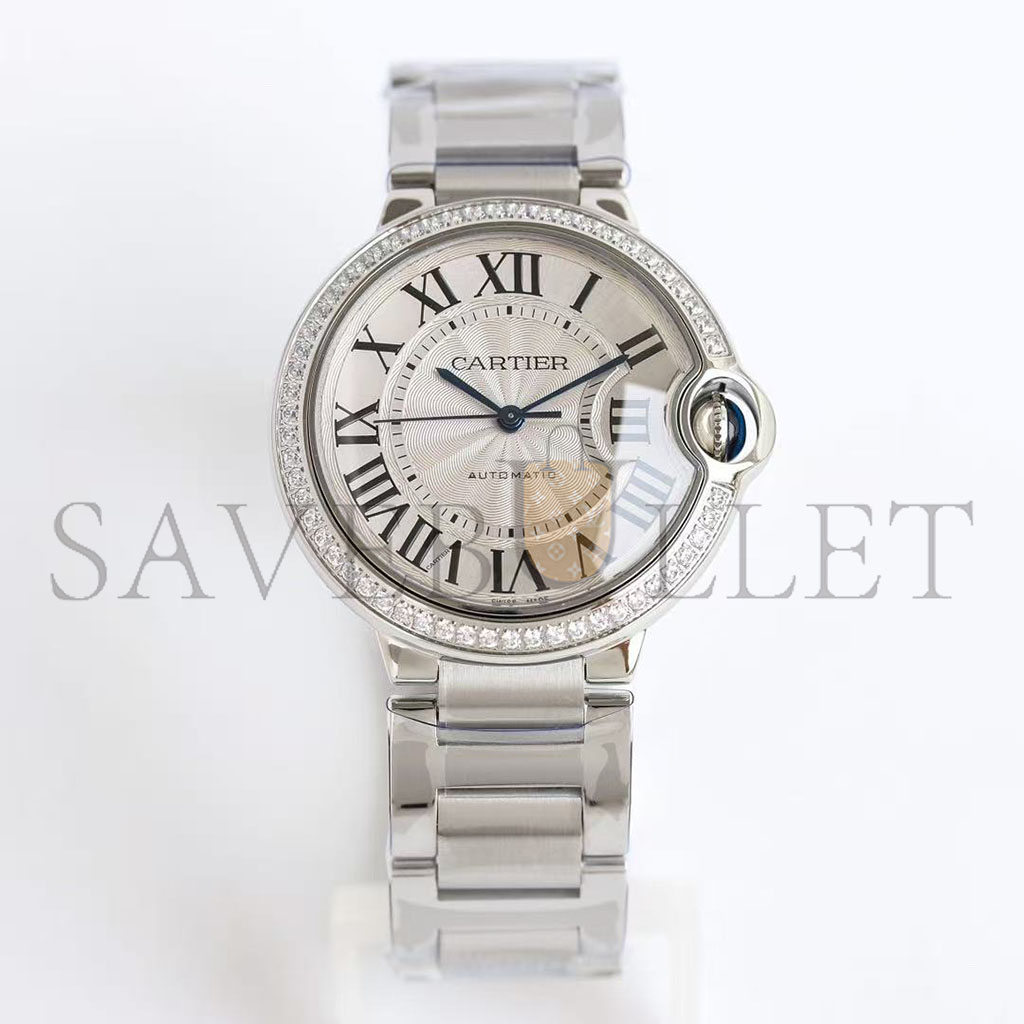 Ballon Bleu de Cartier watch, 36mm, automatic mechanical movement. Stainless steel case, stainless steel fluted crown set with a cabochon synthetic spinel. Stainless steel bezel set with 54 brilliant-cut round diamonds totaling 0.79 carats. Silver guilloché dial. Blued steel sword-shaped hands. Sapphire crystal. Interchangeable stainless steel bracelet. Thickness: 12.1mm. Water resistant to 3 bar (approx. 30 meters/100 feet).