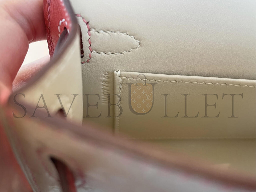 This tiny Horseshoe Stamp Kelly, in the Sellier style, is in Beton and Rose Tyrien ostrich leather with gold hardware and has contrast stitching, two front straps with front toggle closure, single rolled handle and removable shoulder strap. The interior is lined with Beton leather and has one open pocket on the back wall.