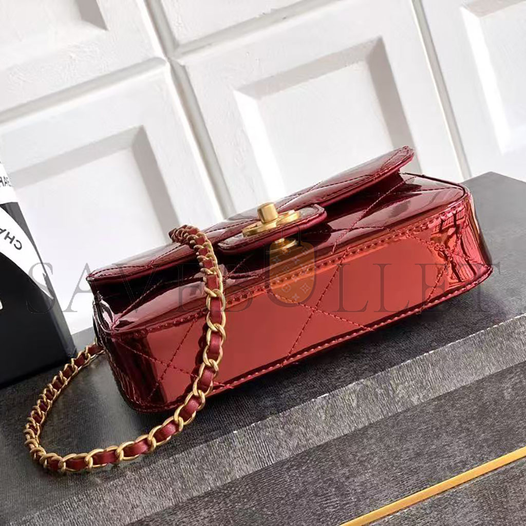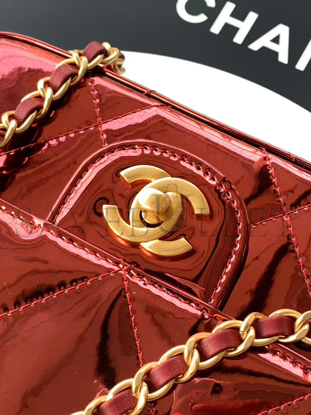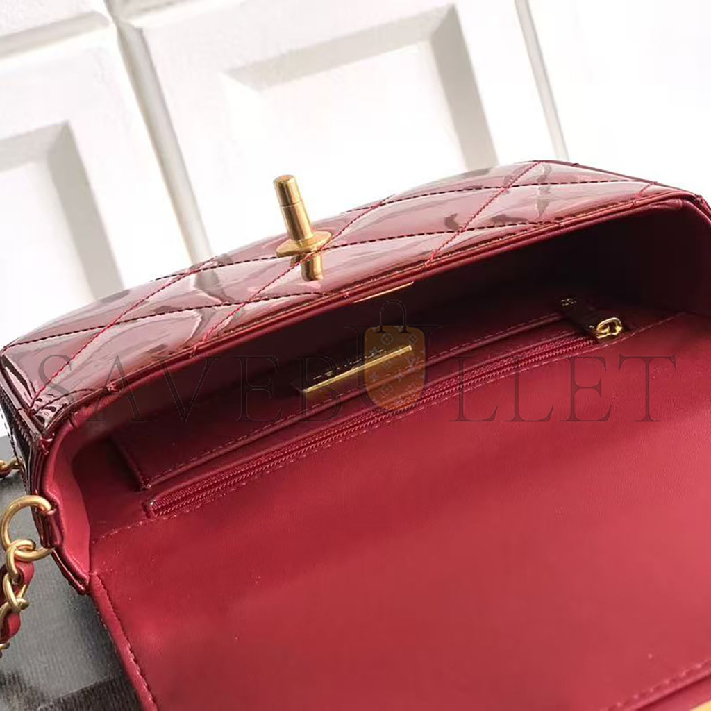 CHANEL FLAP BAG WITH TOP HANDLE METALLIC MIRROR CALFSKIN & GOLD-TONE METAL BURGUNDY AS5850 (18.5*12.9*4.5cm)