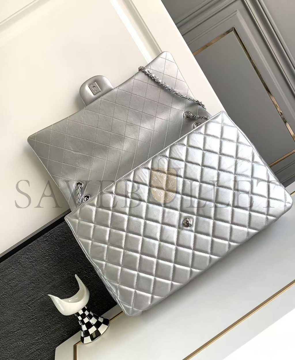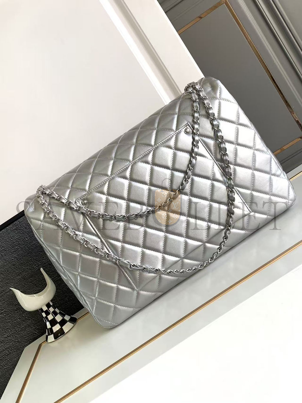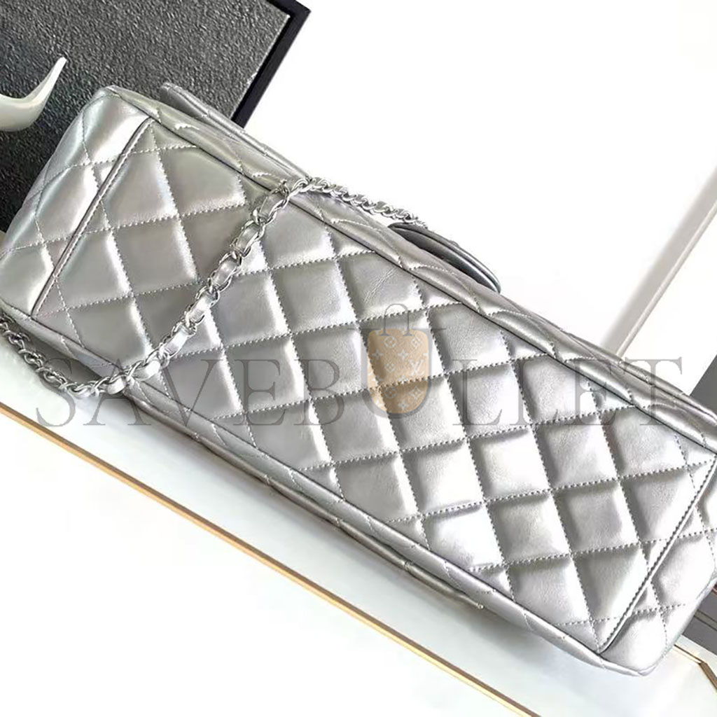 CHANEL METALLIC CALFSKIN QUILTED XXL TRAVEL FLAP BAG SILVER (44*25*14cm)