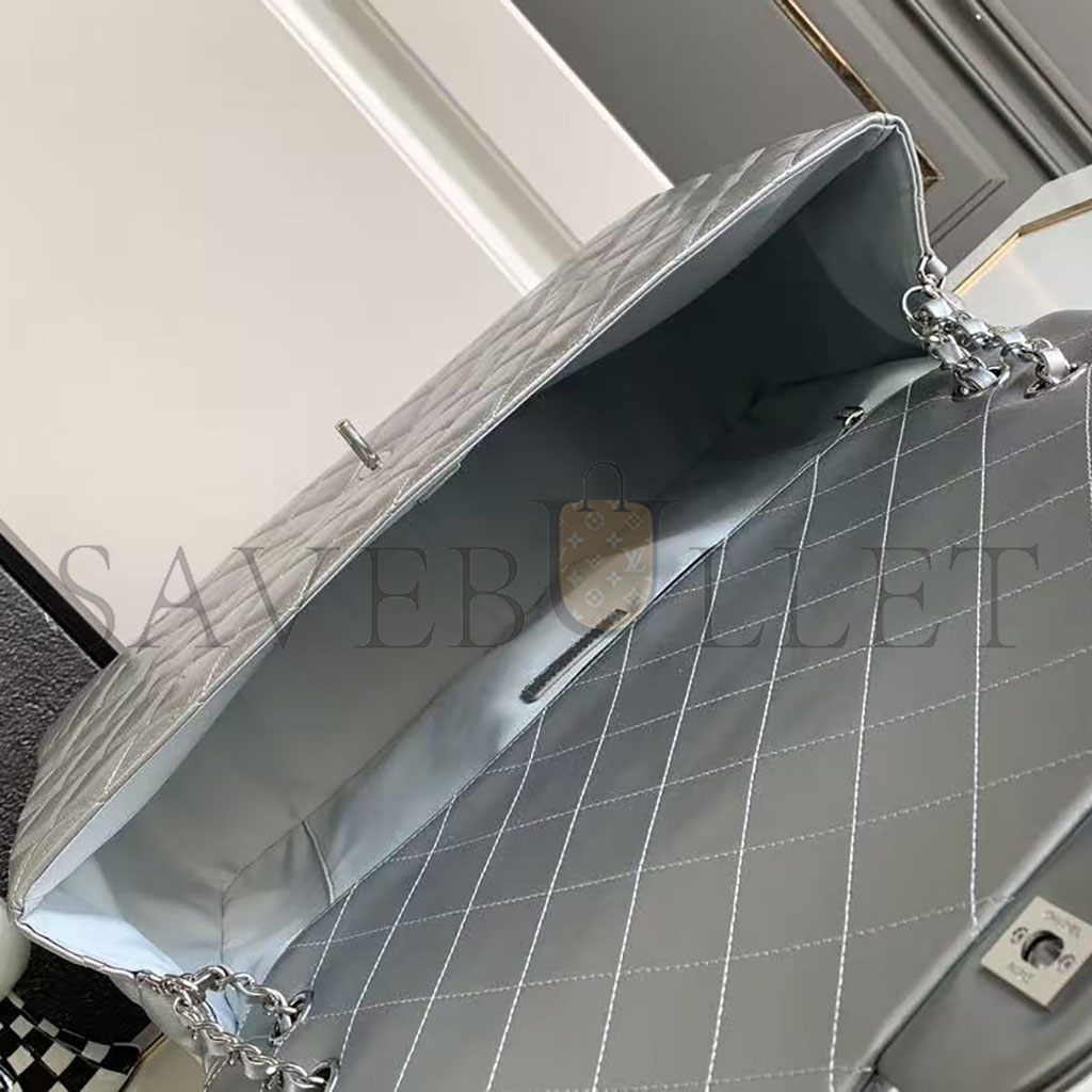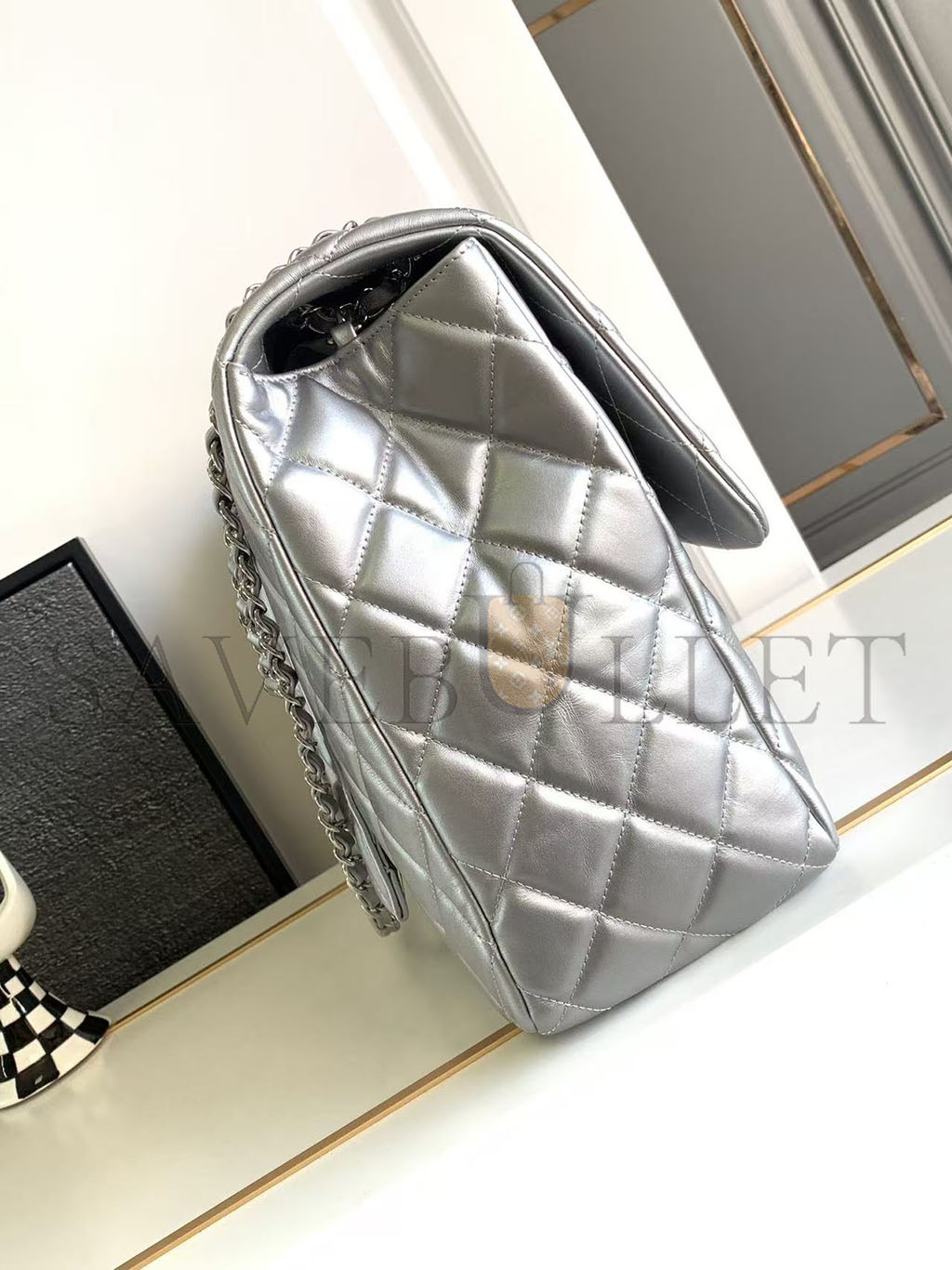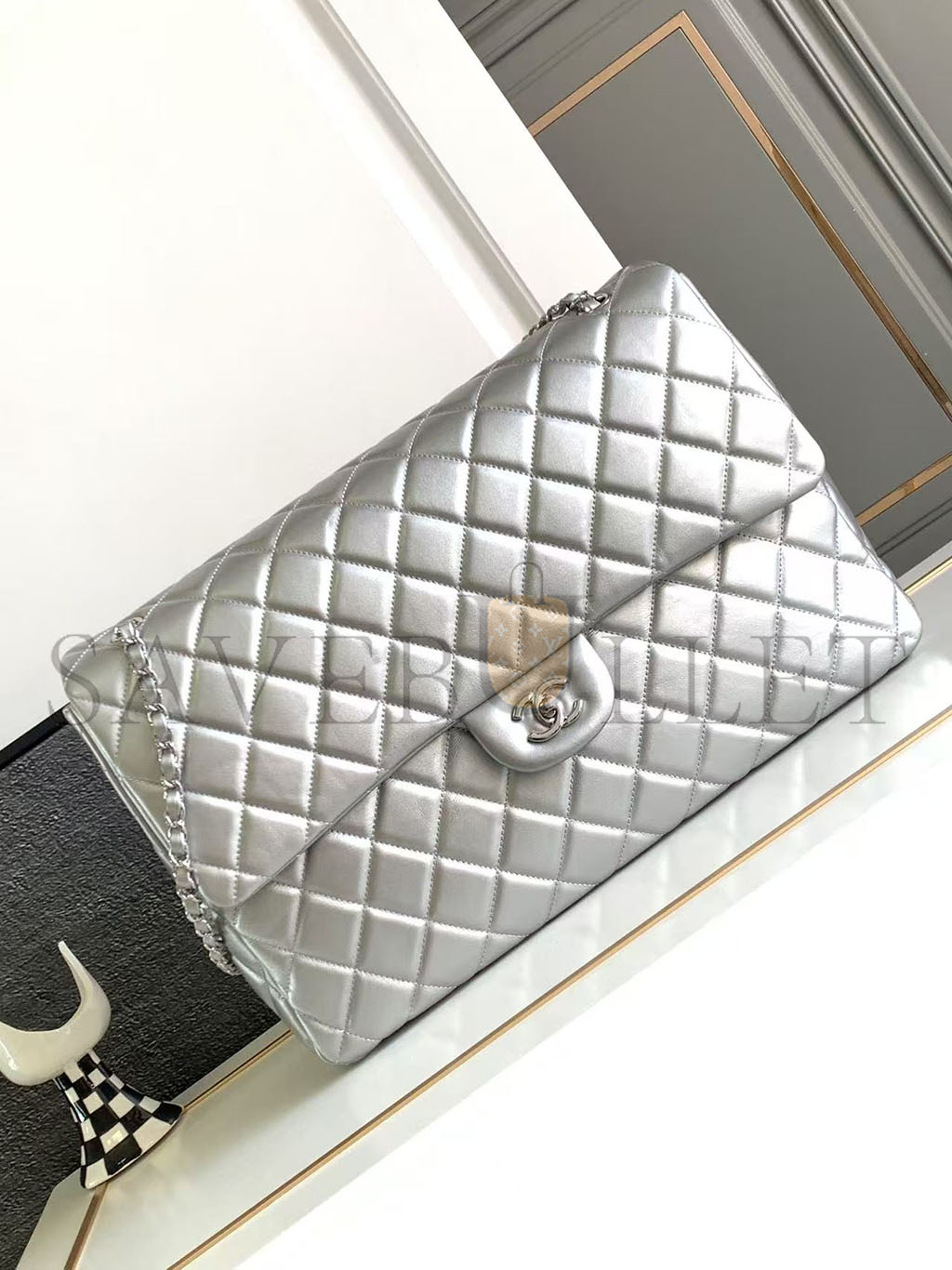 CHANEL METALLIC CALFSKIN QUILTED XXL TRAVEL FLAP BAG SILVER (44*25*14cm)