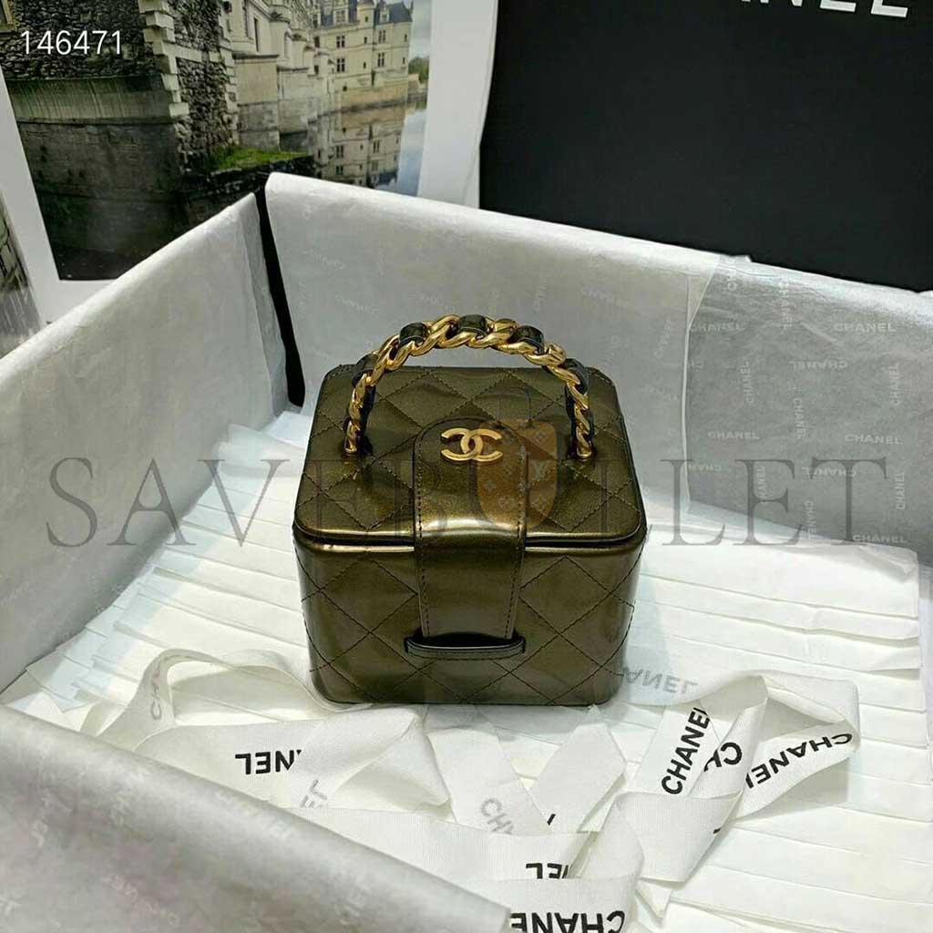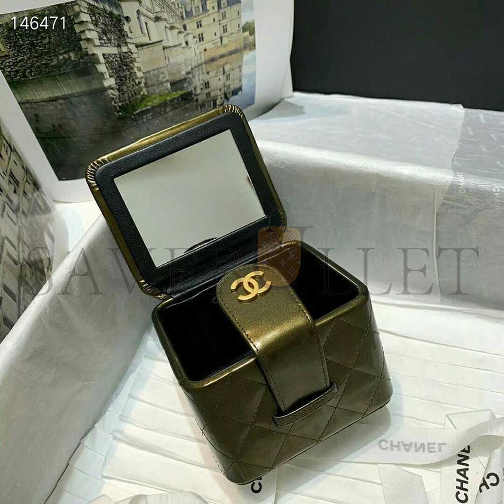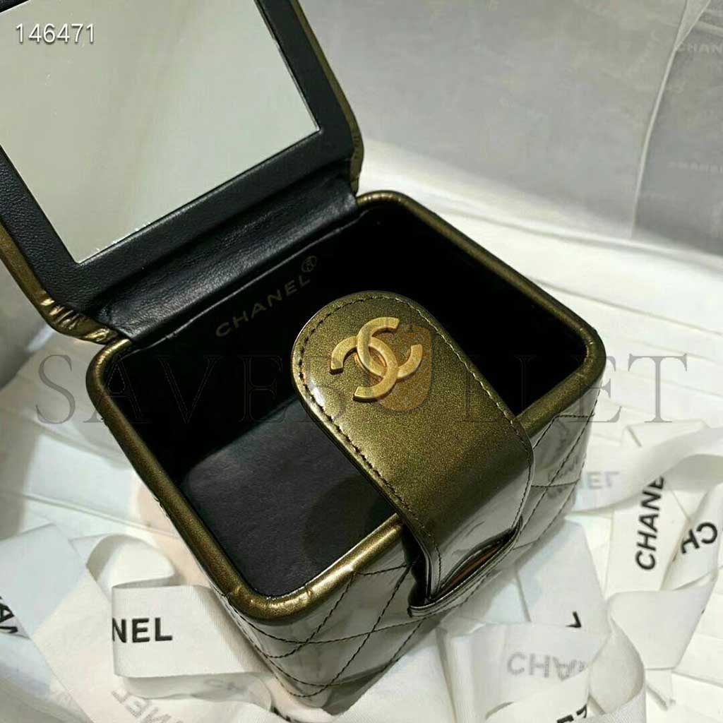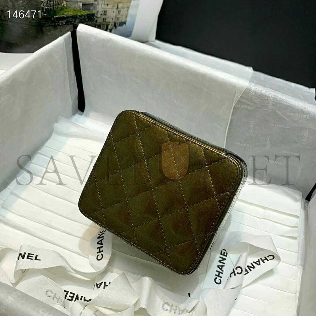 CHANEL MINI CC VANITY CASE OLIVE GREEN IRIDESCENT QUILTED PATENT LEATHER A2227 (11*9.5*8.5cm)