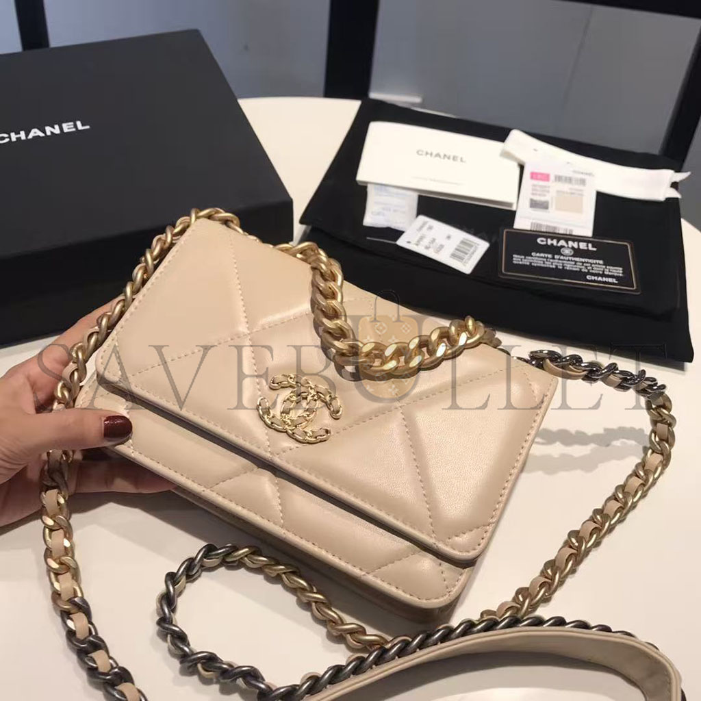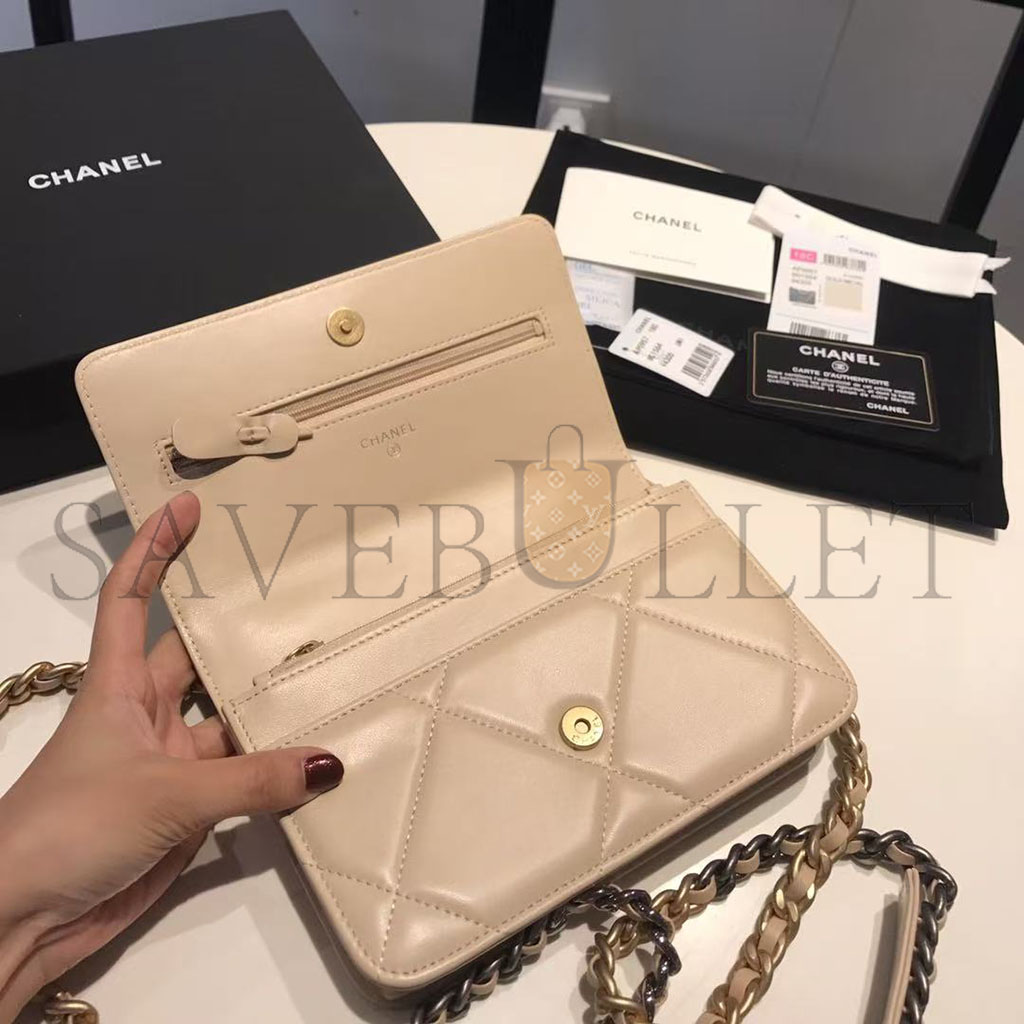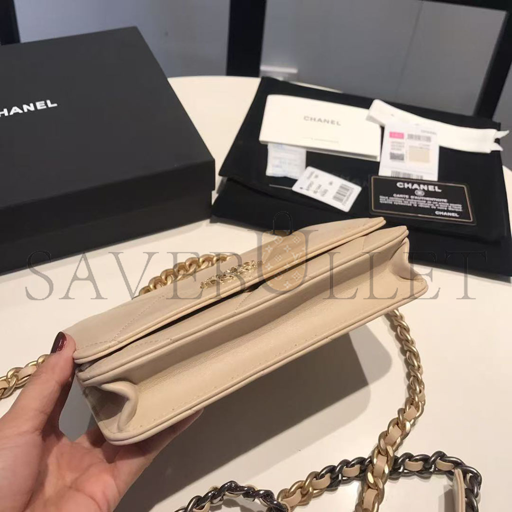 CHANEL GOATSKIN QUILTED 19 WALLET ON CHAIN WOC LIGHT BEIGE (19*12*4cm)