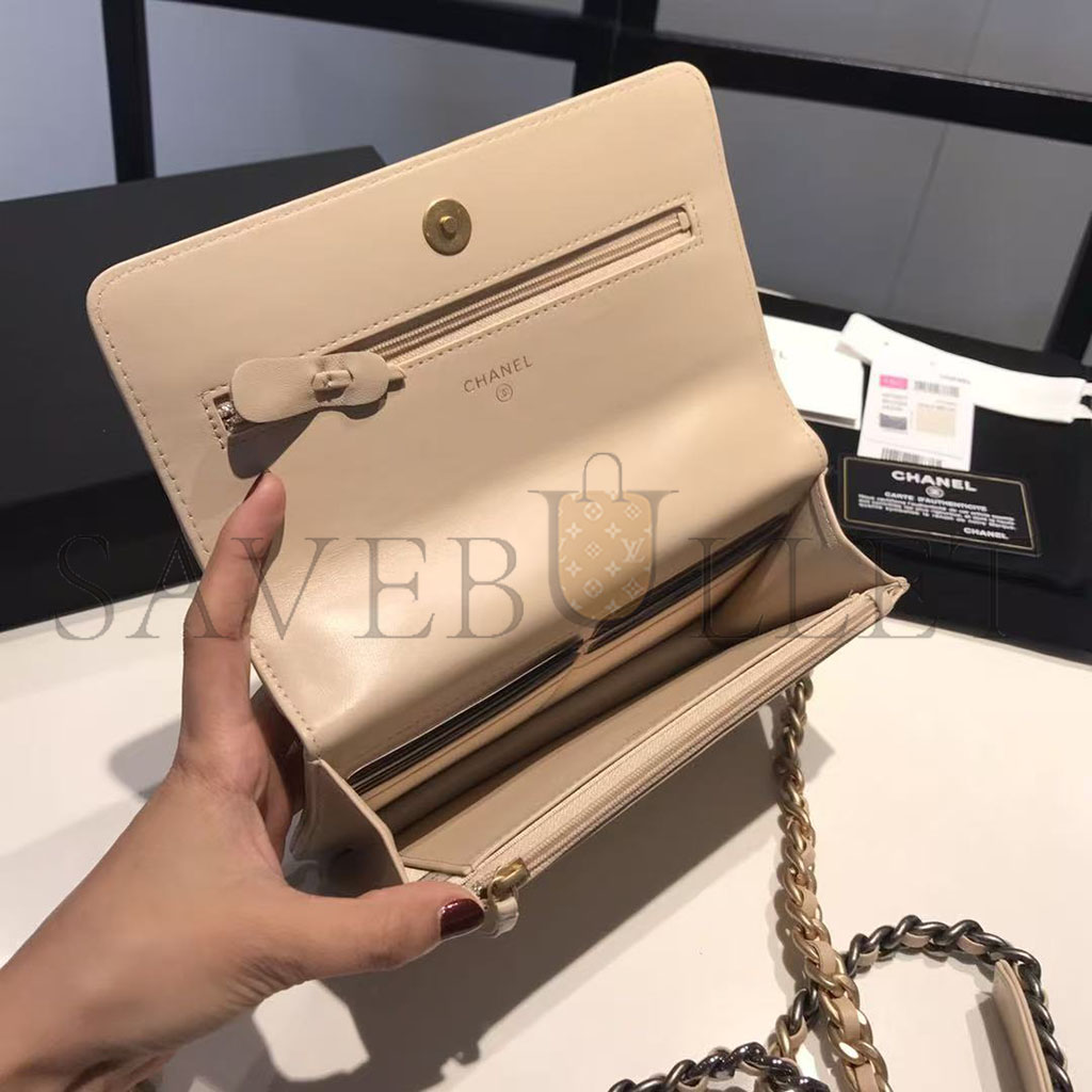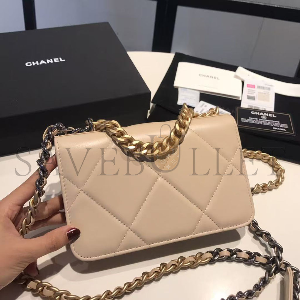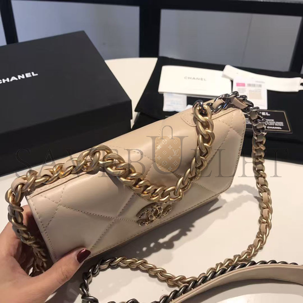 CHANEL GOATSKIN QUILTED 19 WALLET ON CHAIN WOC LIGHT BEIGE (19*12*4cm)