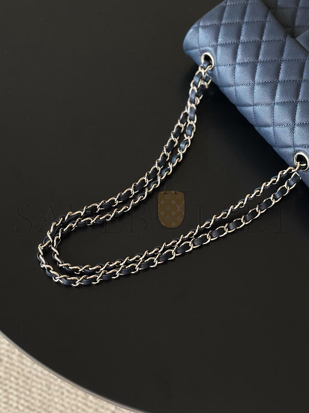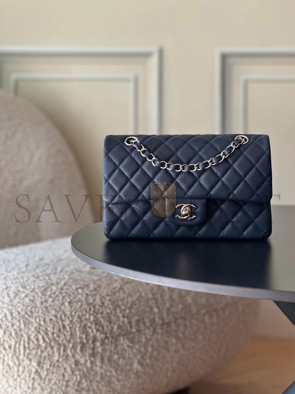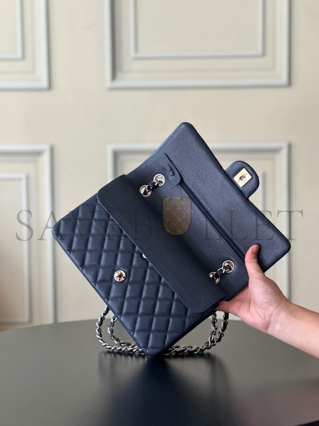 CHANEL CLASSIC DOUBLE FLAP QUILTED CAVIAR SILVER-TONE MEDIUM NAVY BLUE A01112 (25.5*15.5*6.5cm)