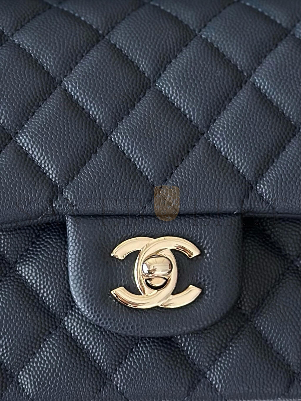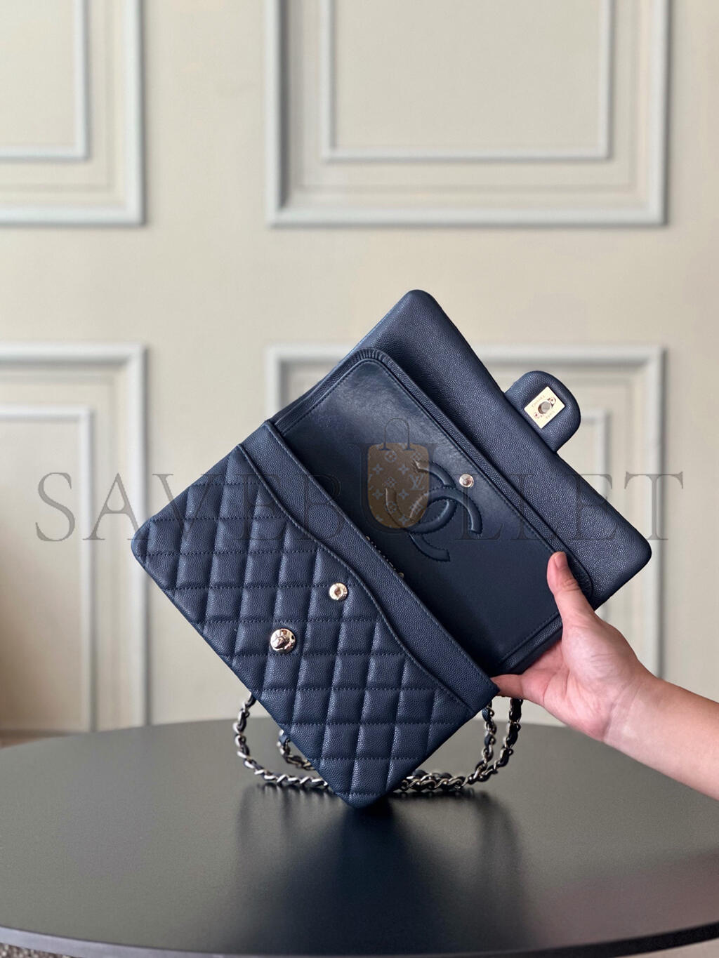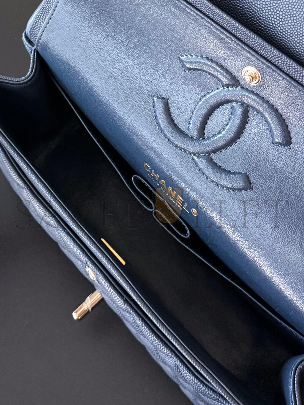 CHANEL CLASSIC DOUBLE FLAP QUILTED CAVIAR SILVER-TONE MEDIUM NAVY BLUE A01112 (25.5*15.5*6.5cm)