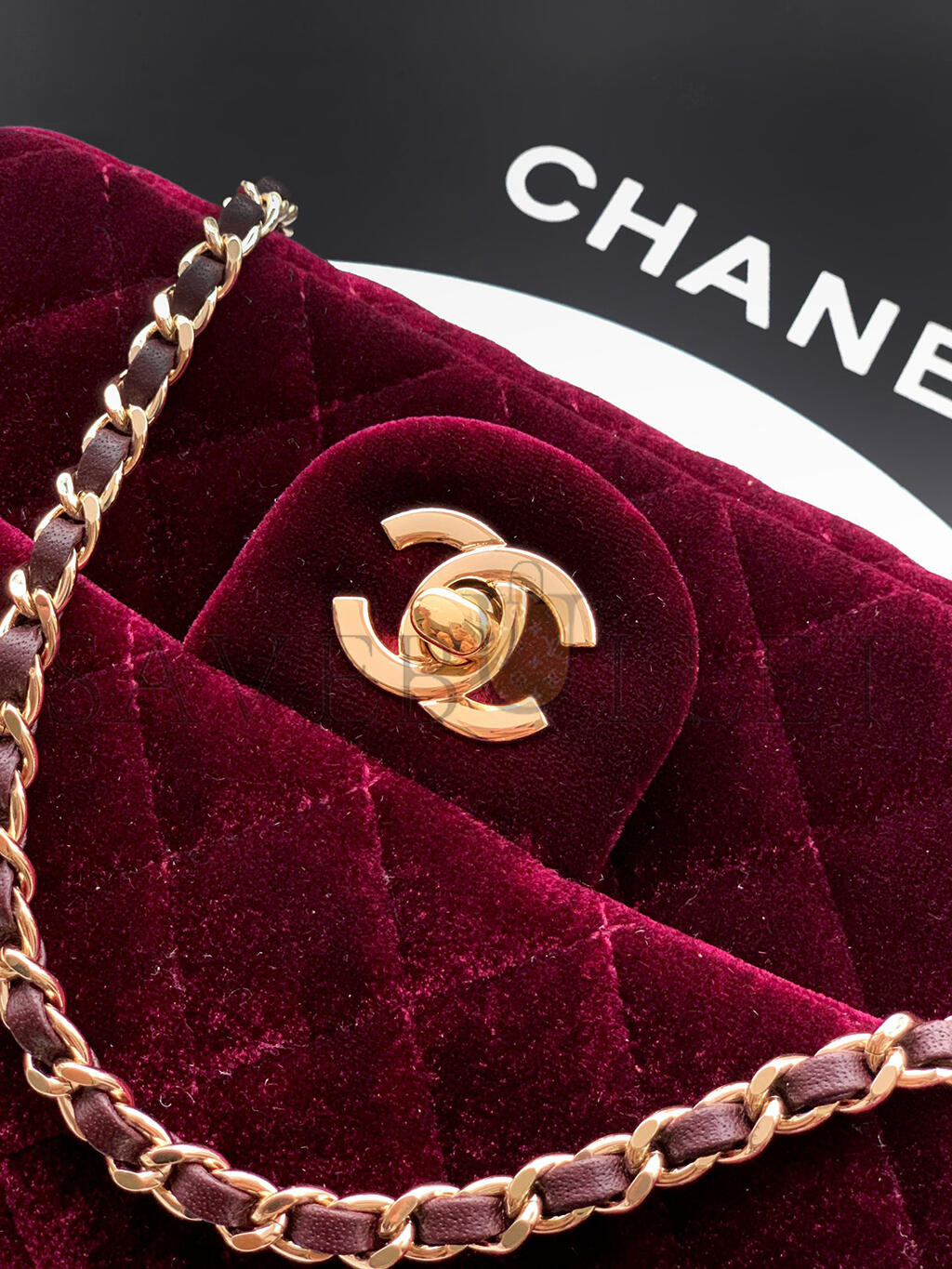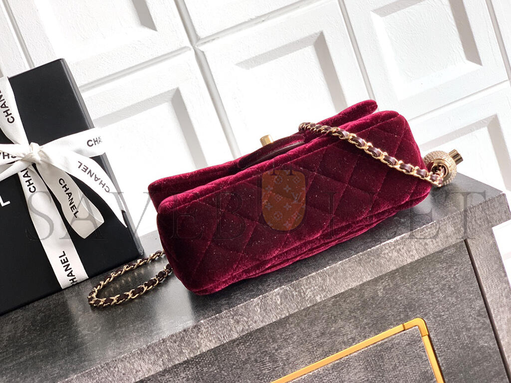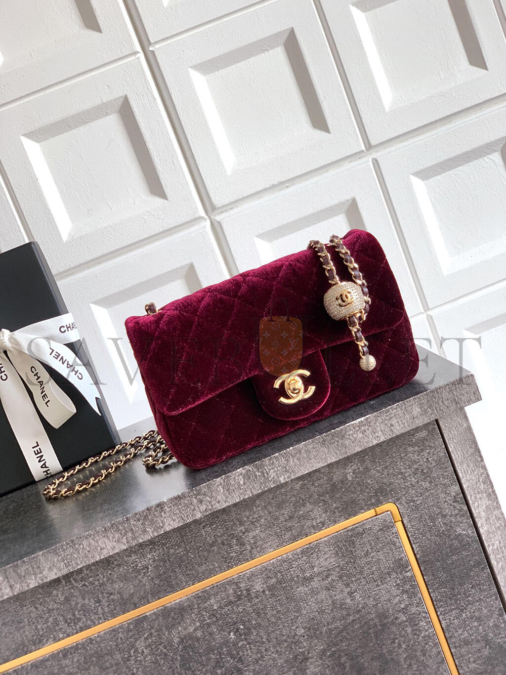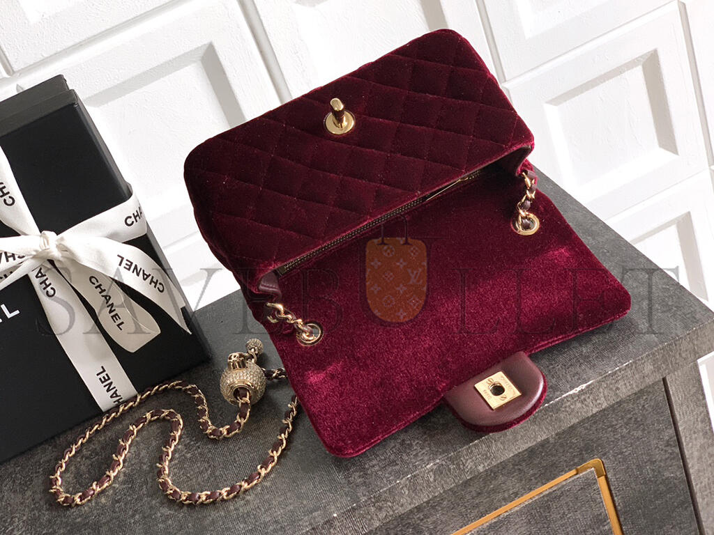 CHANEL MINI FLAP BAG VELVET, DIAMANT & GOLD-TONE METAL BURGUNDY AS1787 (20*13*7cm)