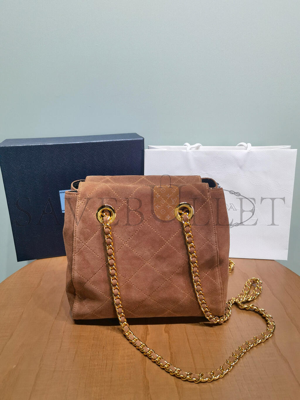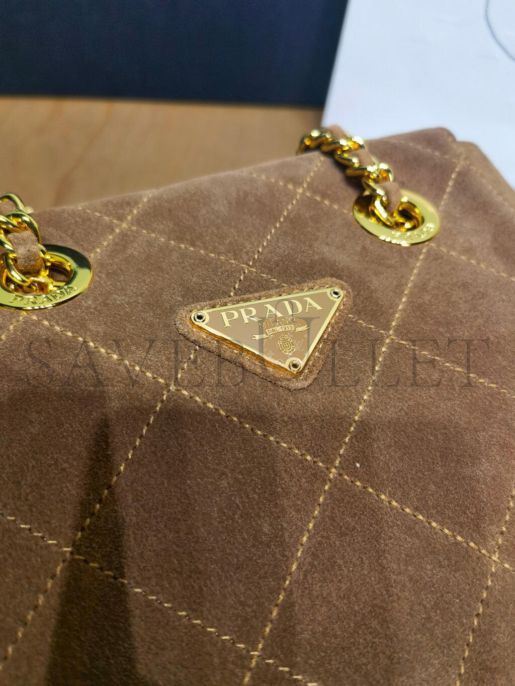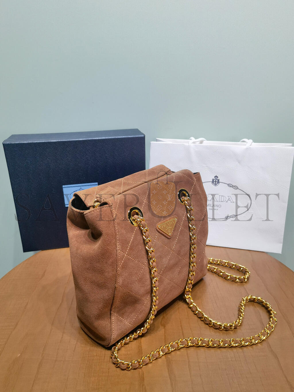 PRADA QUILTED BROWN SUEDE CHAIN SHOULDER BAG 1BD602 (27*24*6cm)