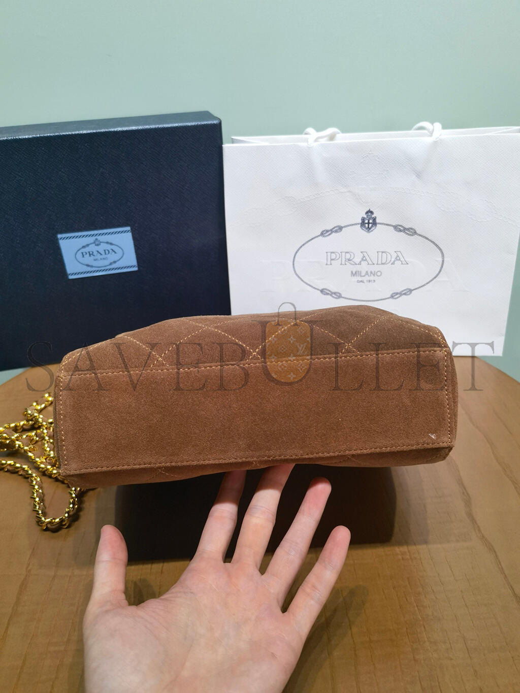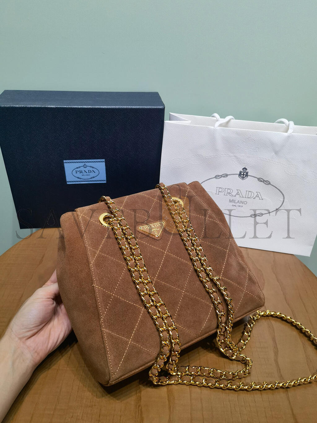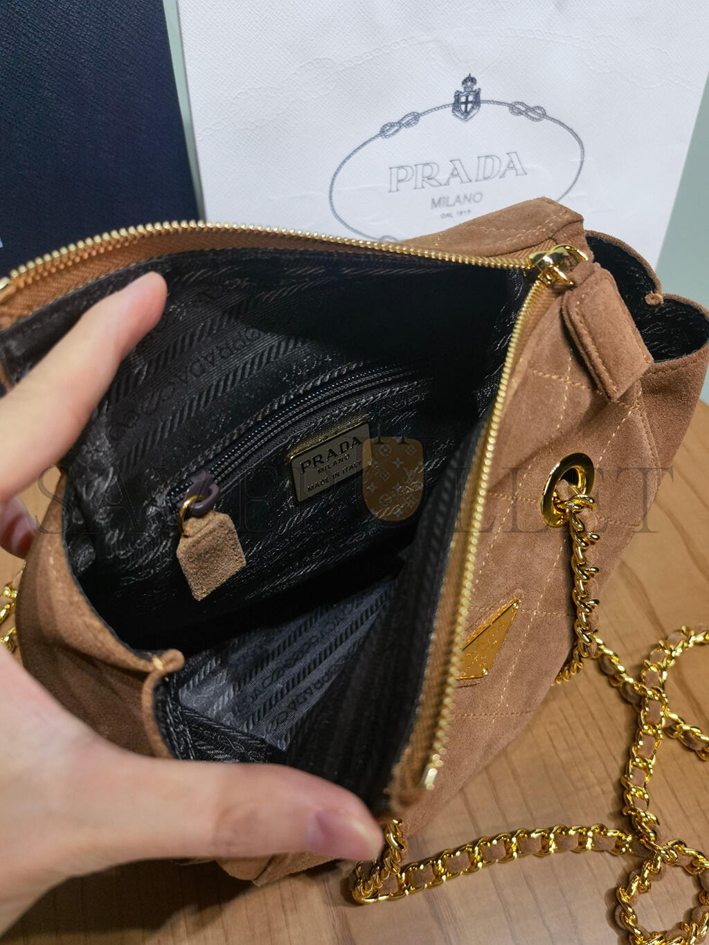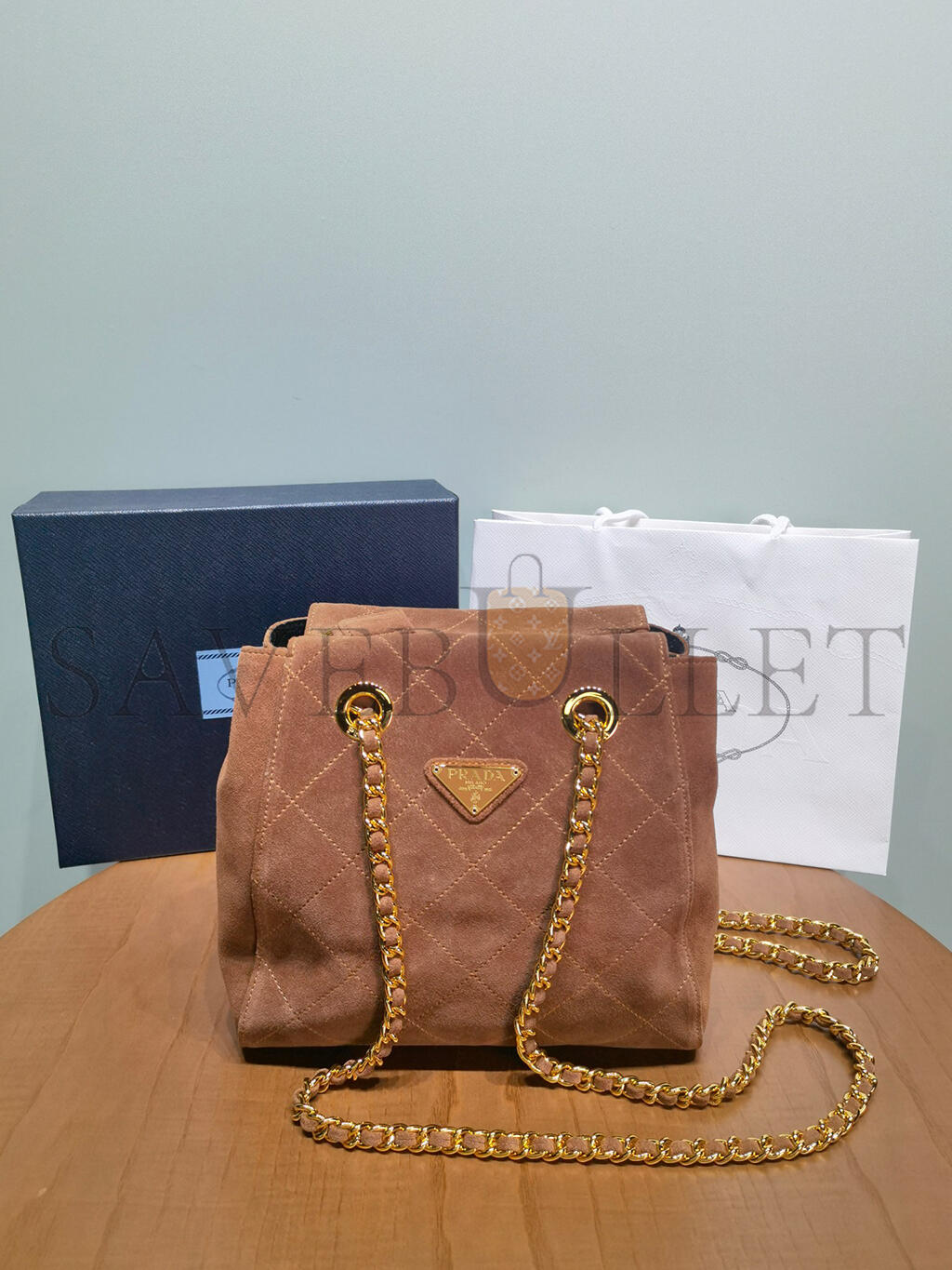PRADA QUILTED BROWN SUEDE CHAIN SHOULDER BAG 1BD602 (27*24*6cm)