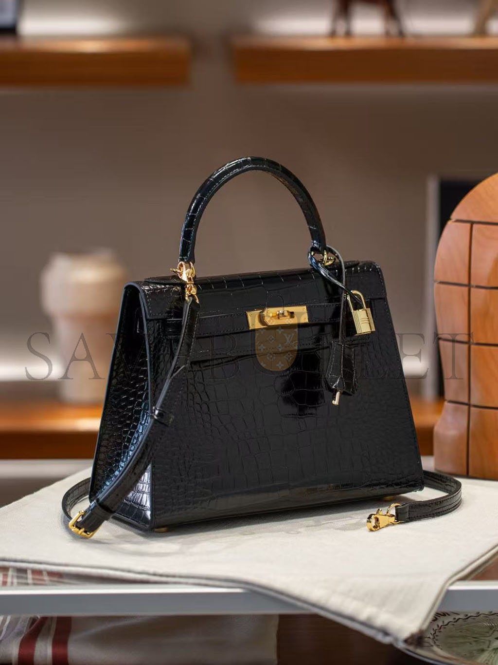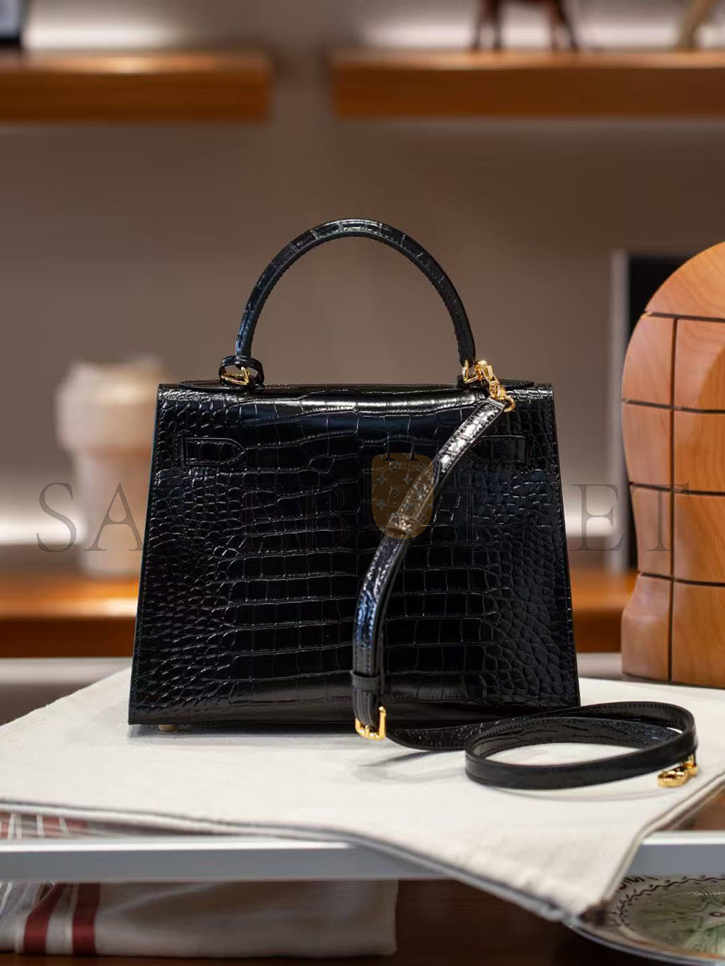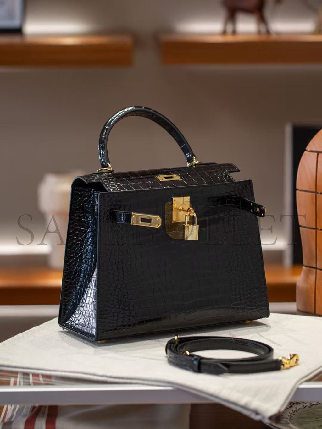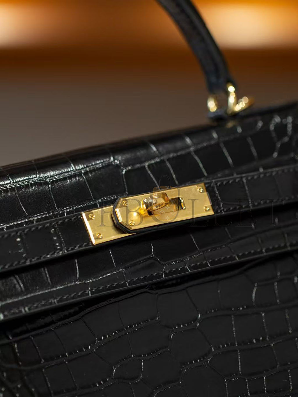 HERMÈS BLACK SHINY NILOTICUS CROCODILE SELLIER KELLY 32 GOLD HARDWARE (32*23*11cm)
