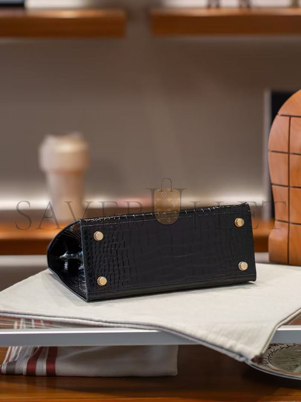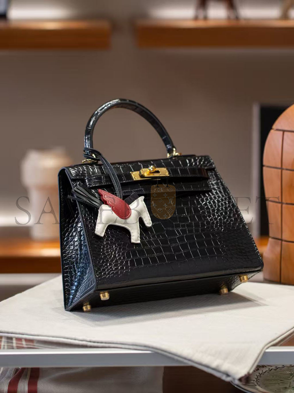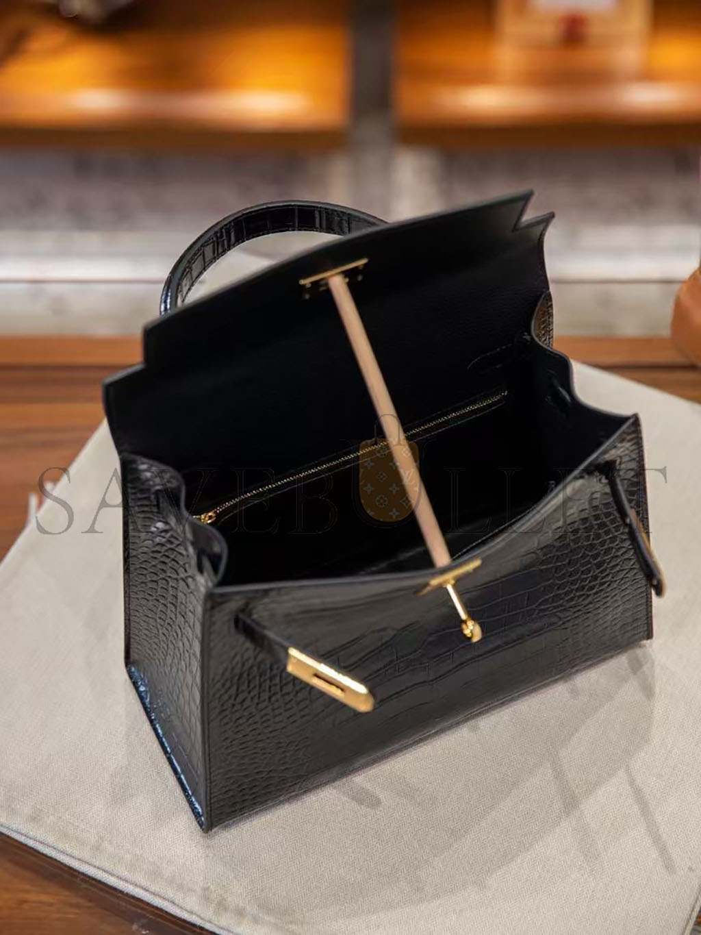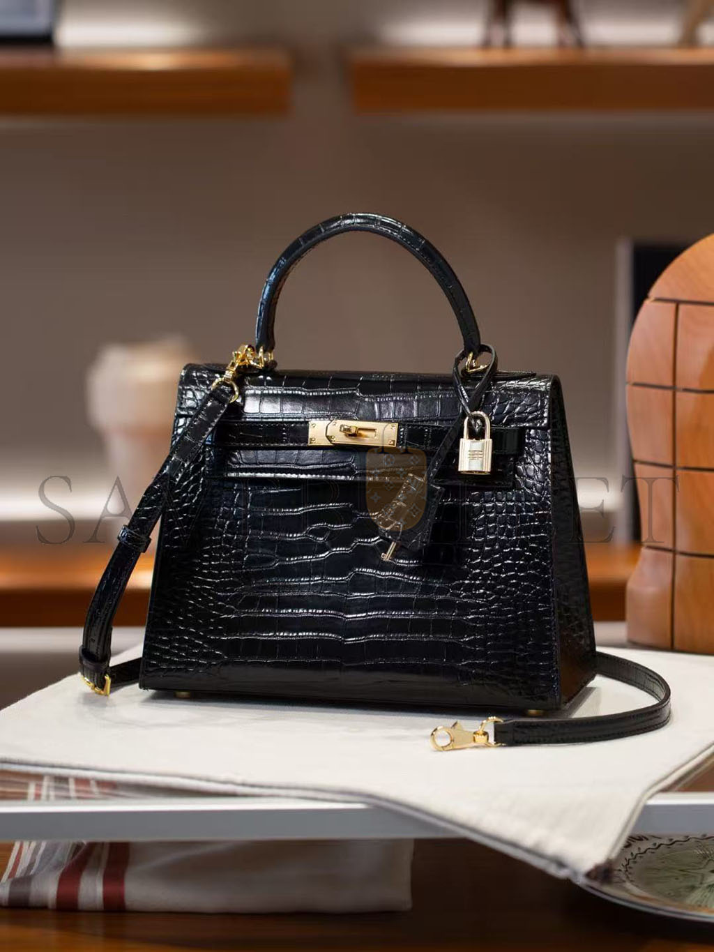 HERMÈS BLACK SHINY NILOTICUS CROCODILE SELLIER KELLY 32 GOLD HARDWARE (32*23*11cm)