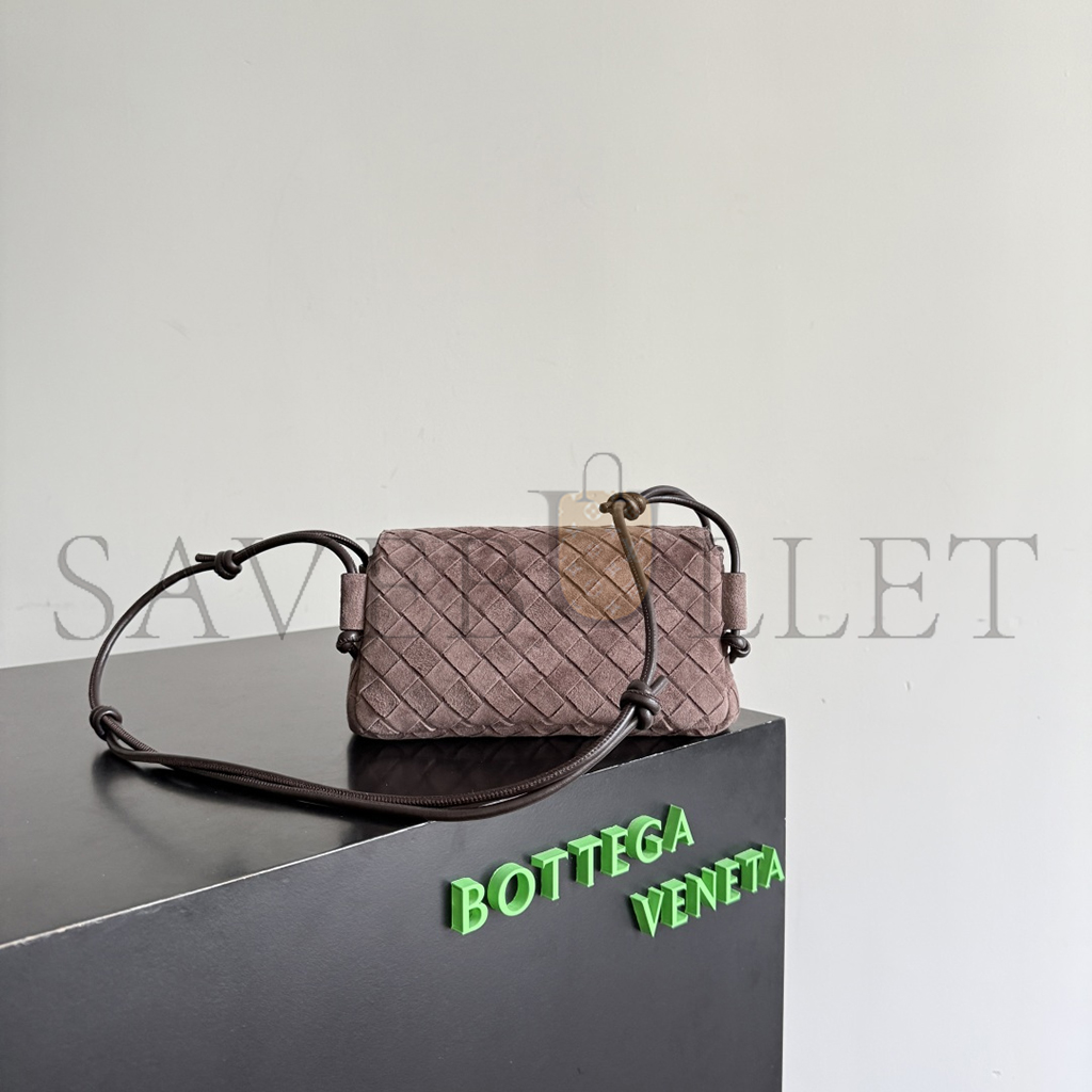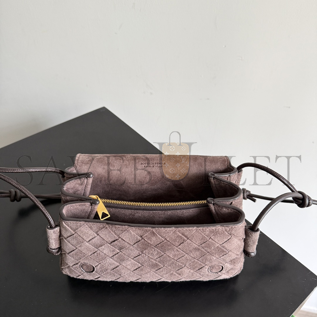 Pouch in Intrecciato suede with adjustable tubular strap featuring sliding knot details.