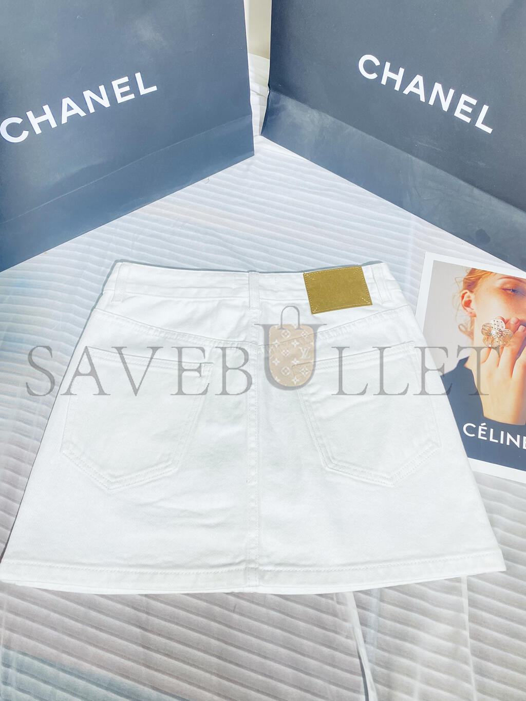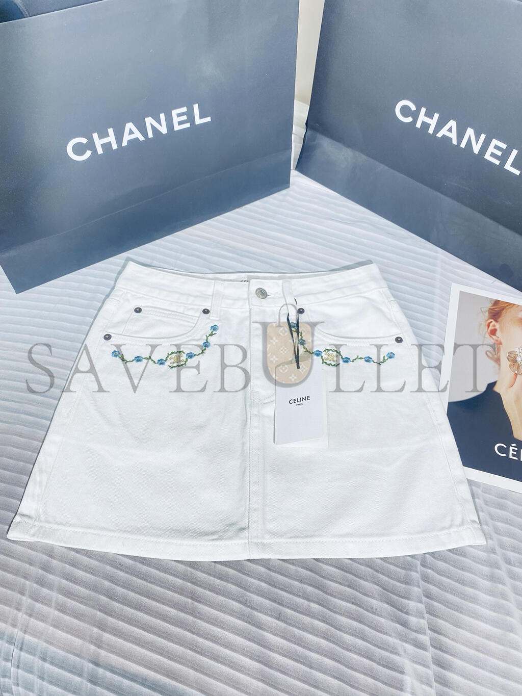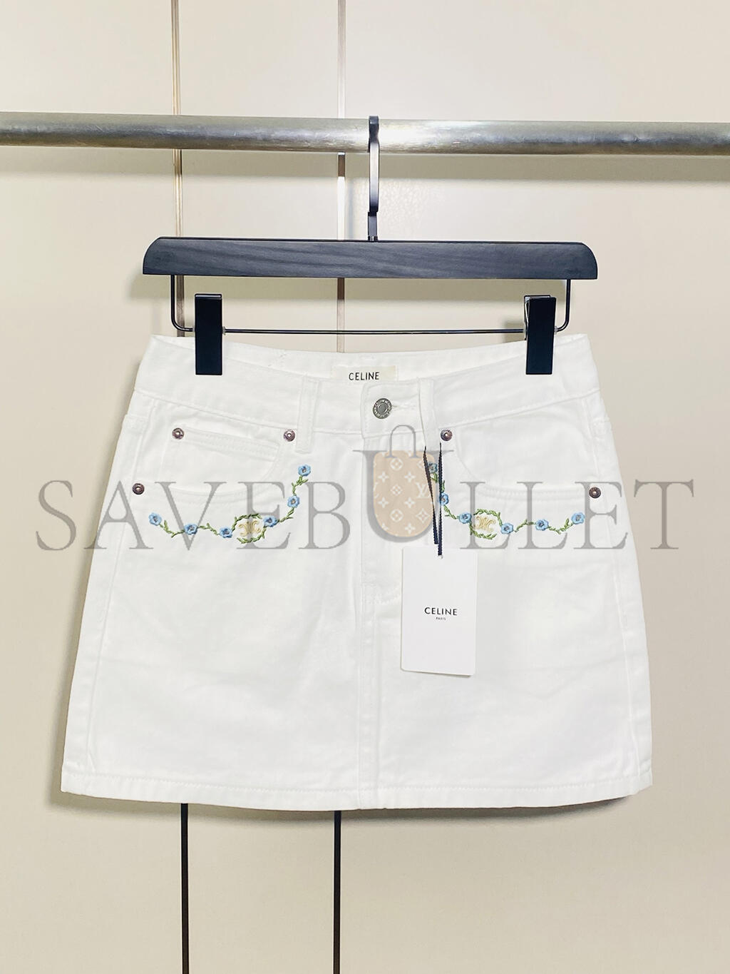 CELINE EMBROIDERED MINI SKIRT IN RAW WASH WHITE DENIM RJ031360W.07IA