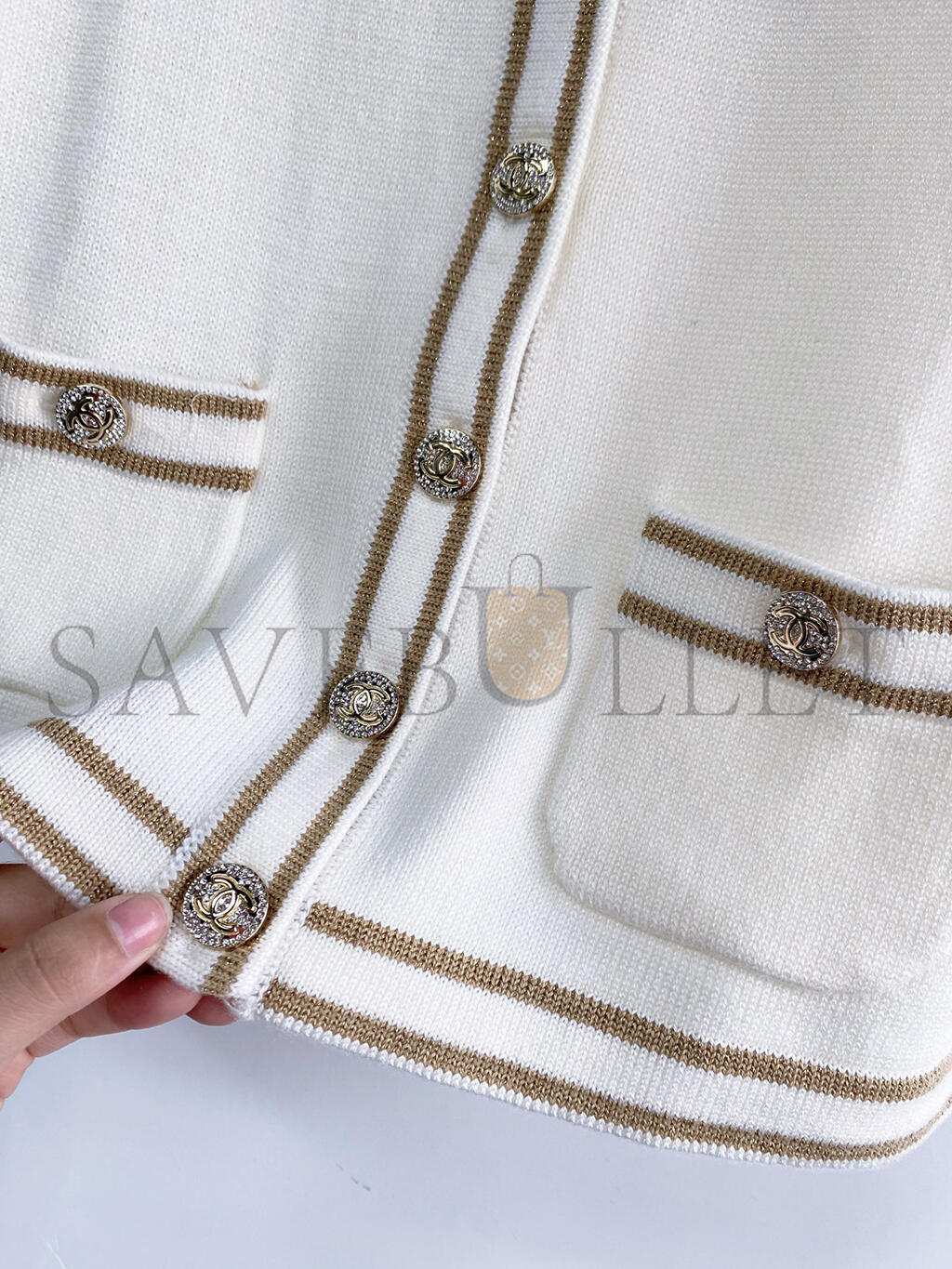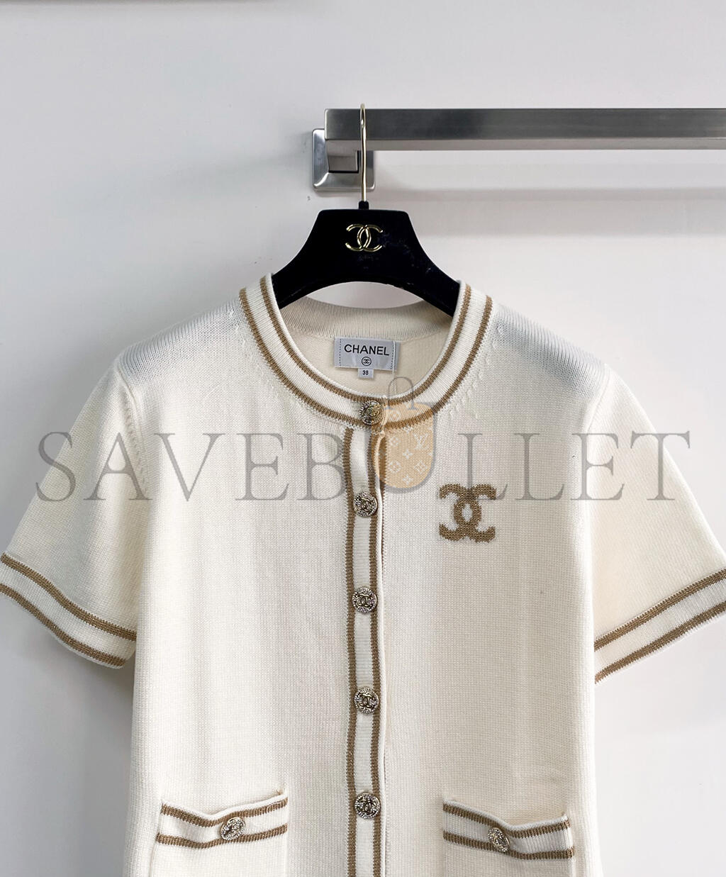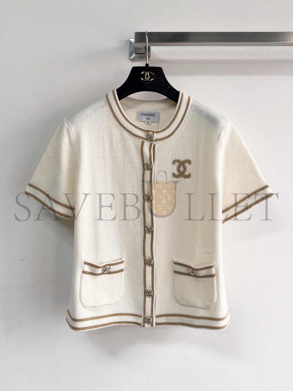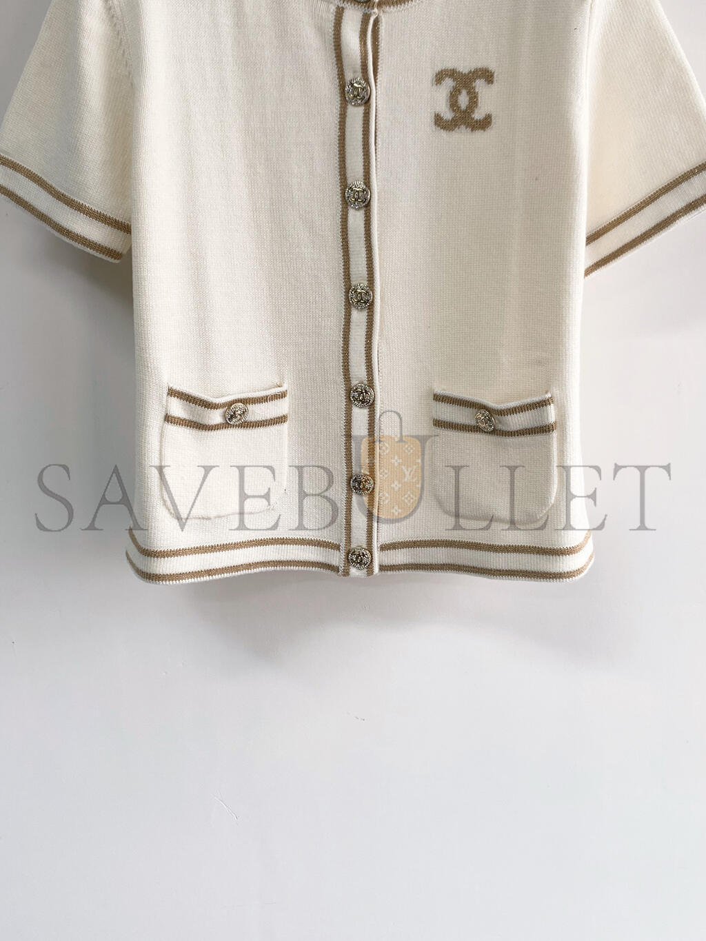 CHANEL STRIPED TRIMMED CREW NECK KNIT SHORT-SLEEVED TOP