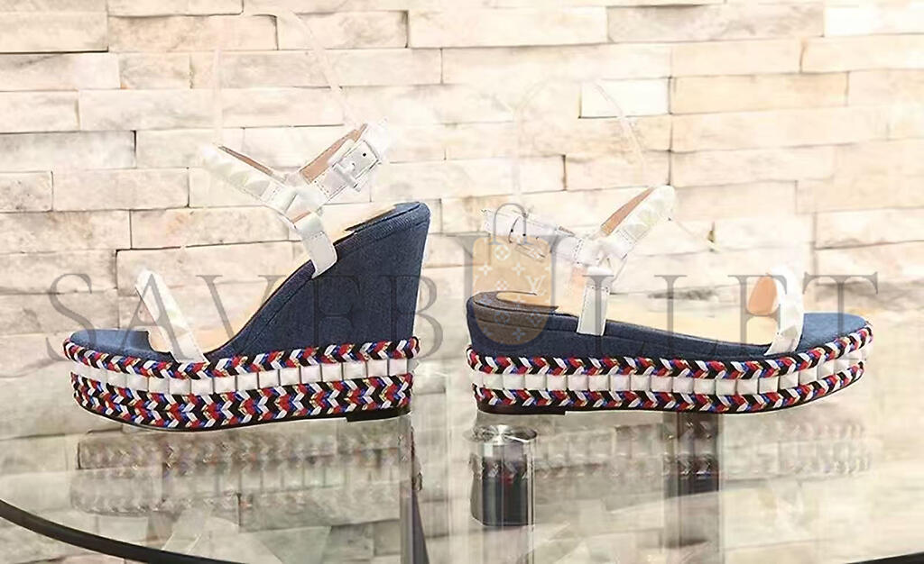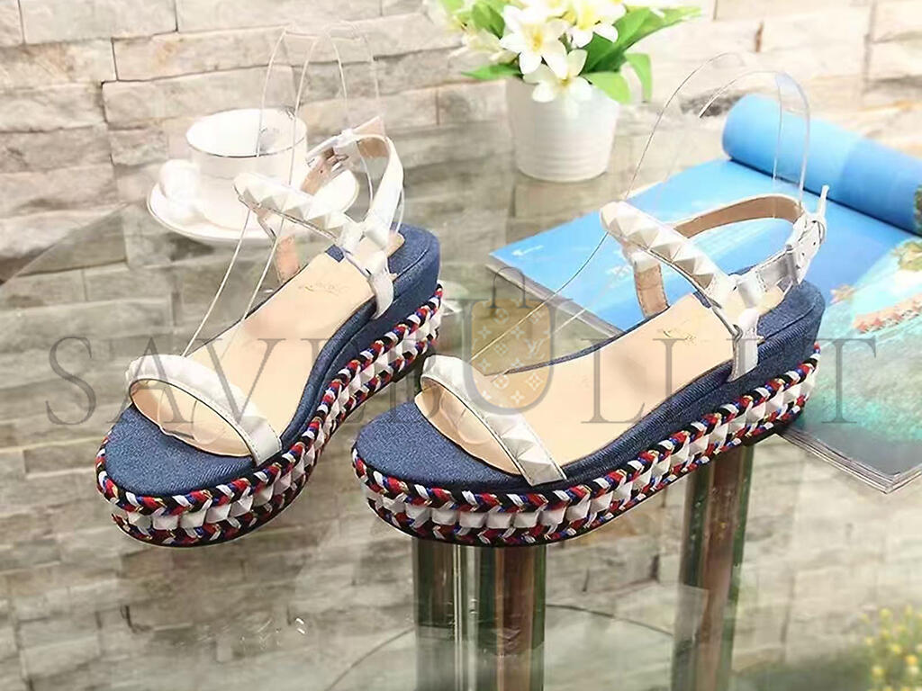 CHRISTIAN LOUBOUTIN CATACLOU DENIM PATCHWORK STUDDED WEDGE SANDALS
