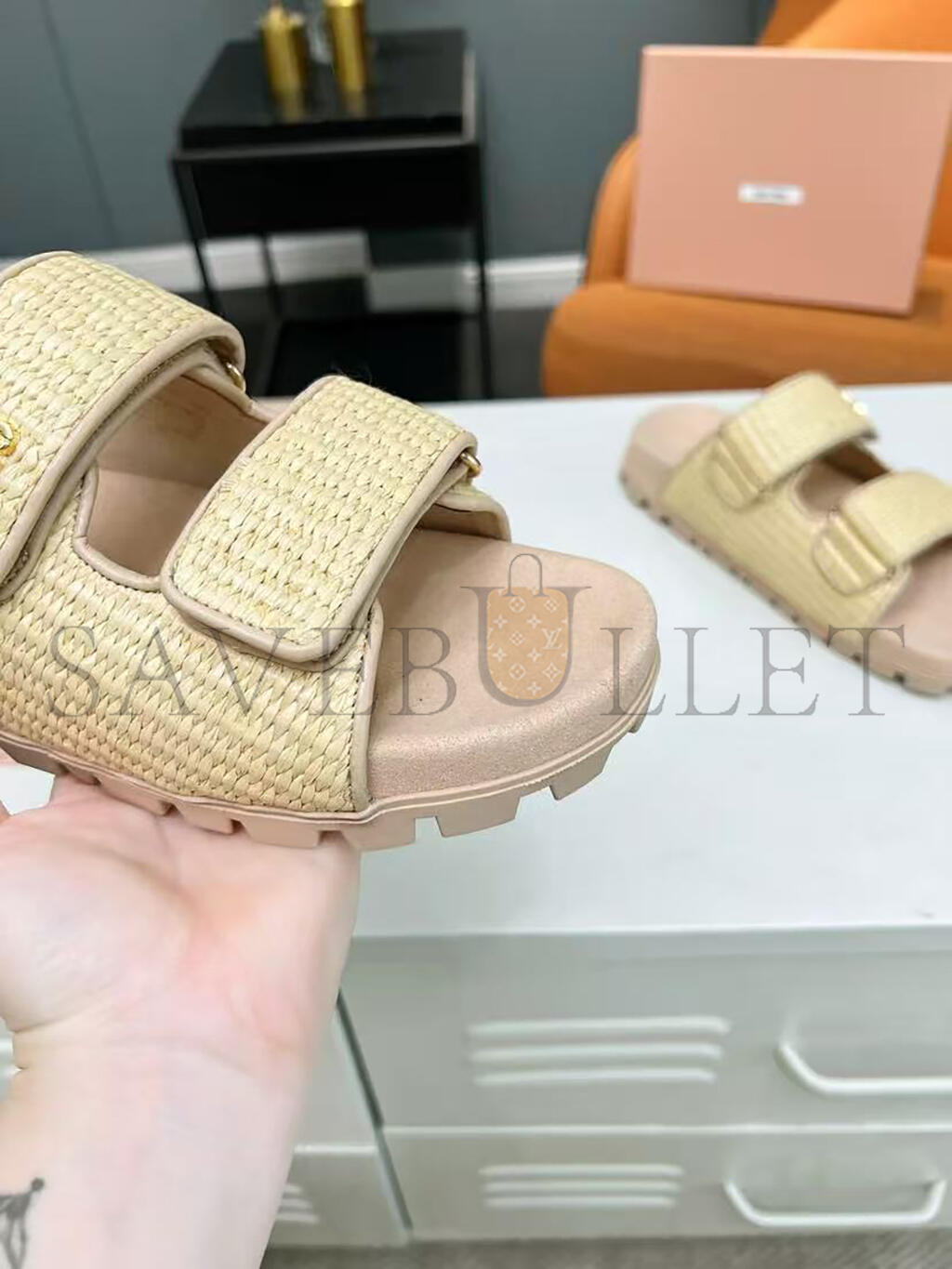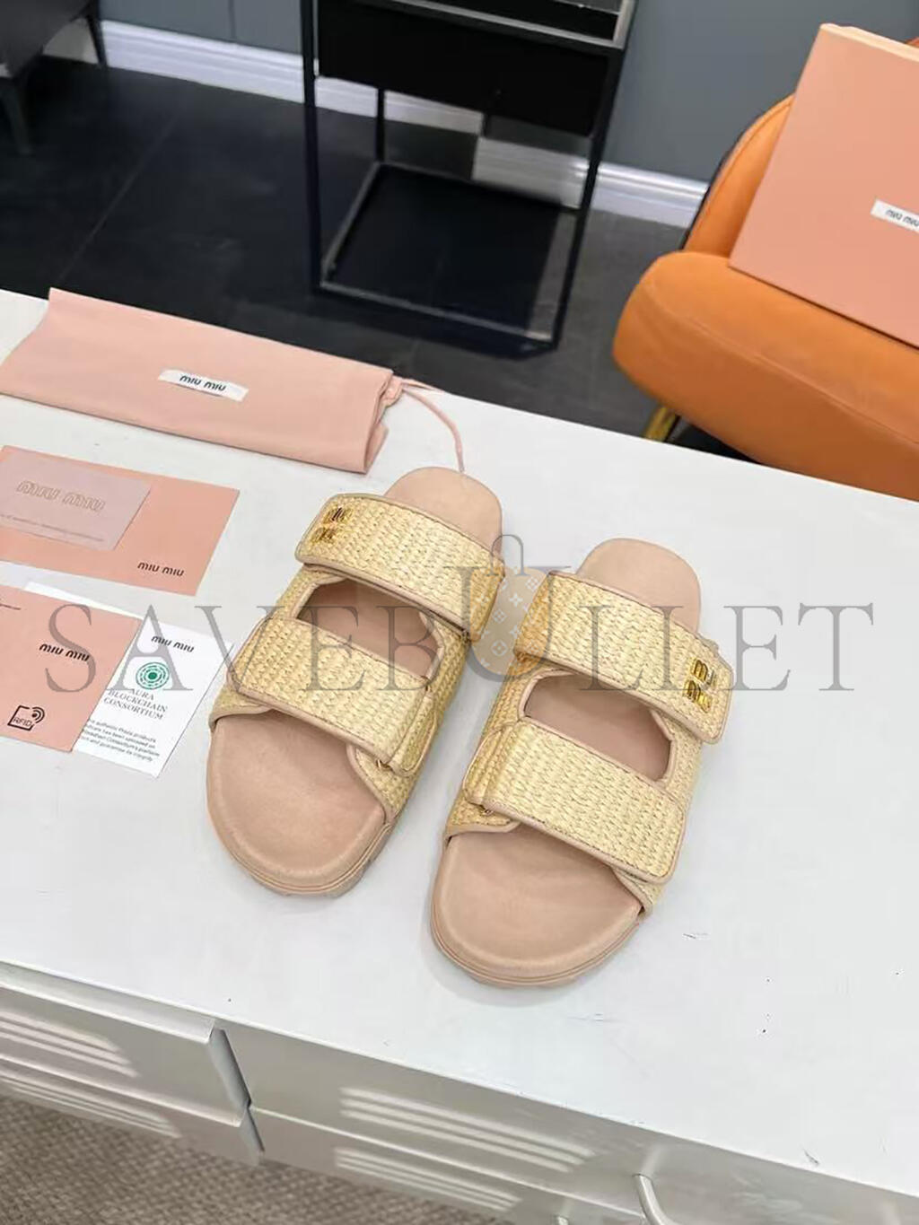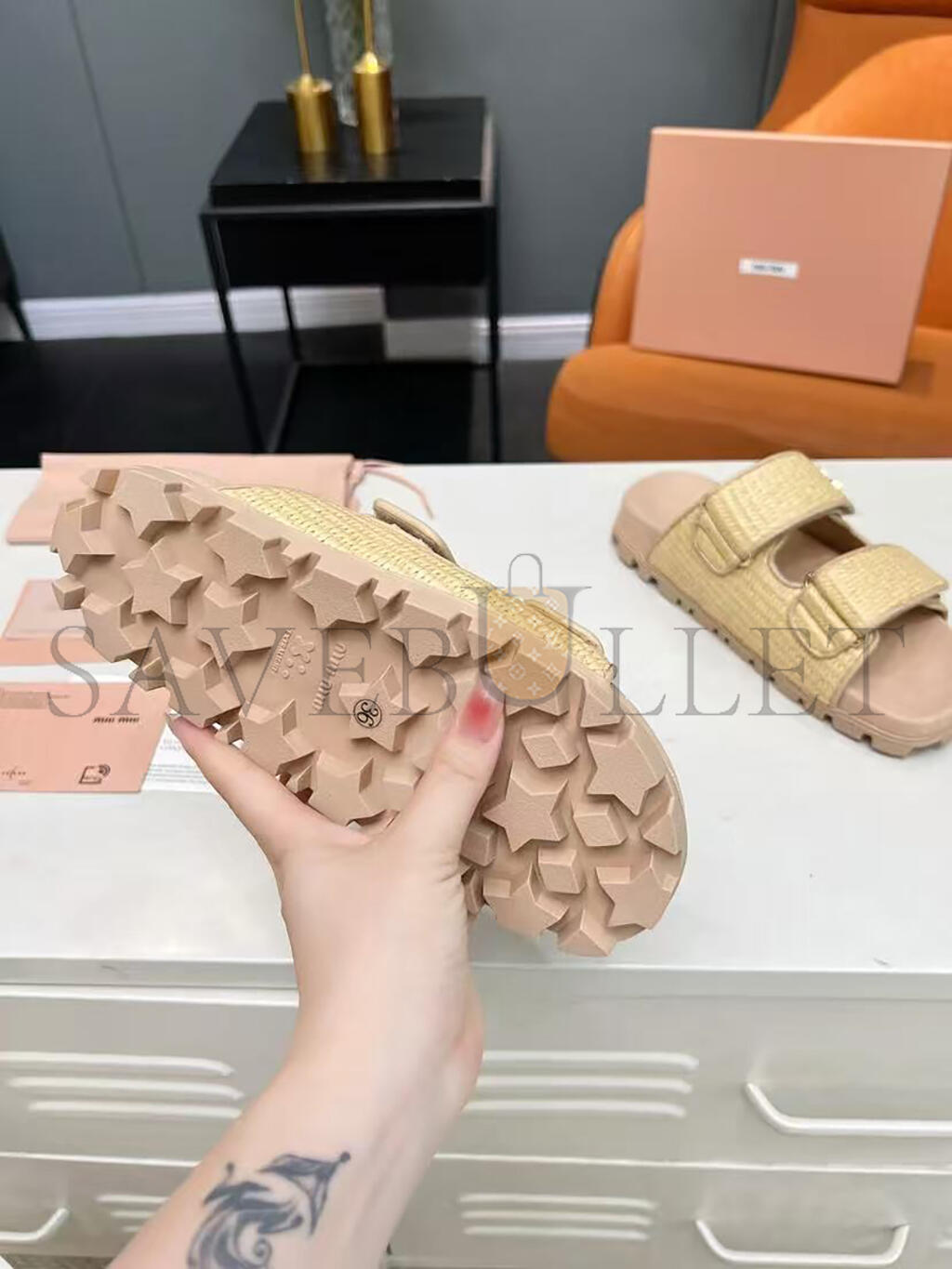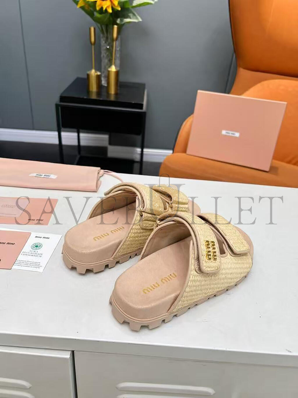 MIU MIU RAFFIA-EFFECT WOVEN FABRIC SLIDES 5XX636