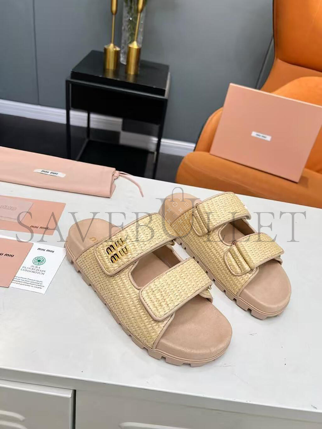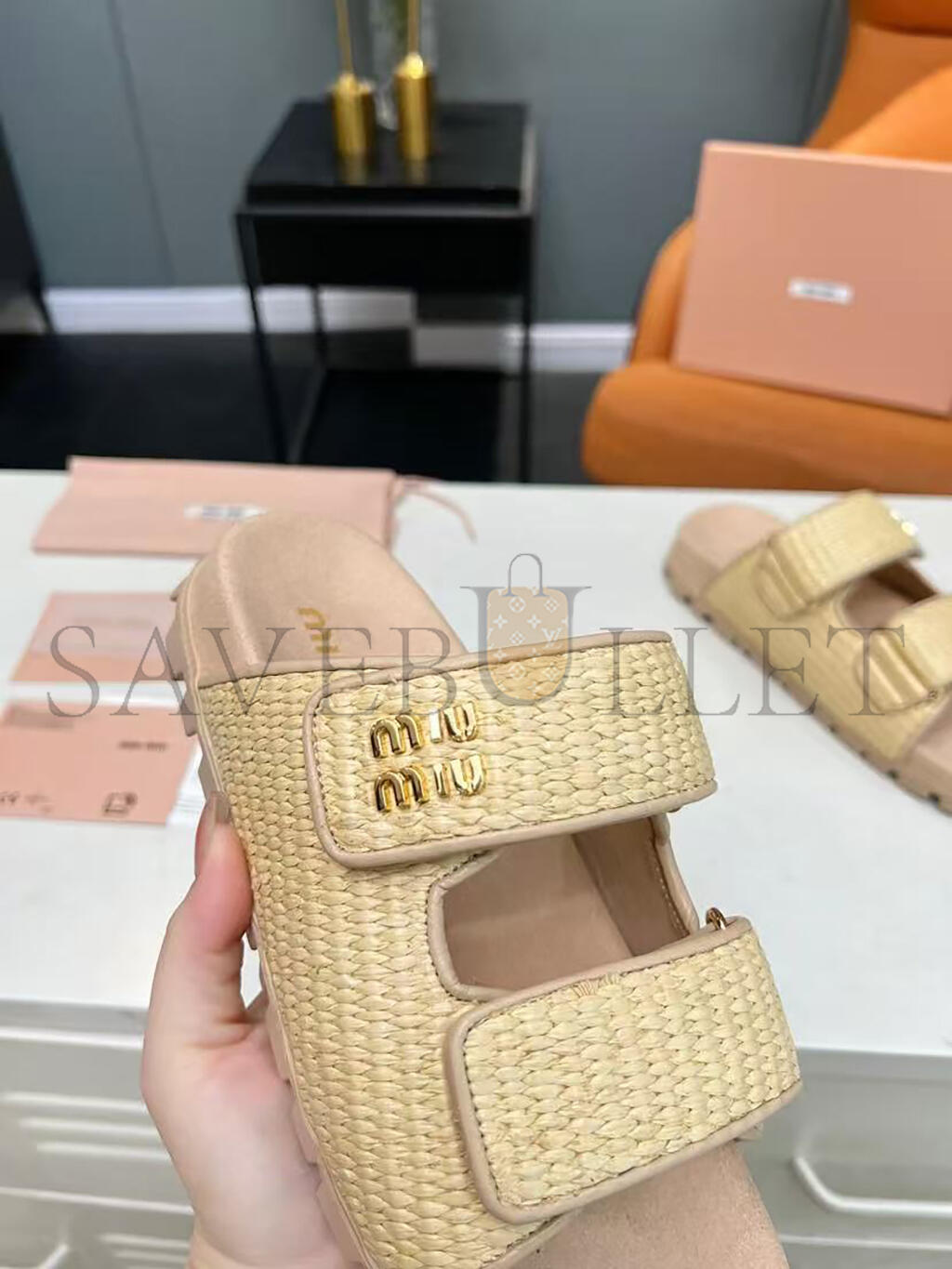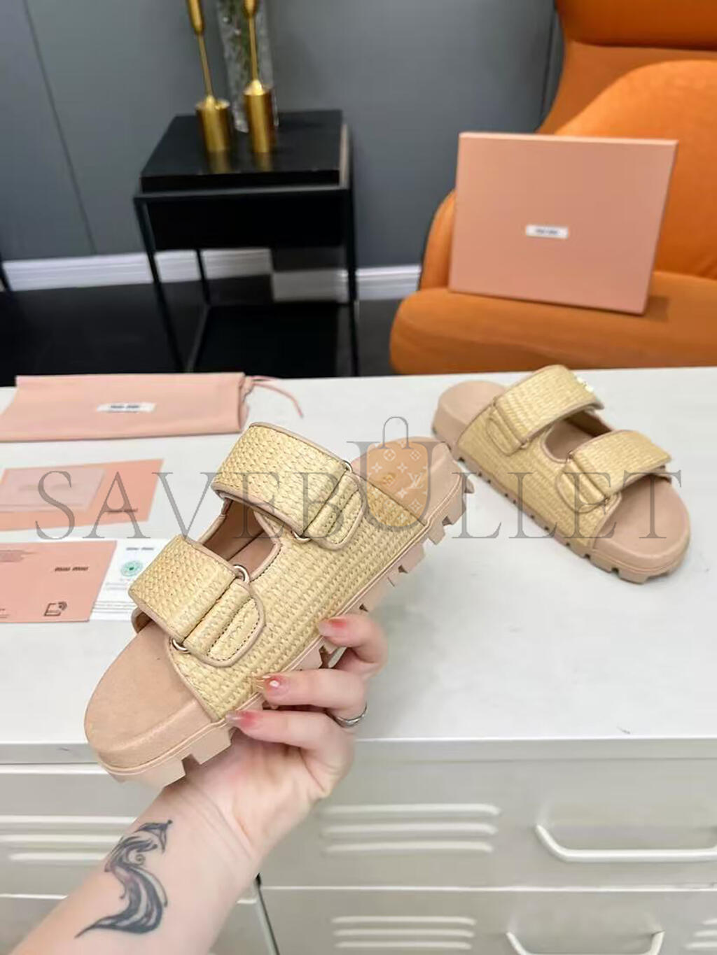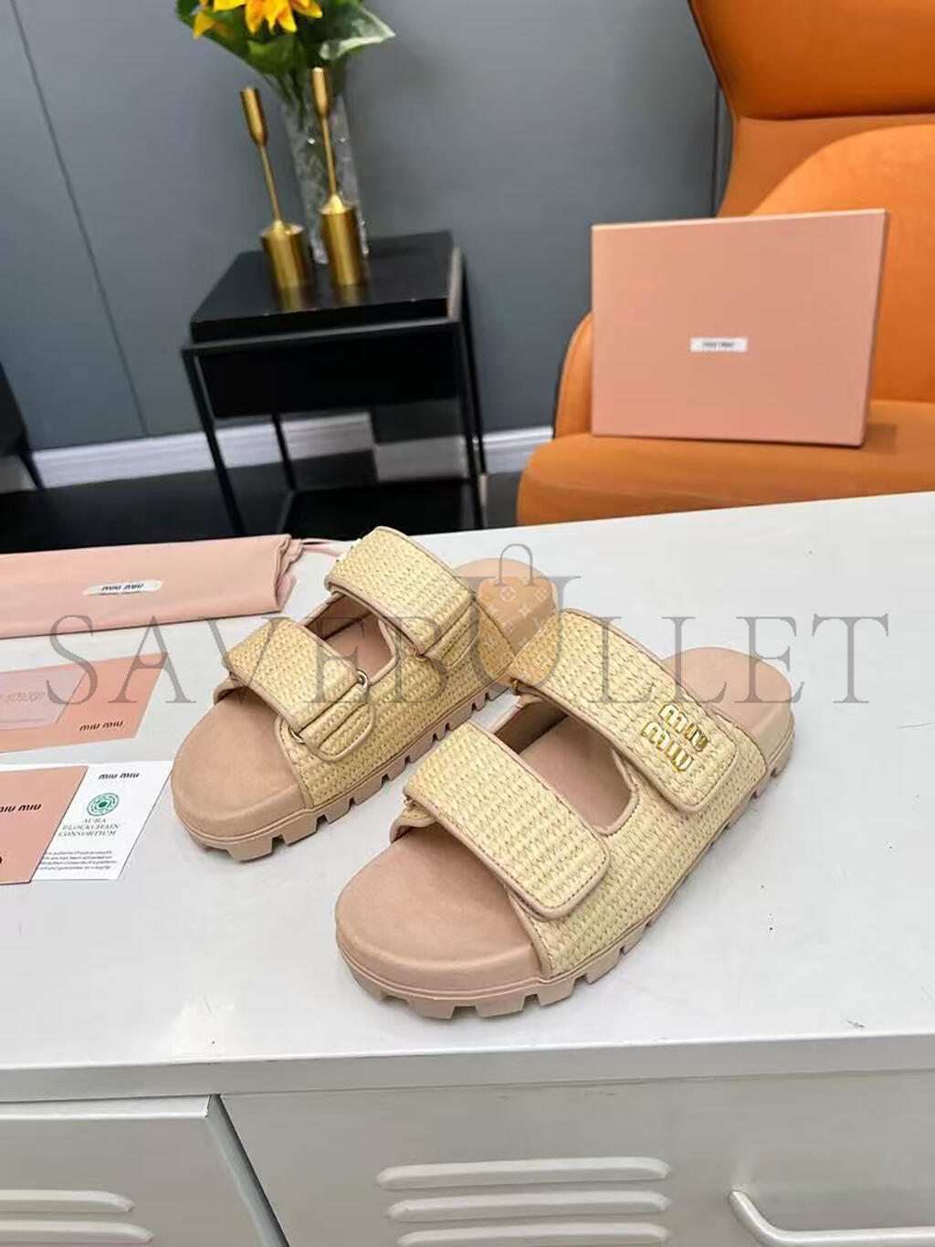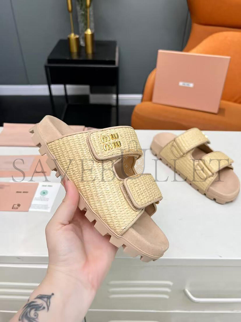 MIU MIU RAFFIA-EFFECT WOVEN FABRIC SLIDES 5XX636