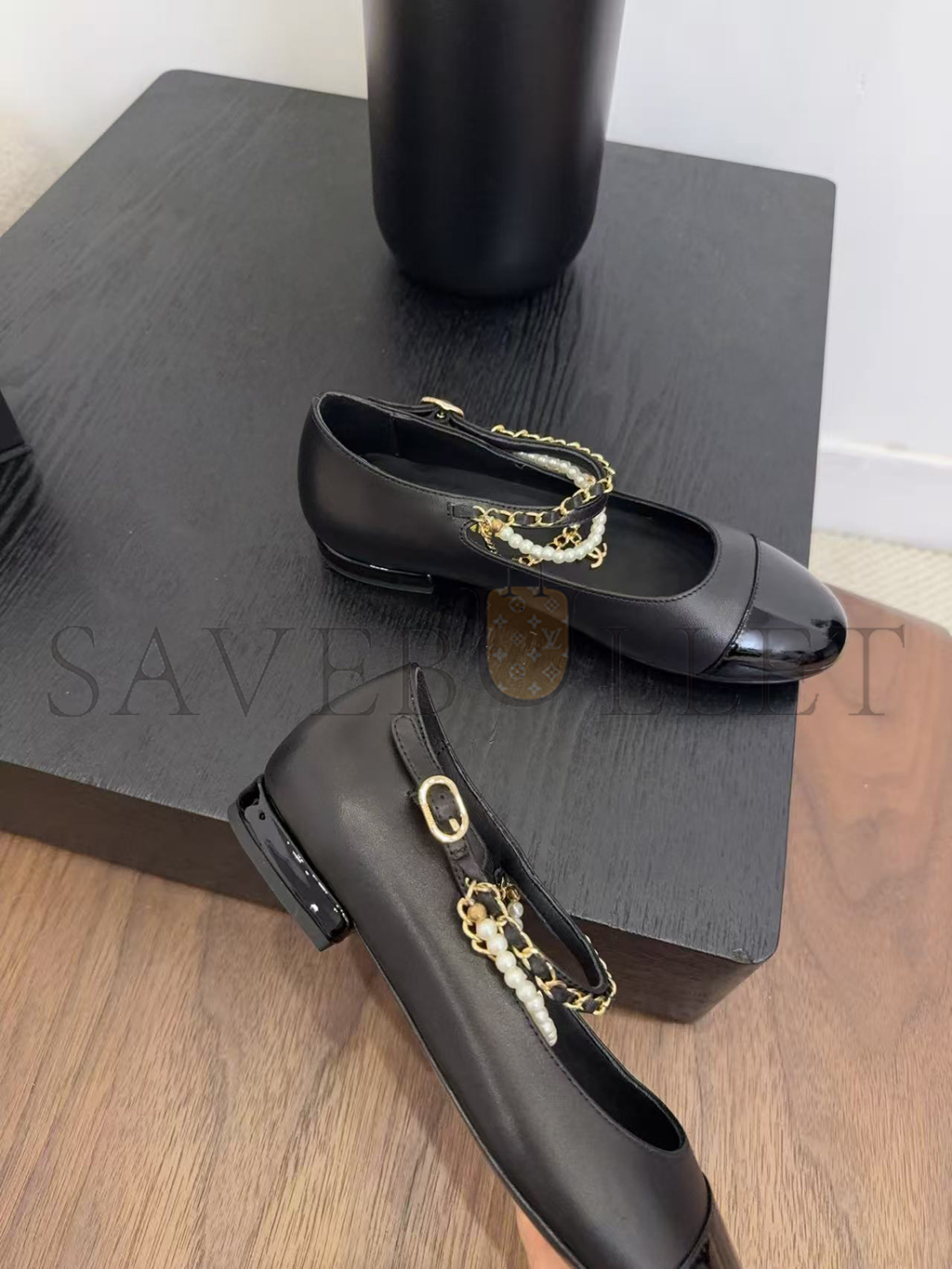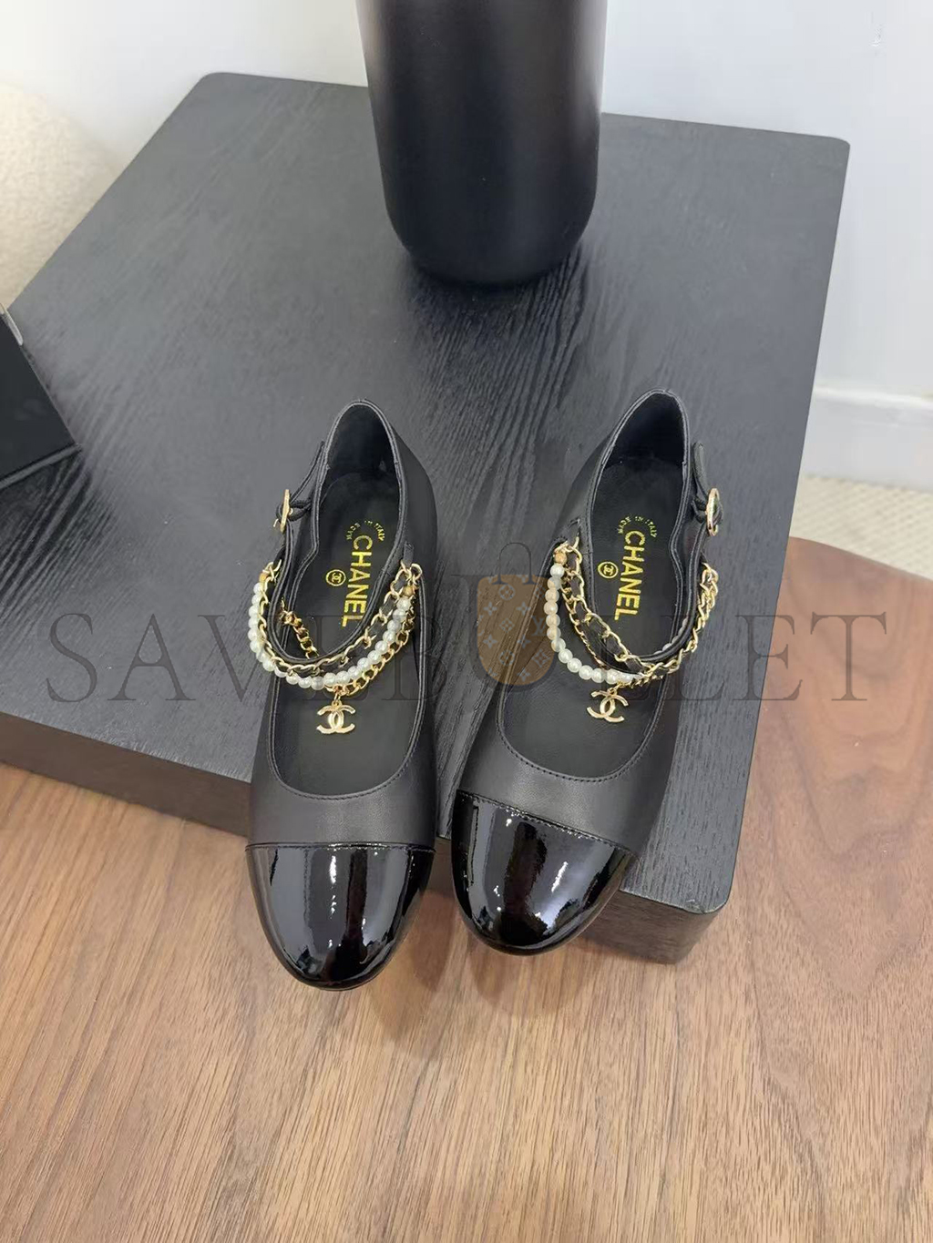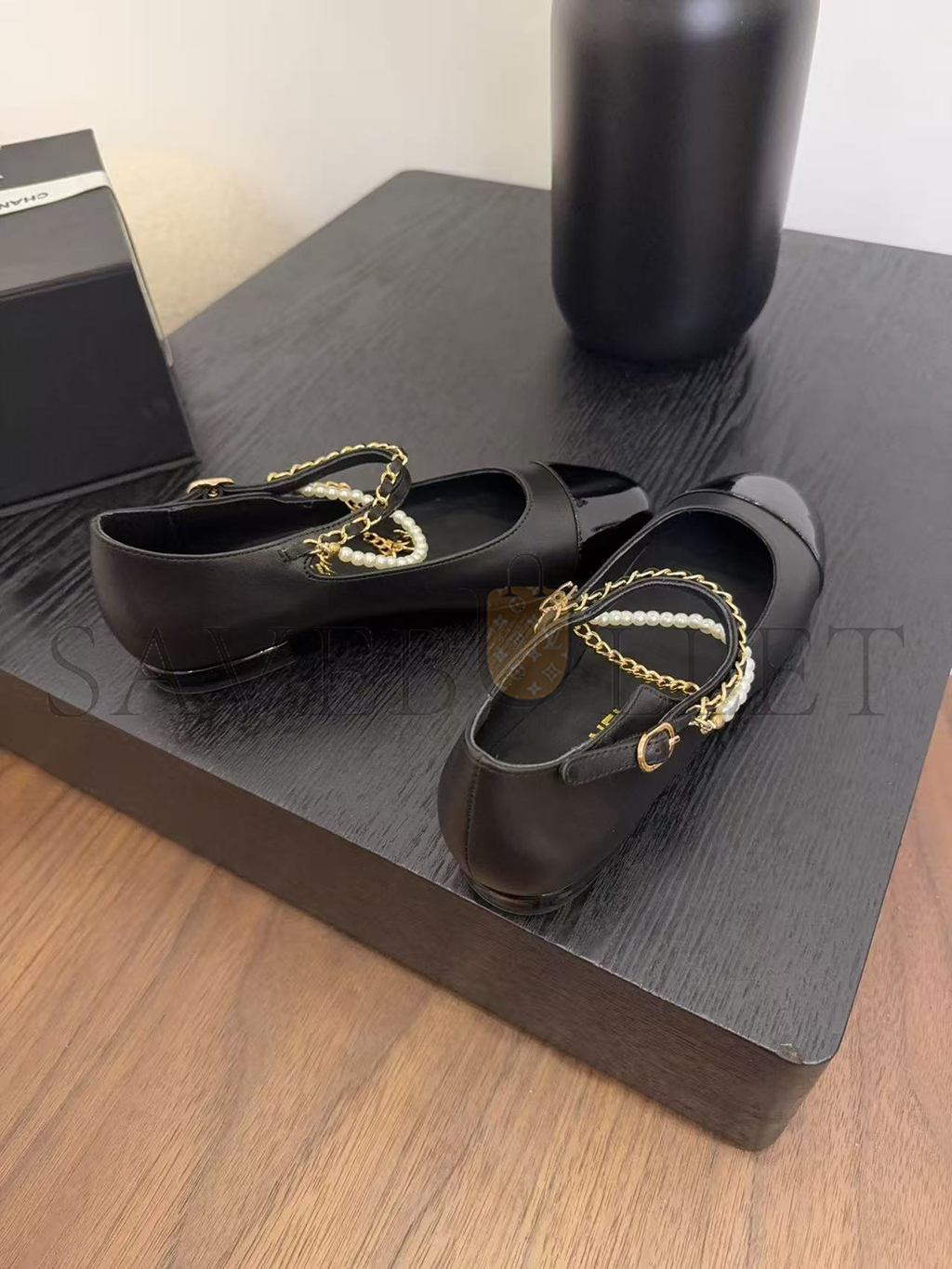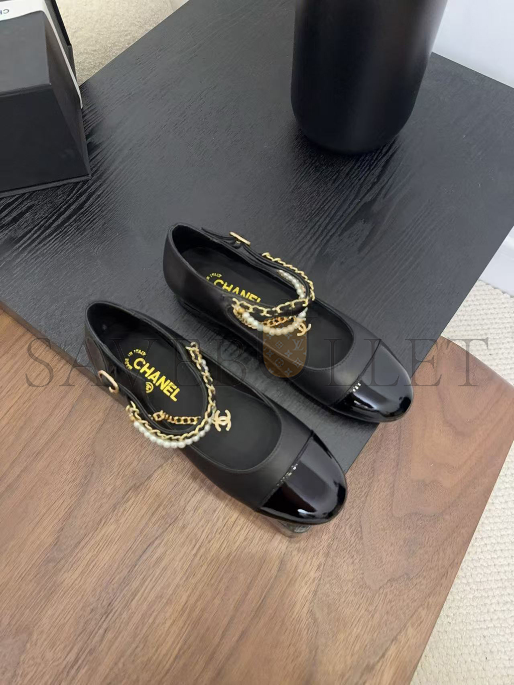 CHANEL MARY JANE PEARLS & METAL BLACK FLATS G46718