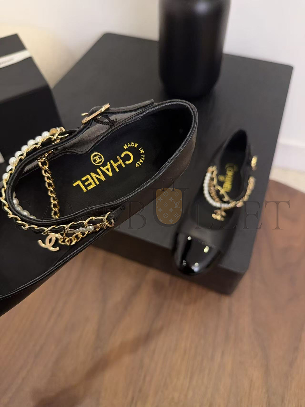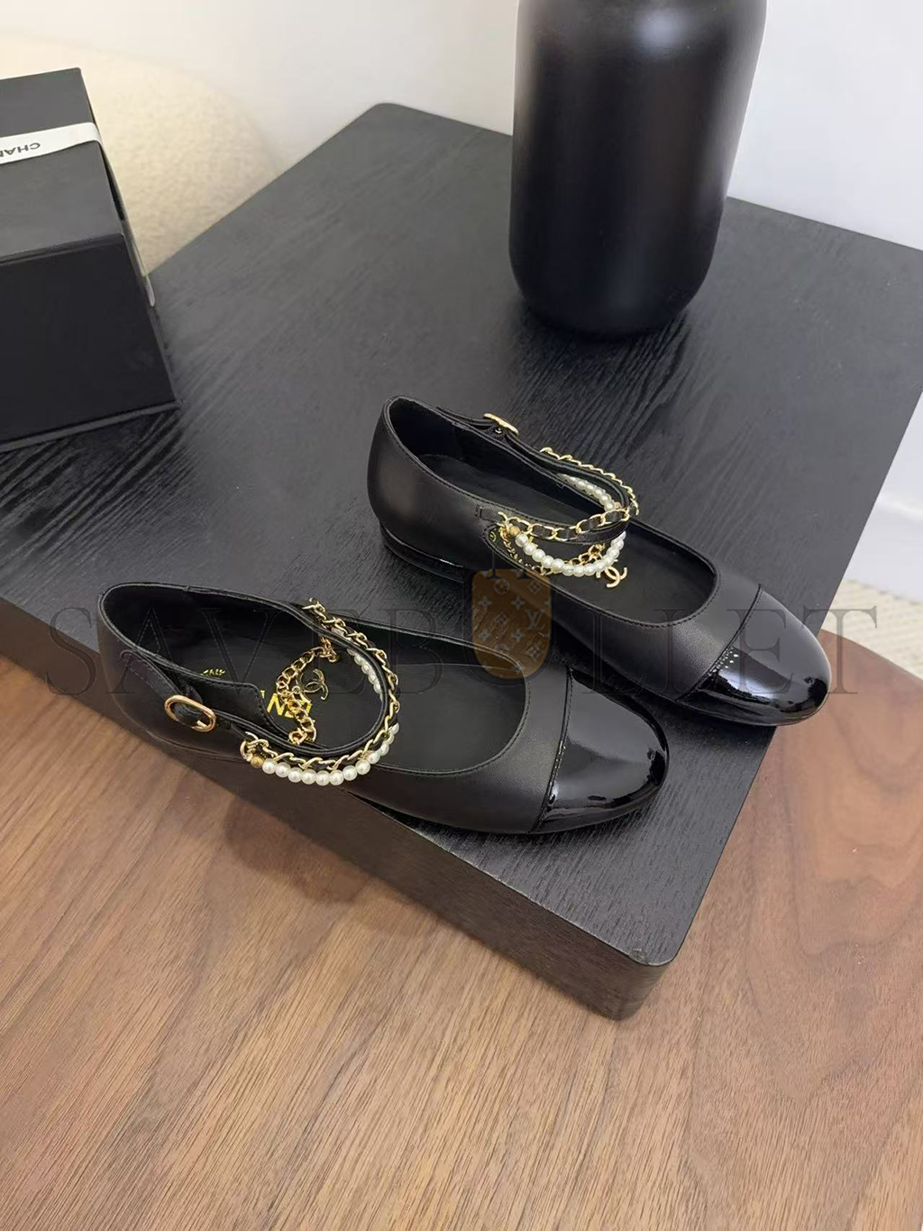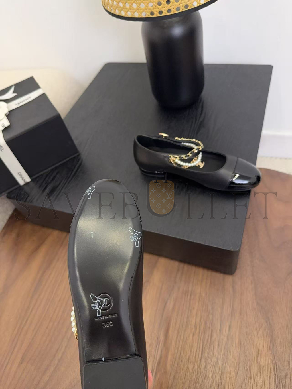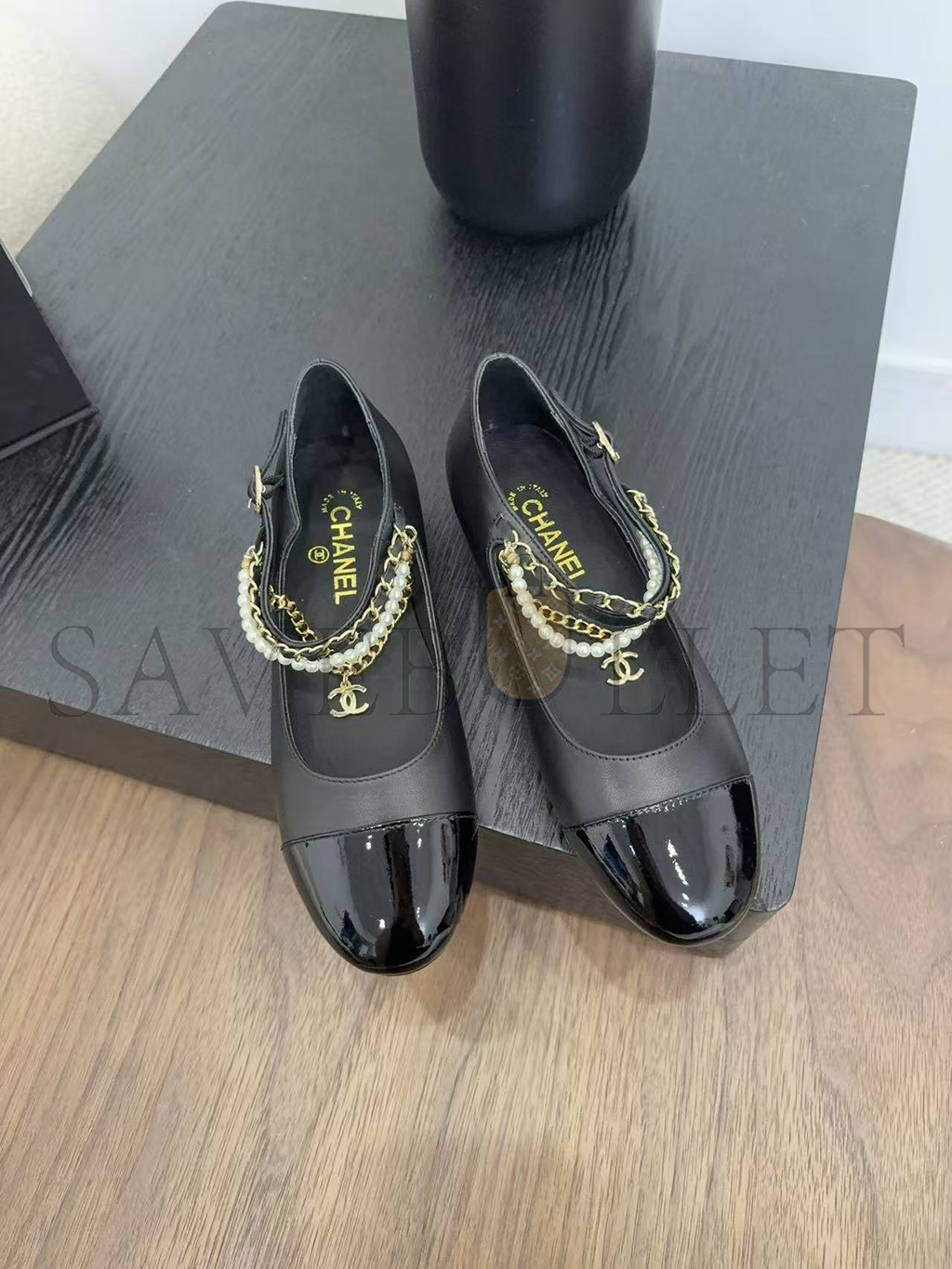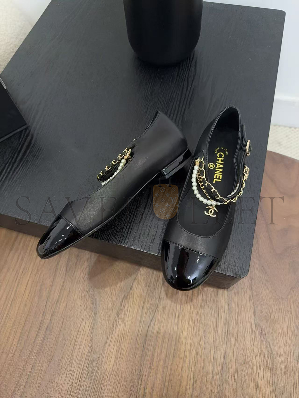 CHANEL MARY JANE PEARLS & METAL BLACK FLATS G46718