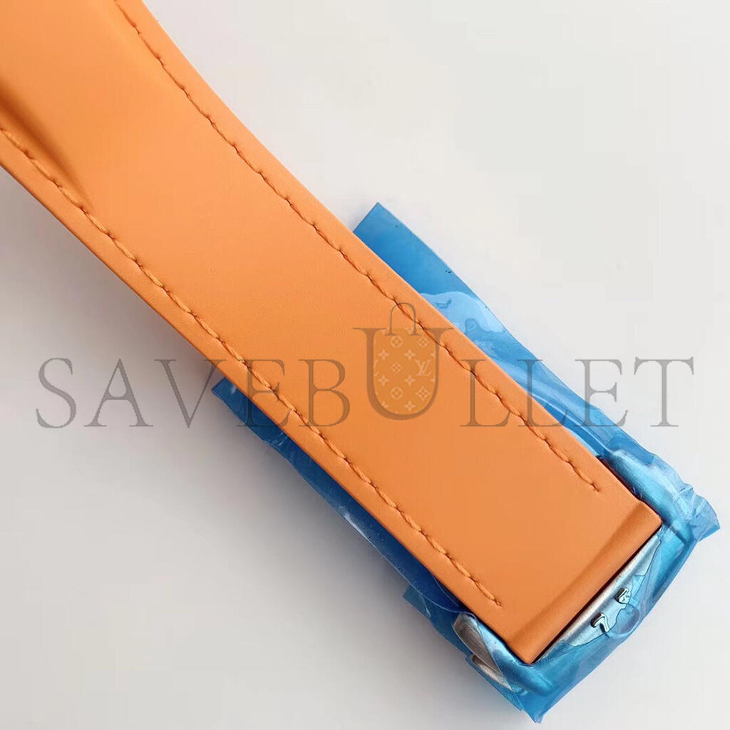 This model, with its scratch-resistant sapphire crystal, features a black dial with a date window at the 3 oclock position. The orange unidirectional rotating diversbezel is mounted on a 45.5 mm stainless steel case on an orange rubber strap.