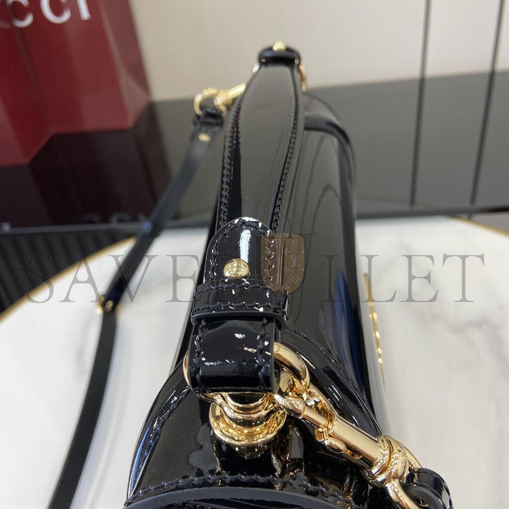Style 782849 AADHF 7541Orange patent leatherLight gold-toned hardwareLeather liningInterior: 1 zip pocket with Gucci Crest zip puller7.1" handle drop..