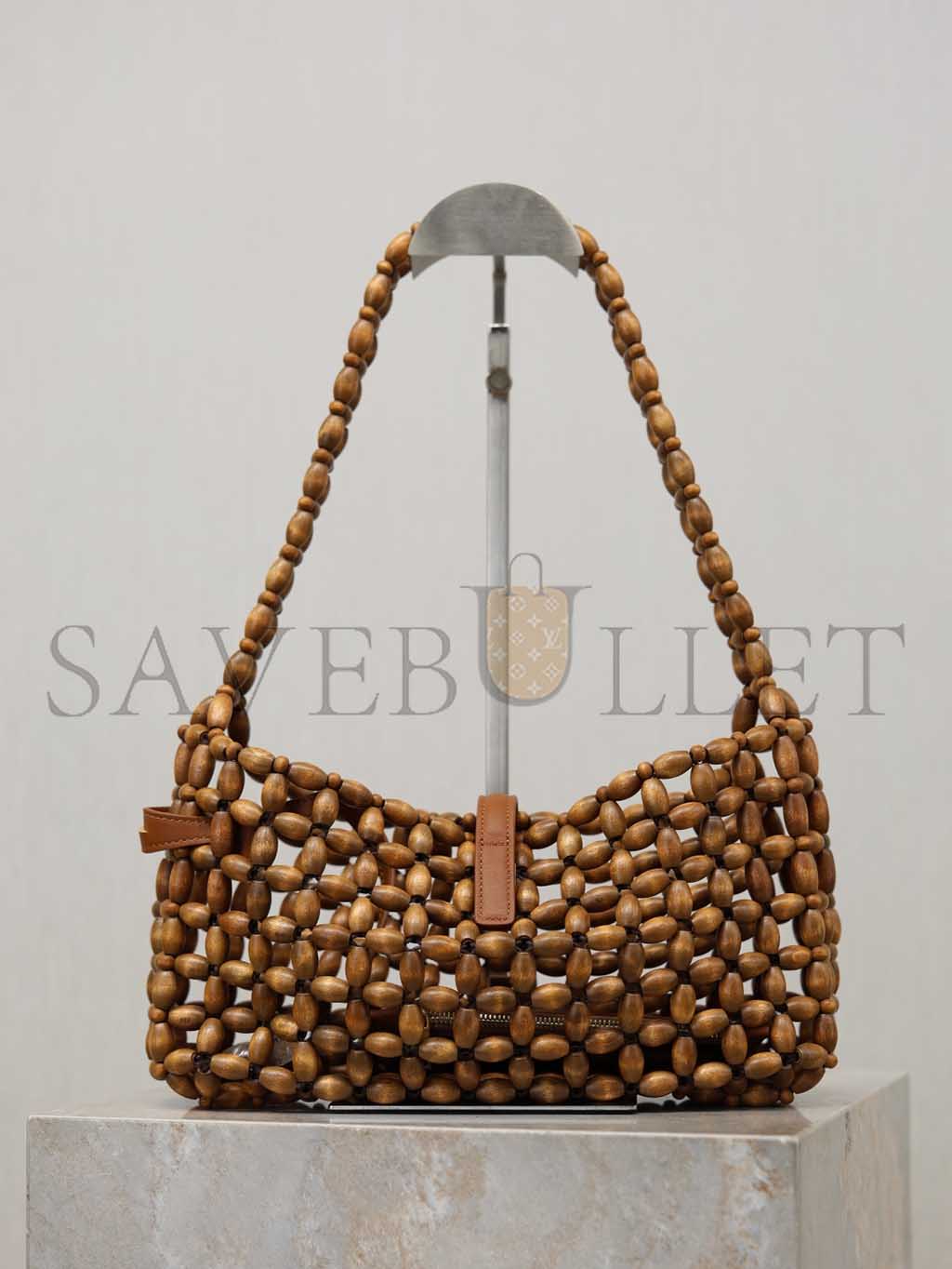 A wooden beaded shoulder bag with a leather buckle adorned with LE CASSANDRE.